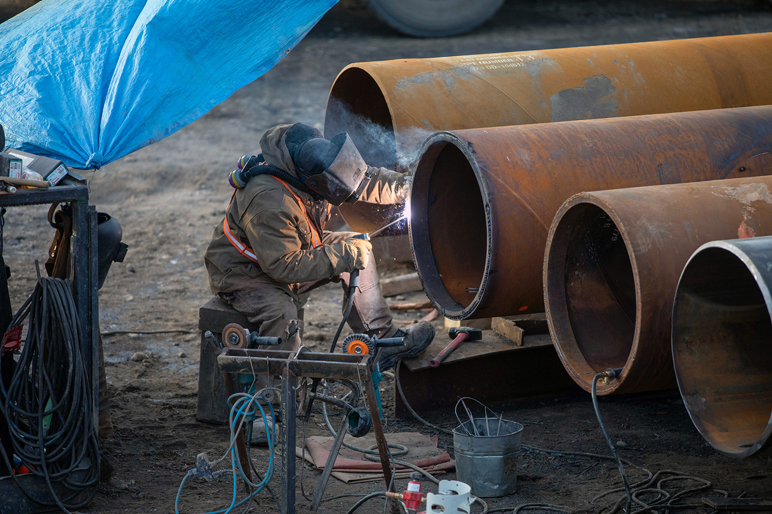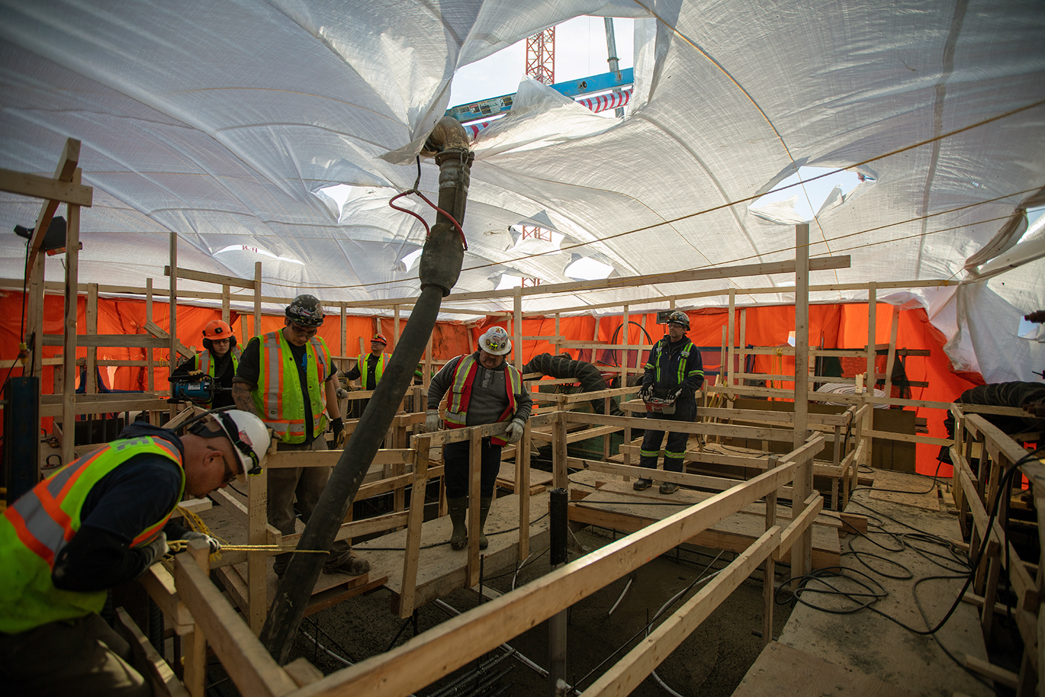 Moberly River piles are cut to final elevation, filled with concrete and tarped to maintain adequate temperature during the curing process. (February 2020)
