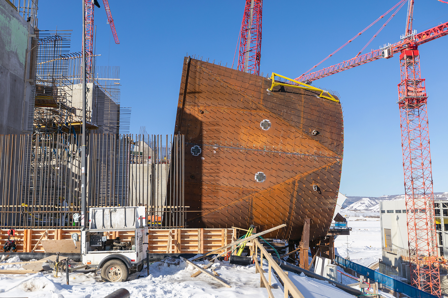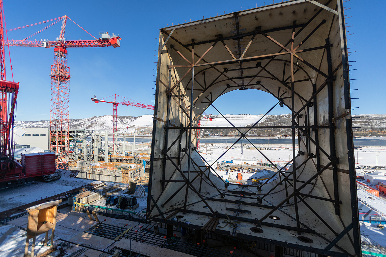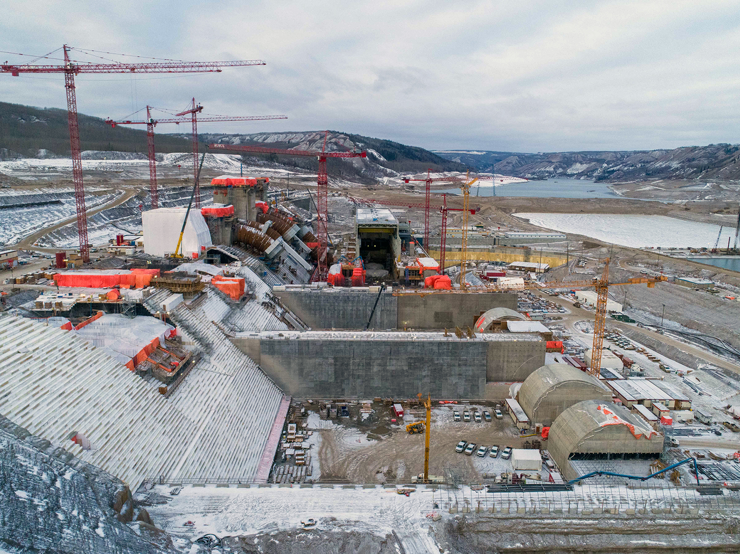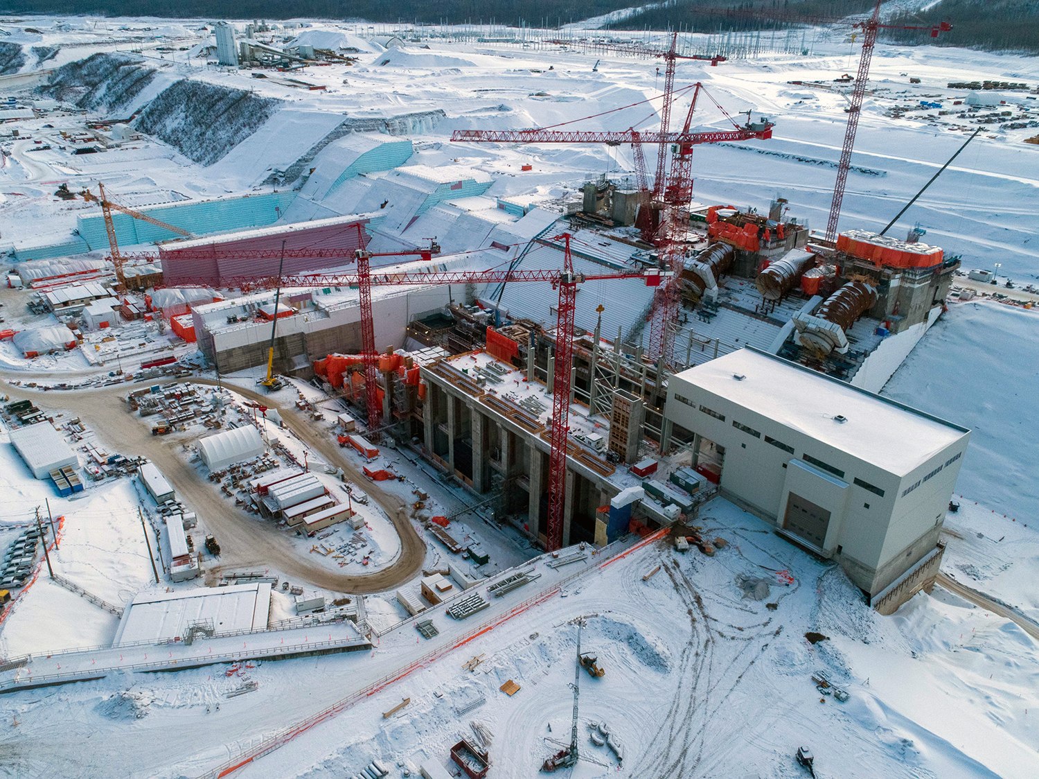 Up to nine cranes are being used to build the Site C powerhouse and install the six penstocks. (October 2020)