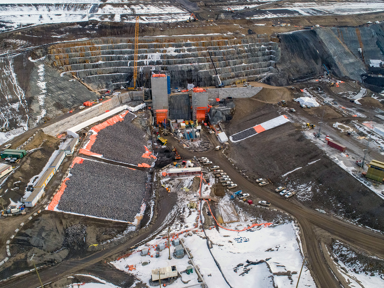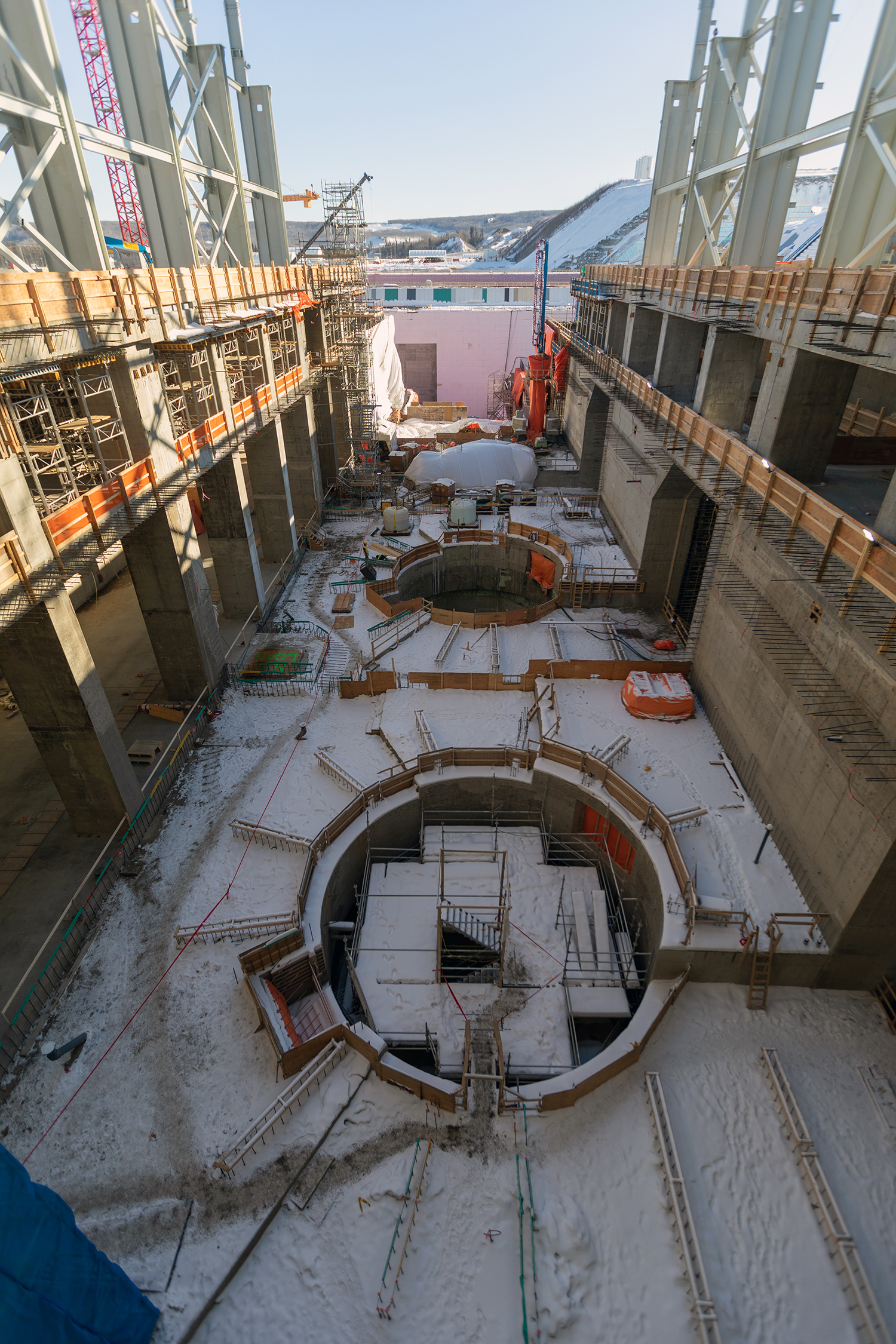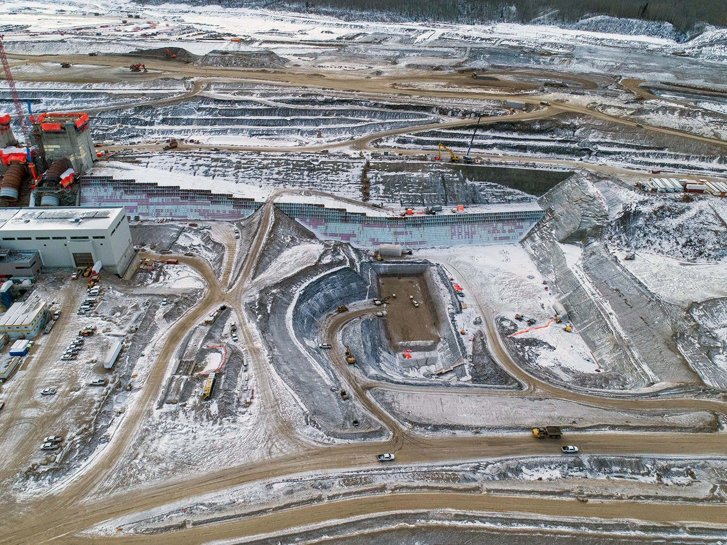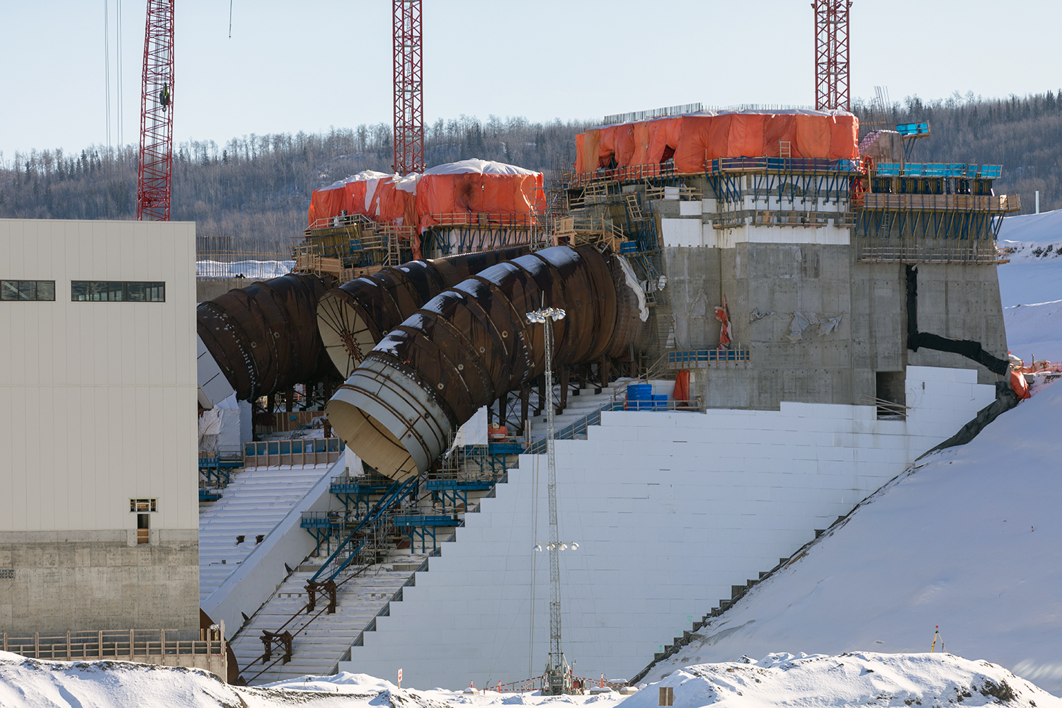 Up to nine cranes are being used to build the Site C powerhouse and install the six penstocks. (October 2020)