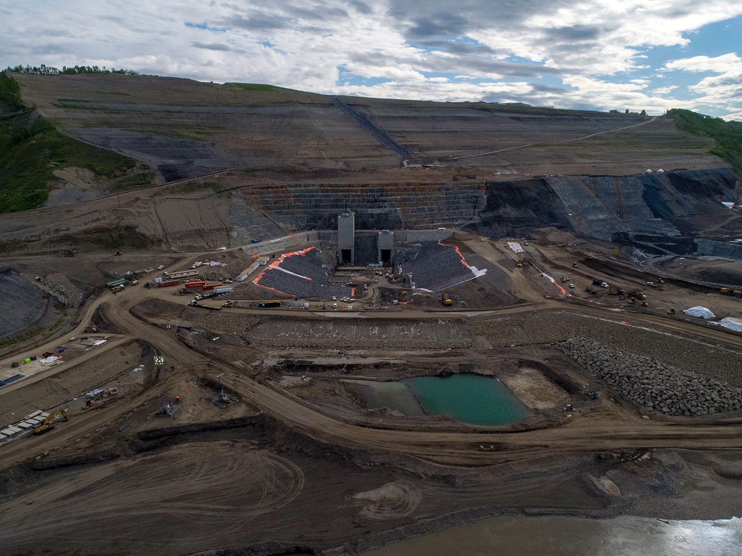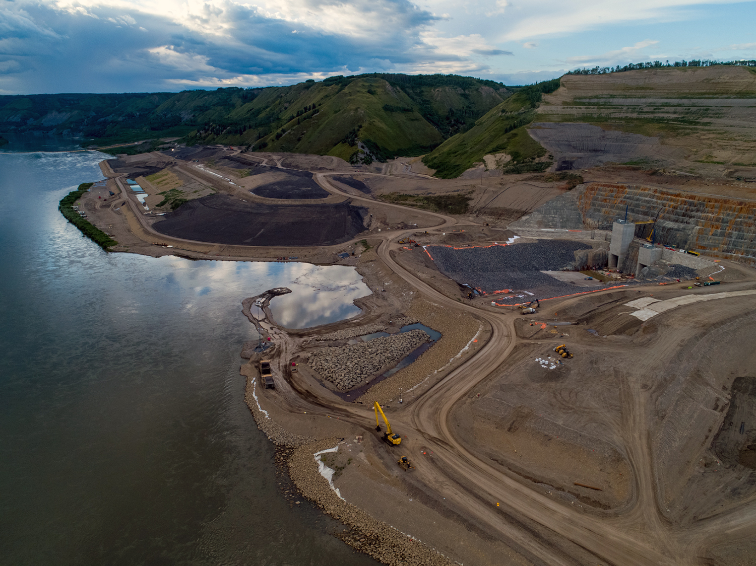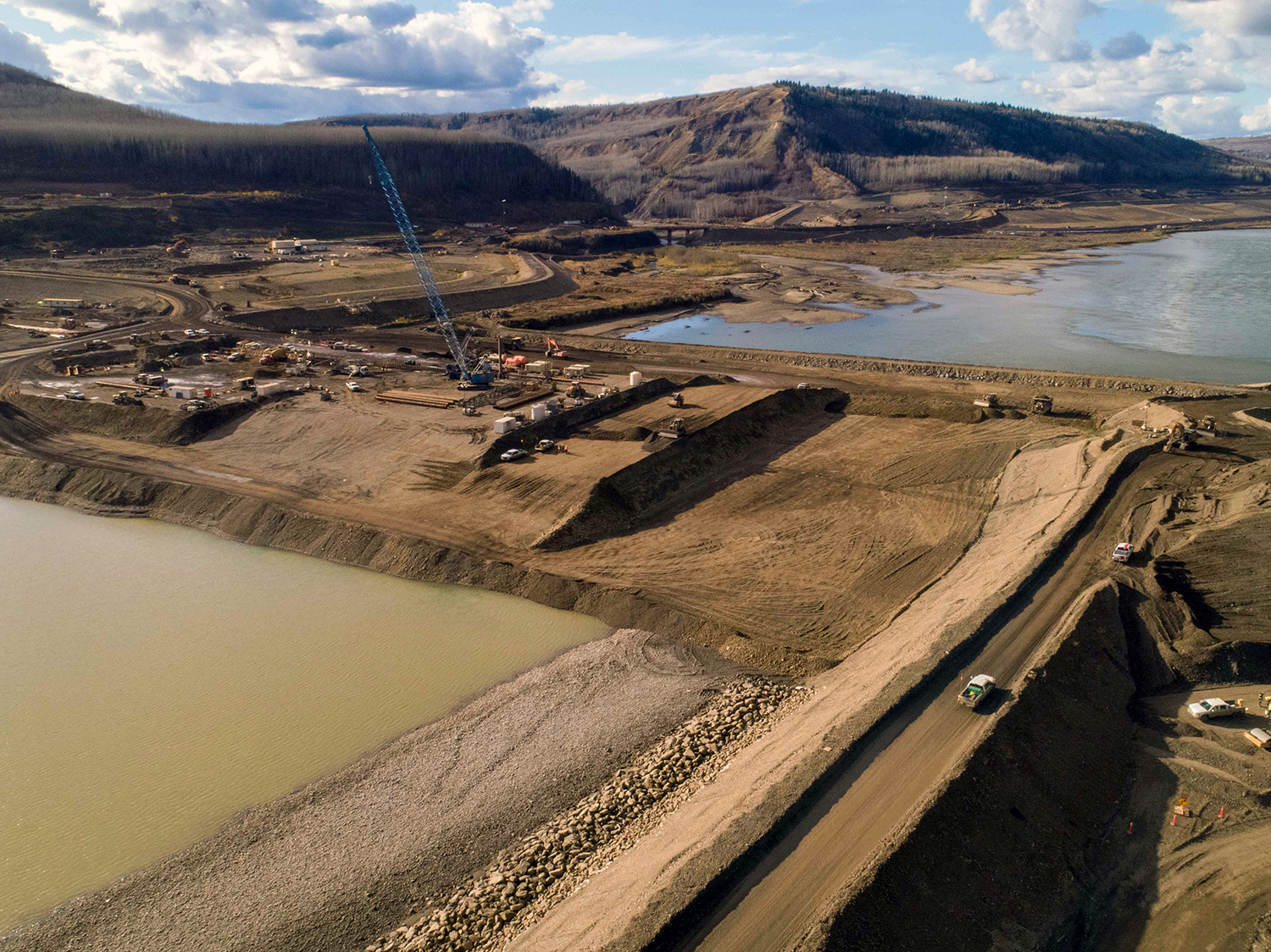 The Peace River continues to flow down the main river channel as well as through the open diversion tunnels as the rockfill berm nears completion. (October 2020)