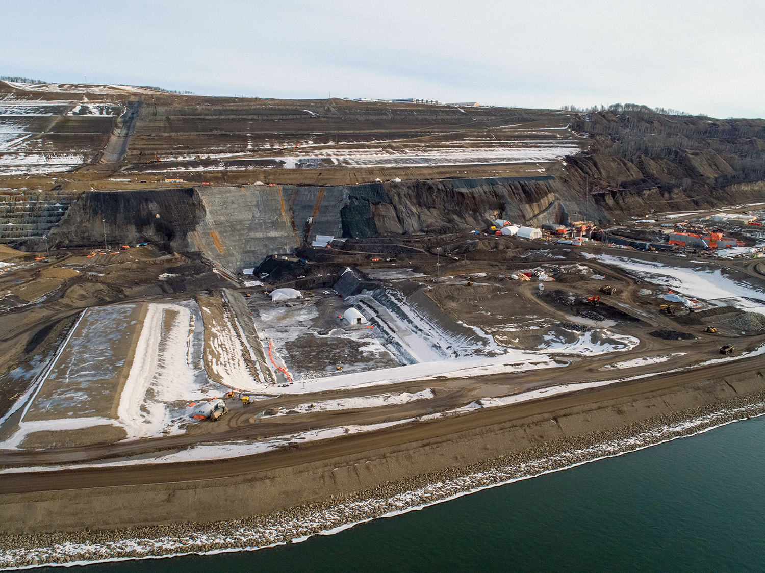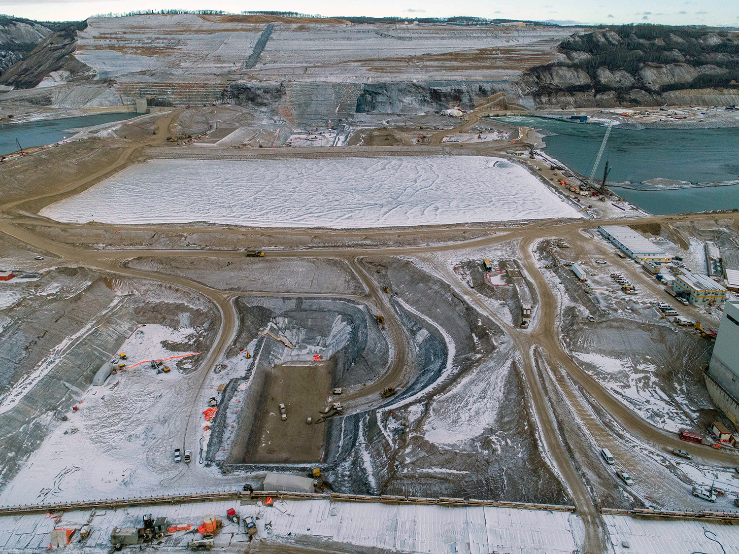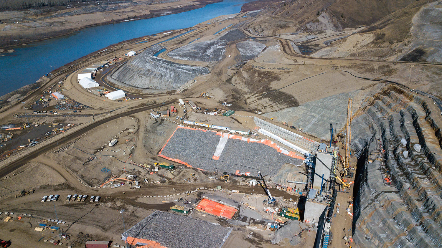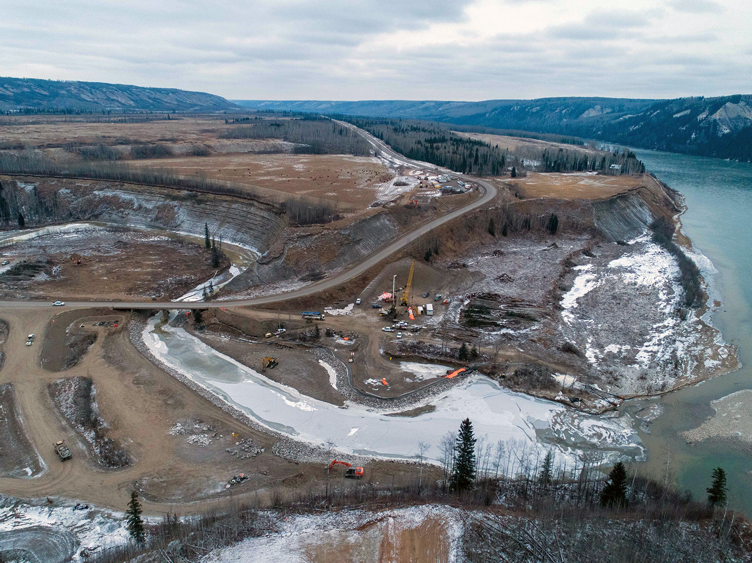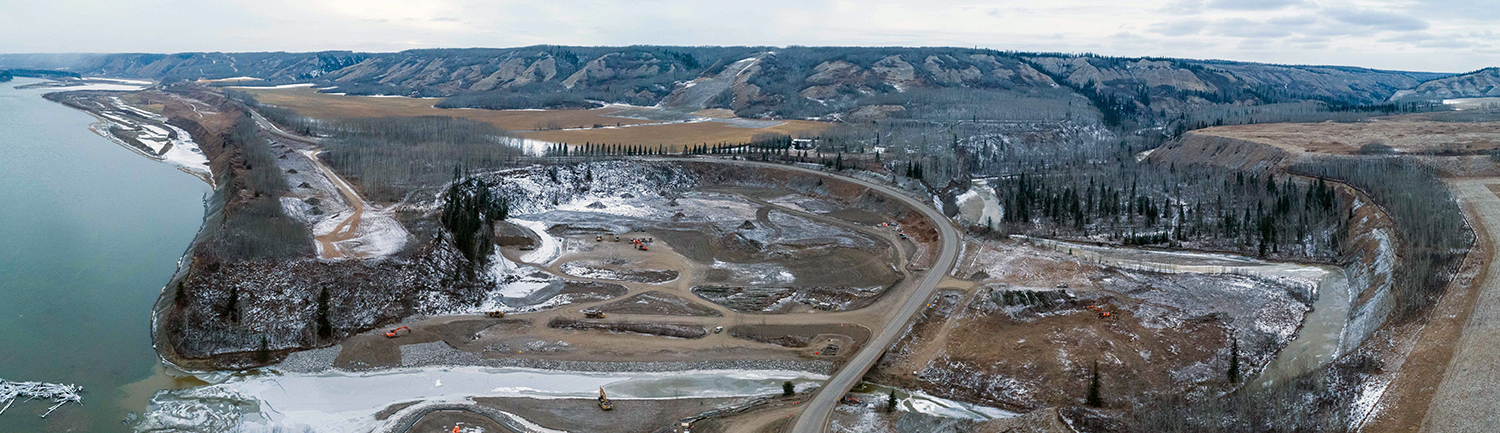 An aerial view of the south bank dam core trench looking north across the diverted Peace River. (December 2020)