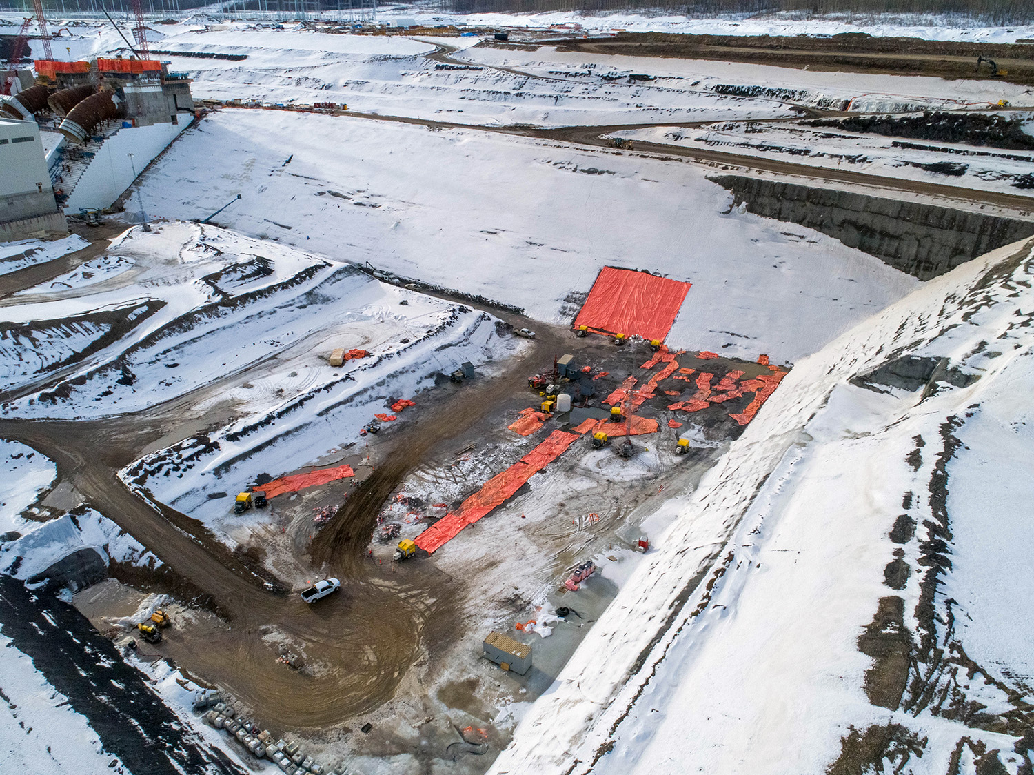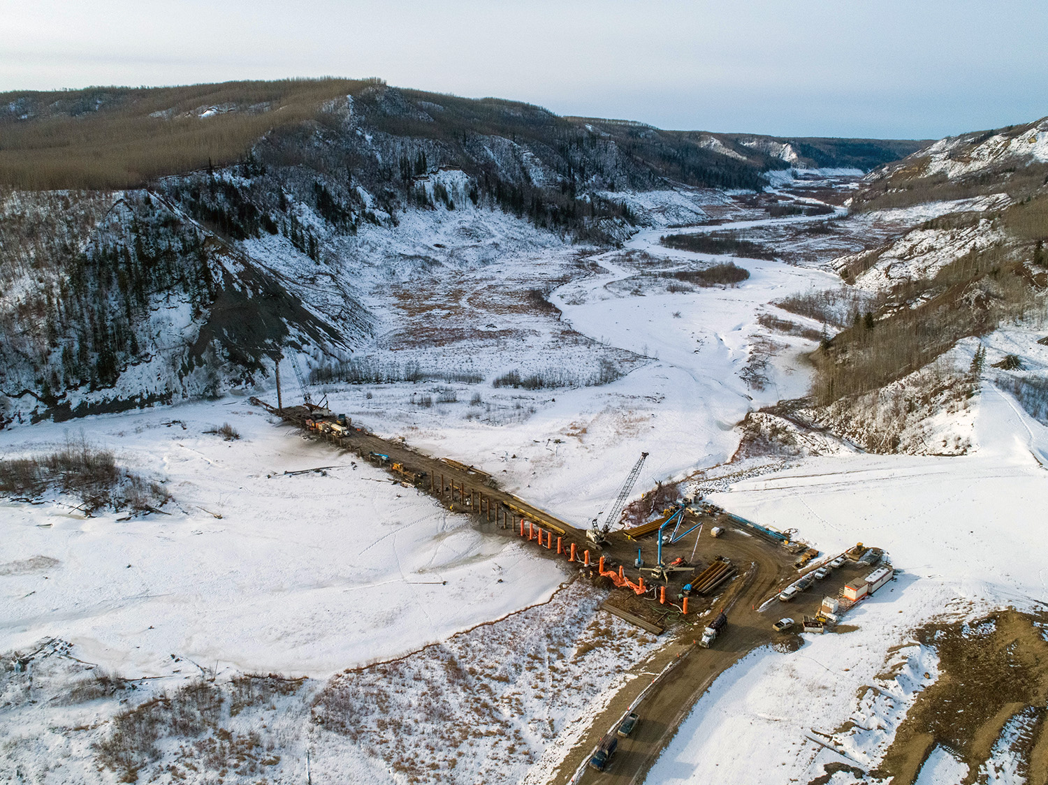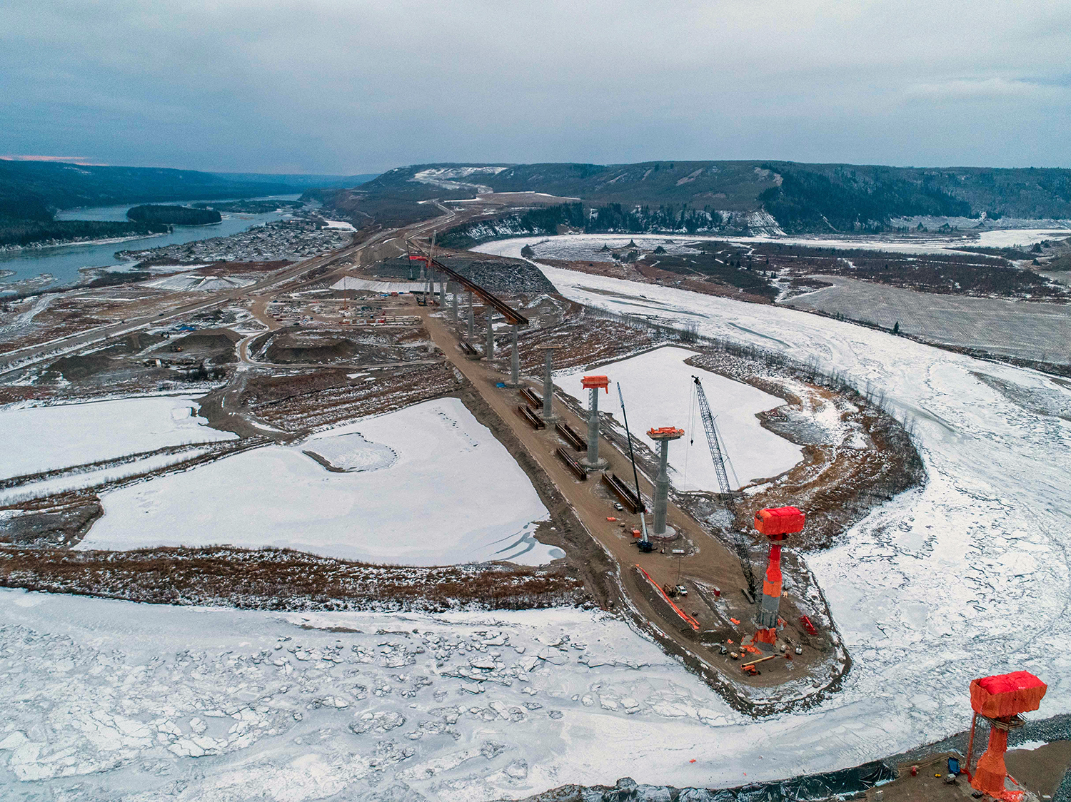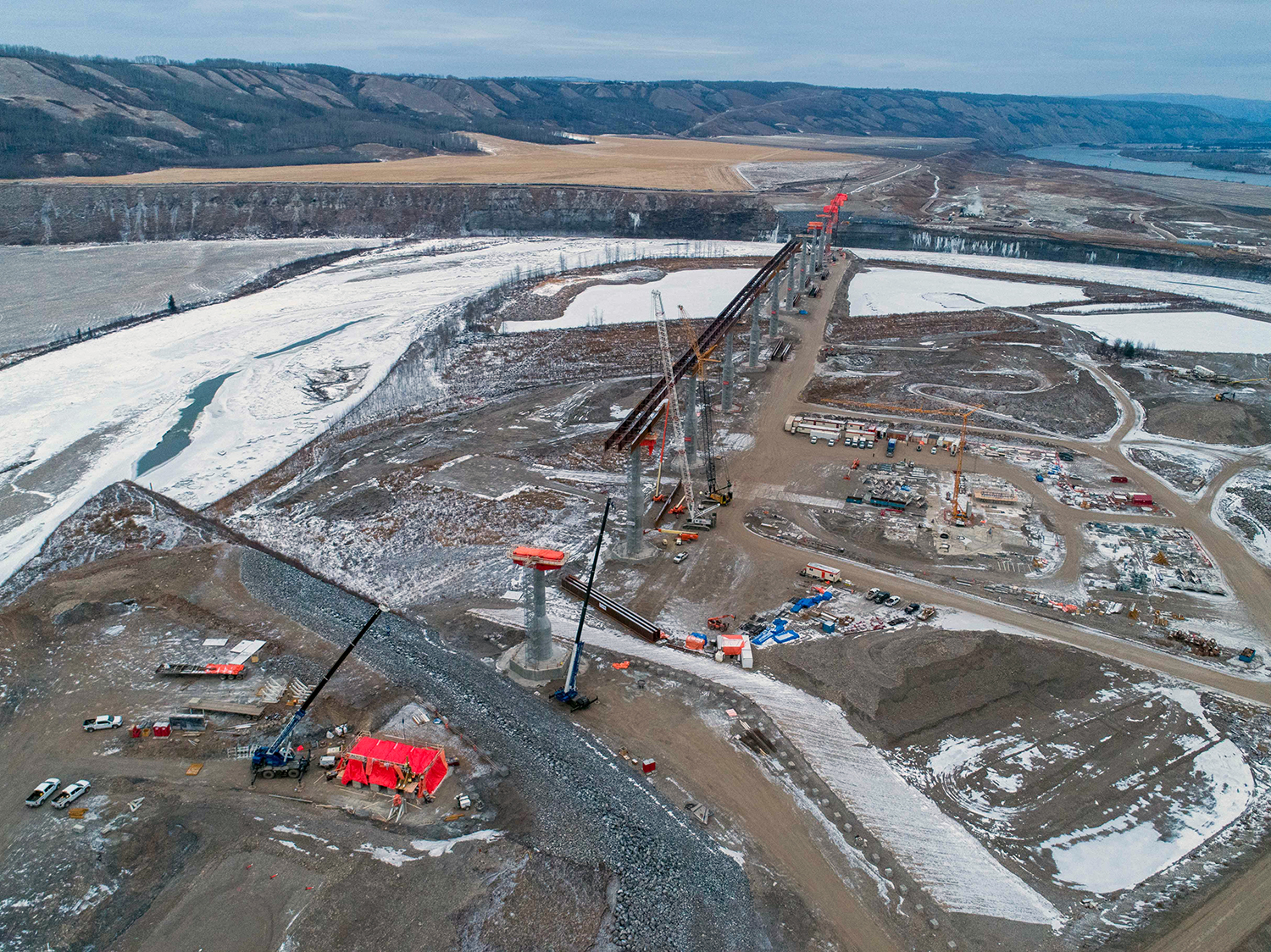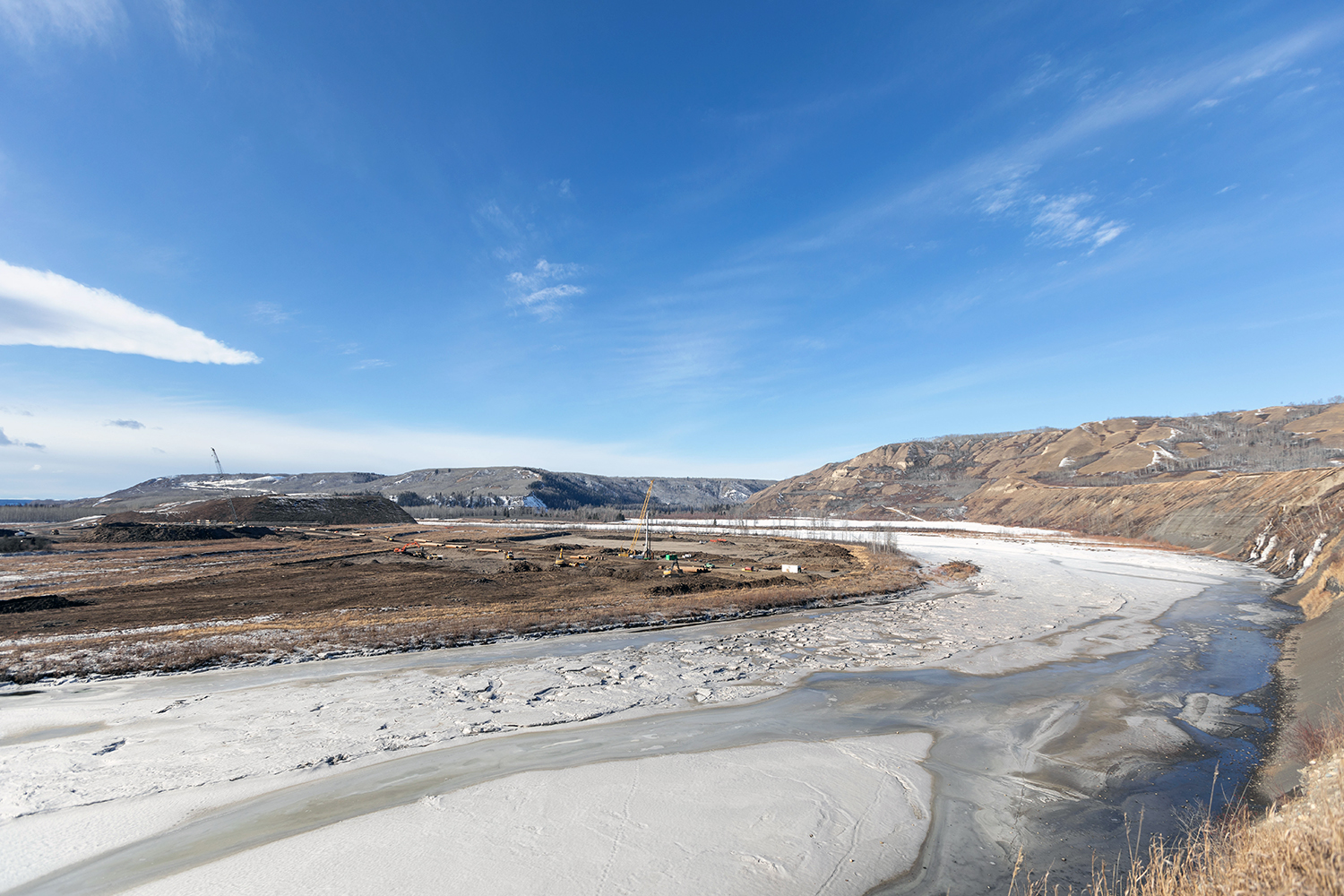 An aerial view of the south bank dam core trench looking north across the diverted Peace River. (December 2020)