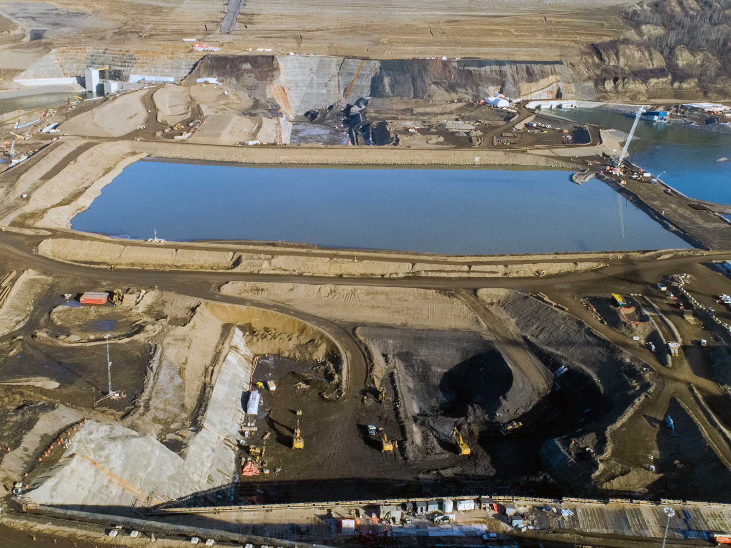 An view from the Site C north bank overlooking the the downstream cofferdam (left), the upstream rockfill berm (centre-right), and head pond (right). (December 2020)