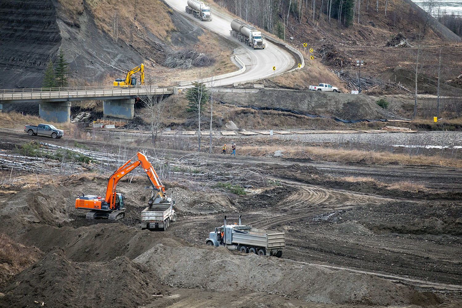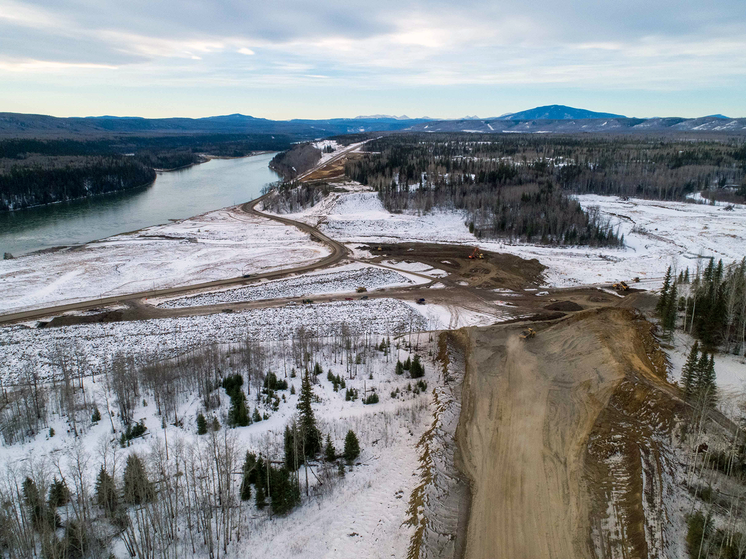 Site preparation is underway along Highway 29 at Halfway River for construction of 3.7 kilometres of new highway and a 1-km long bridge. (February 2020)