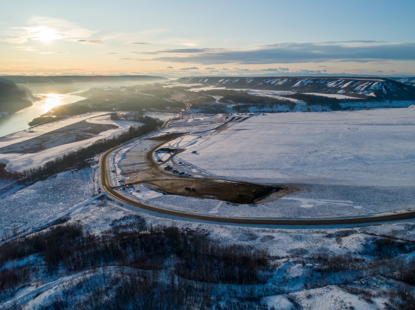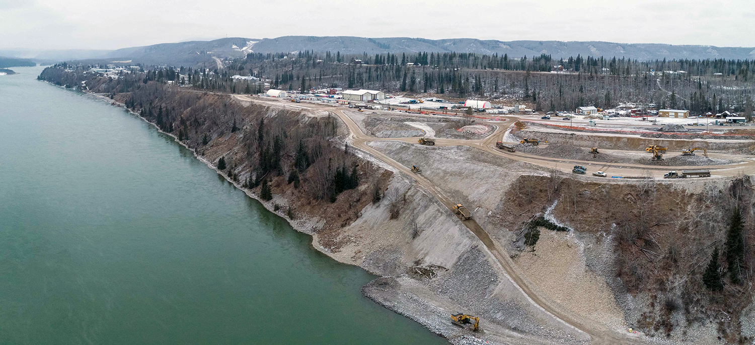 The construction of a 2.6-kilometre-long berm to protect the shoreline of Hudson's Hope is underway. (December 2020)