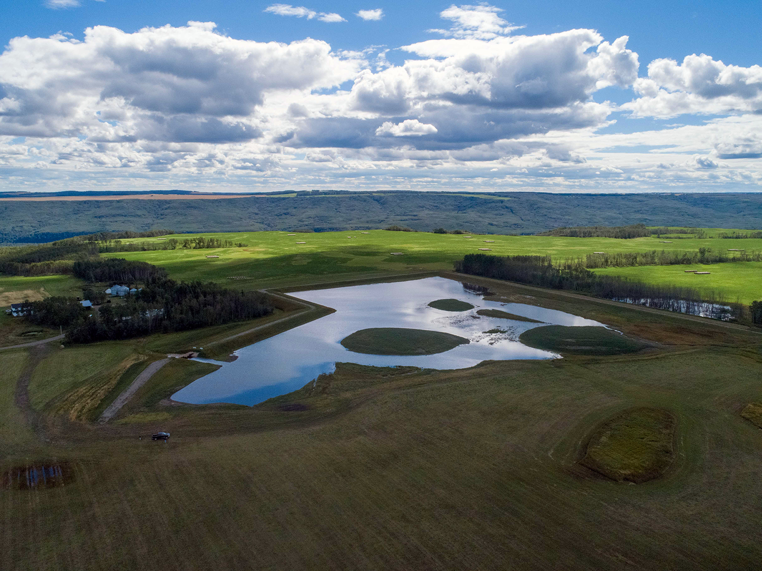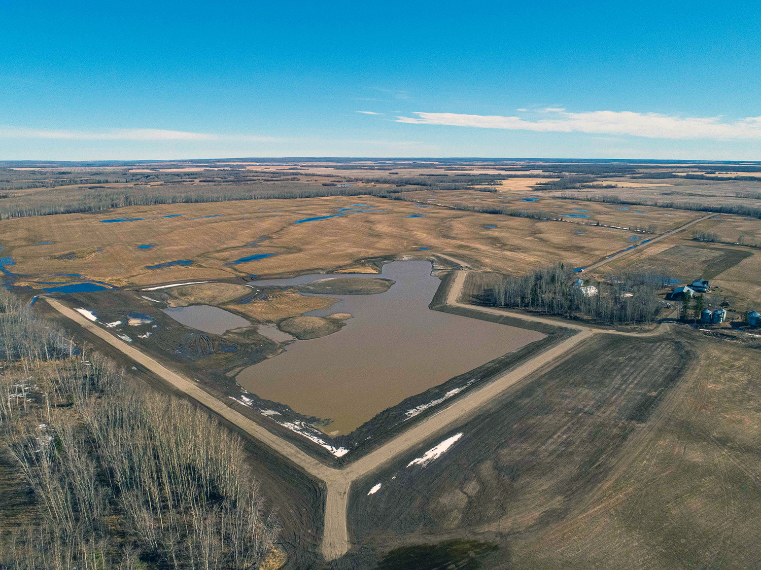 An aerial view of the main basin at the restored Golata Creek wetlands. (April 2020)
