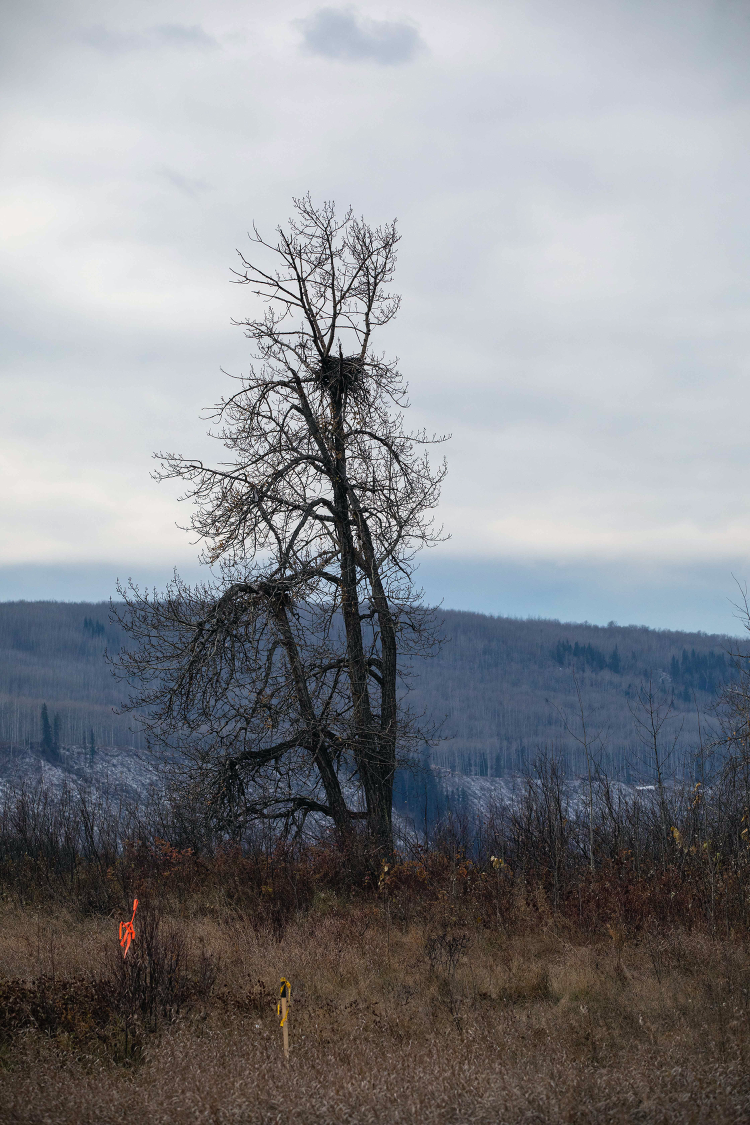This nest was part of an artificial nesting platform that will be installed near the shore of the future Site C reservoir. The nest was transported to a storage yard, where it remained for a few months while the new home was prepared. (October 2020)