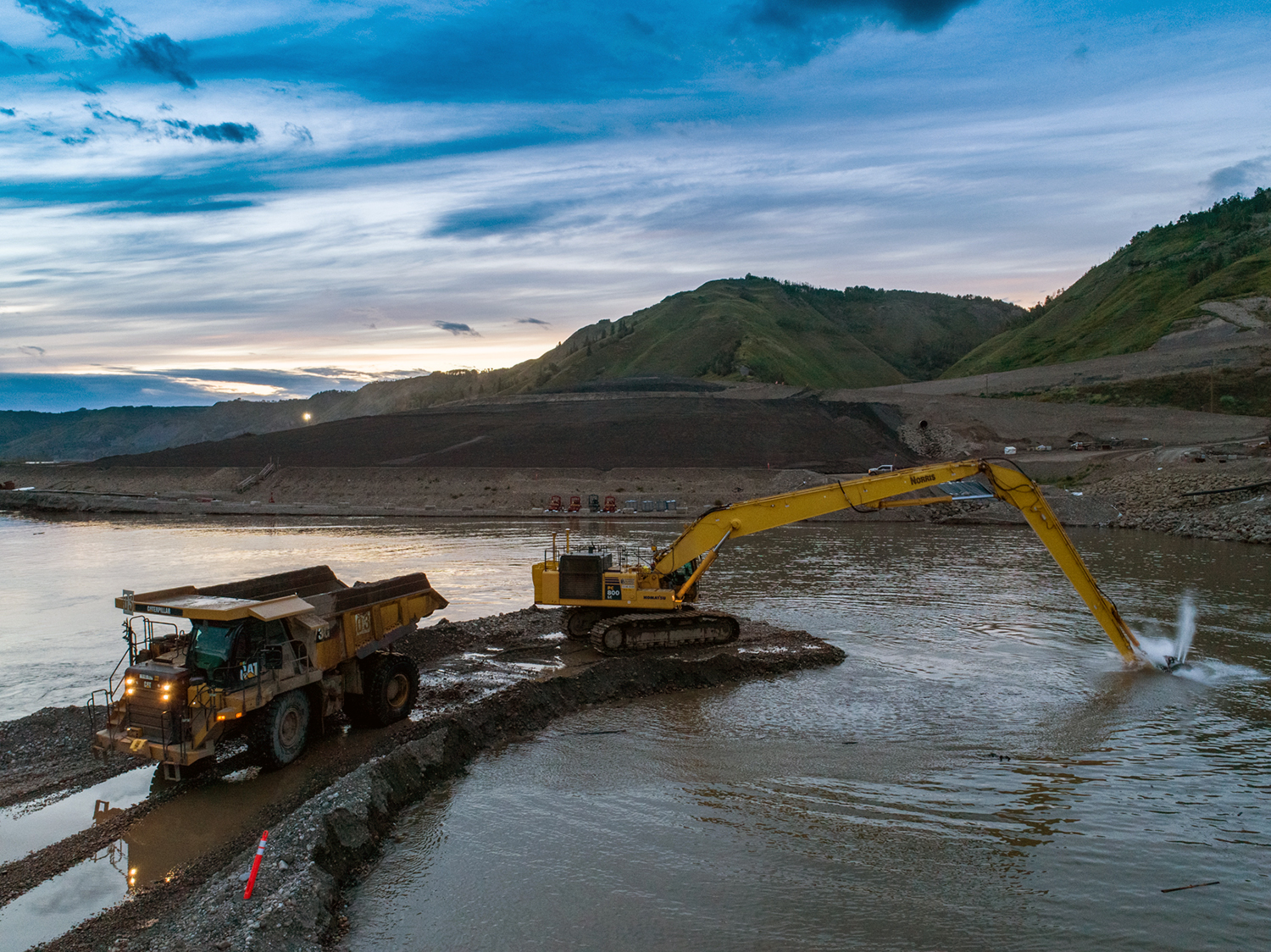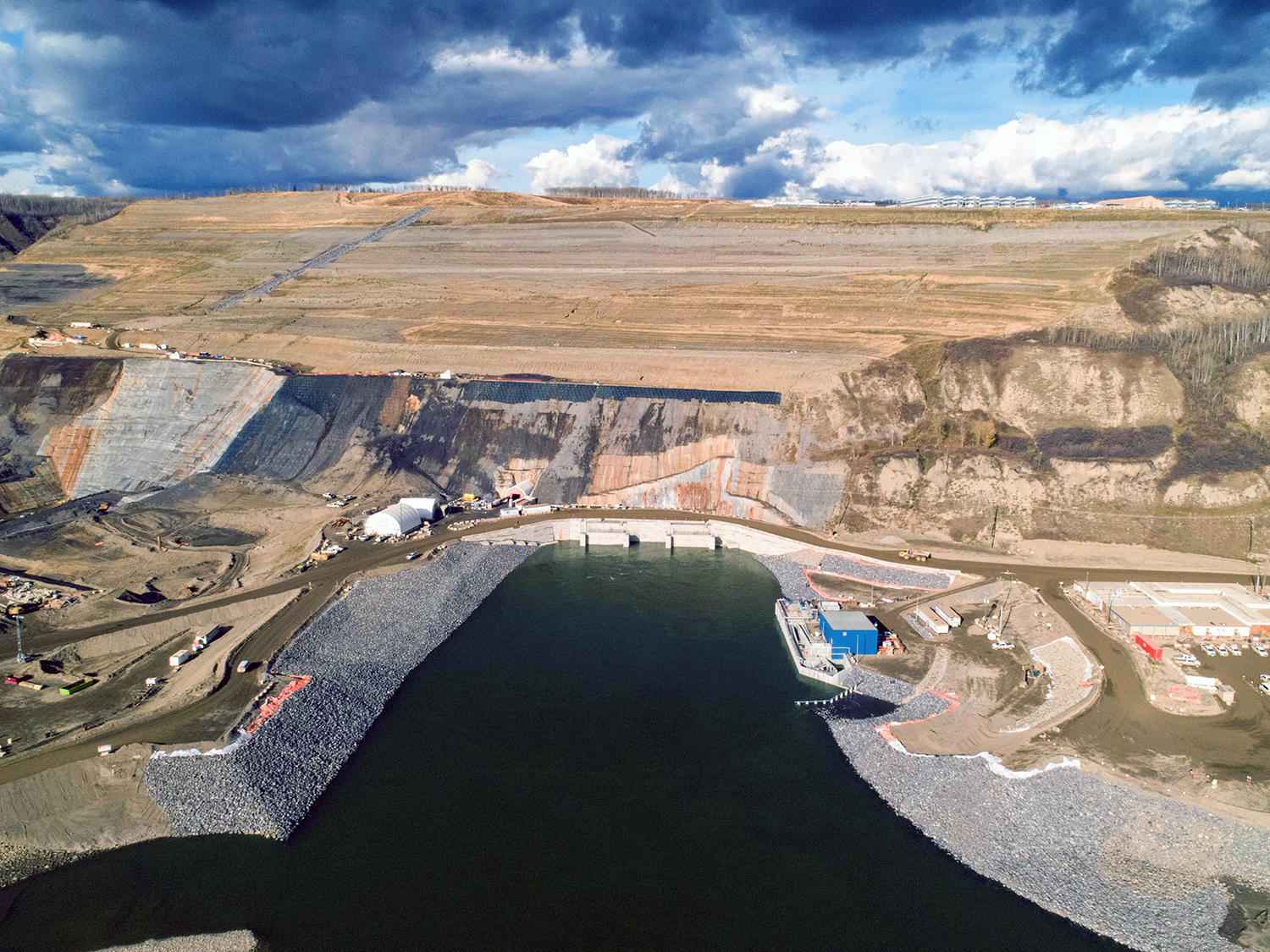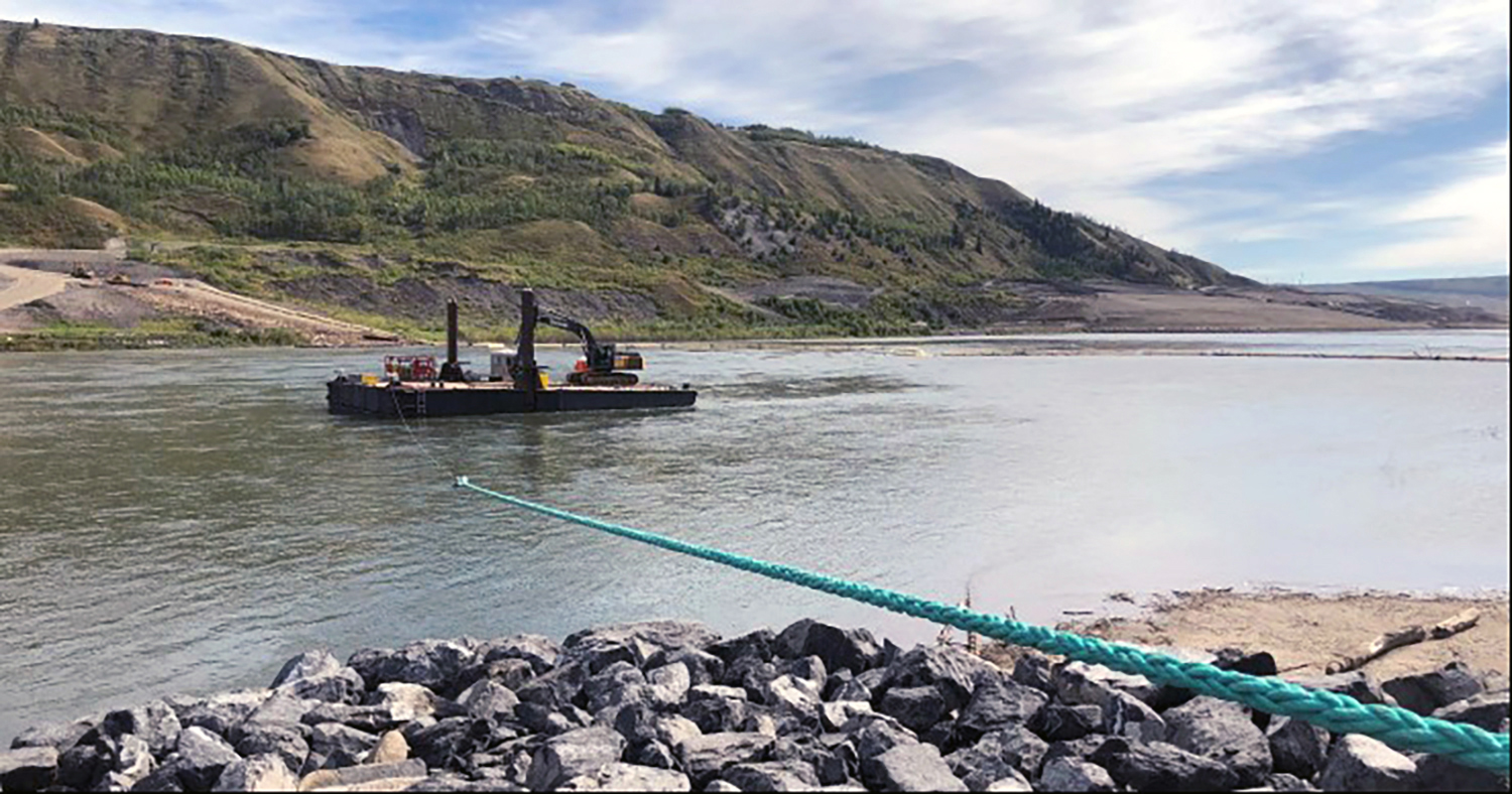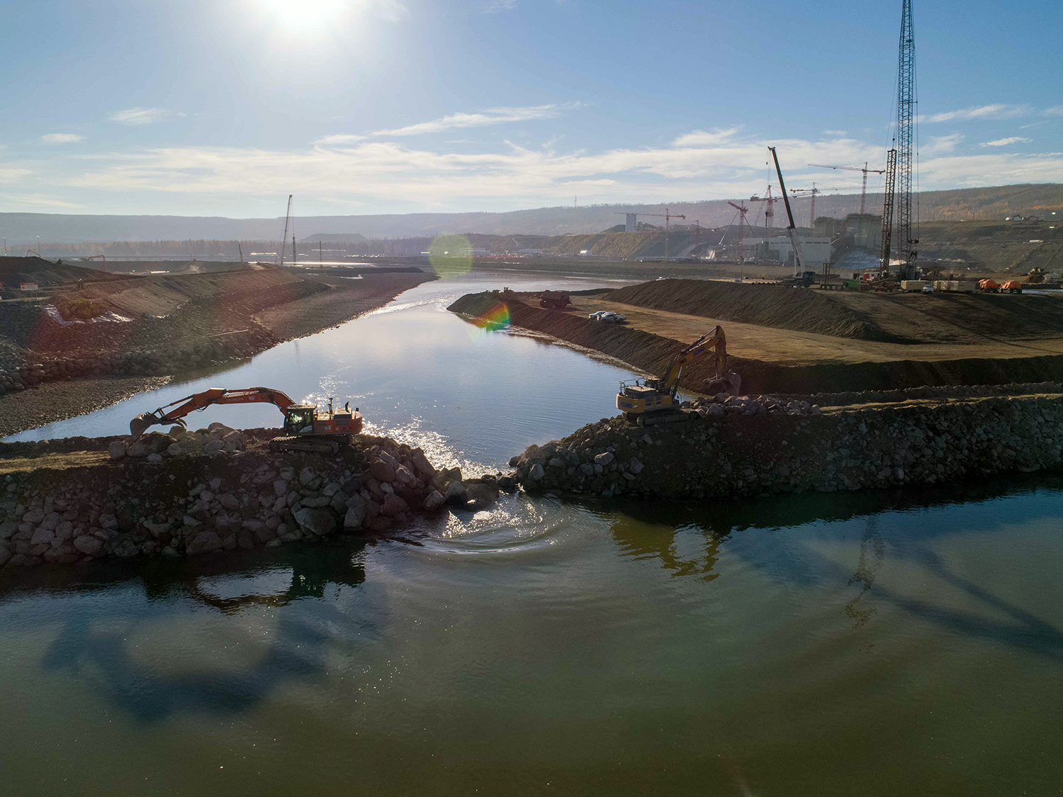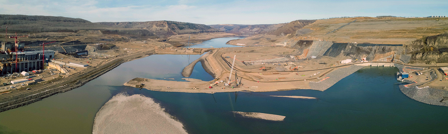 On October 3, 2020, the final rock materials were placed to complete the rockfill berm, initiating full diversion of the Peace River. (October 2020)