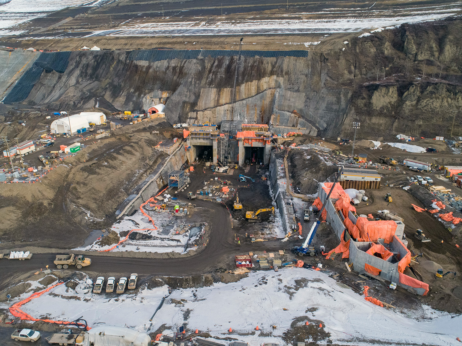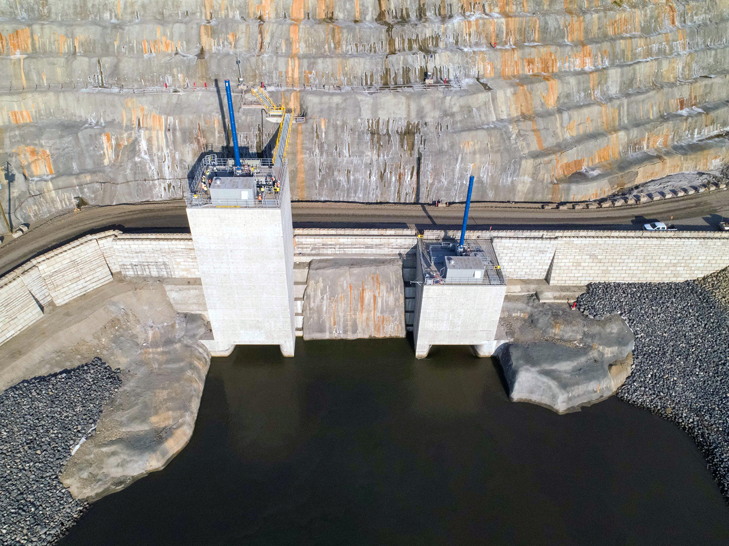 Aerial view of the diversion tunnel inlet portals. The tower structures will eventually house the mechanical gates required to control water flows into the tunnels. (February 2020)