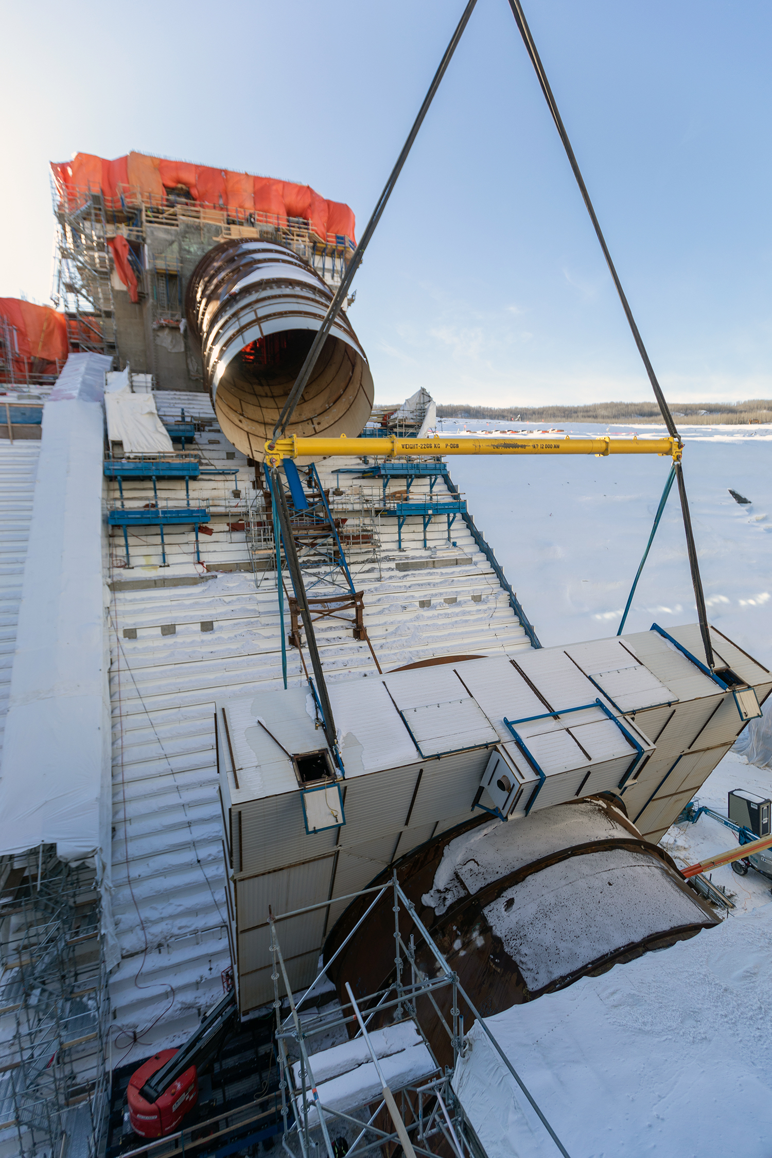 A penstock piece is lowered into place as part of the penstock installation for Unit 2. (November 2020)
