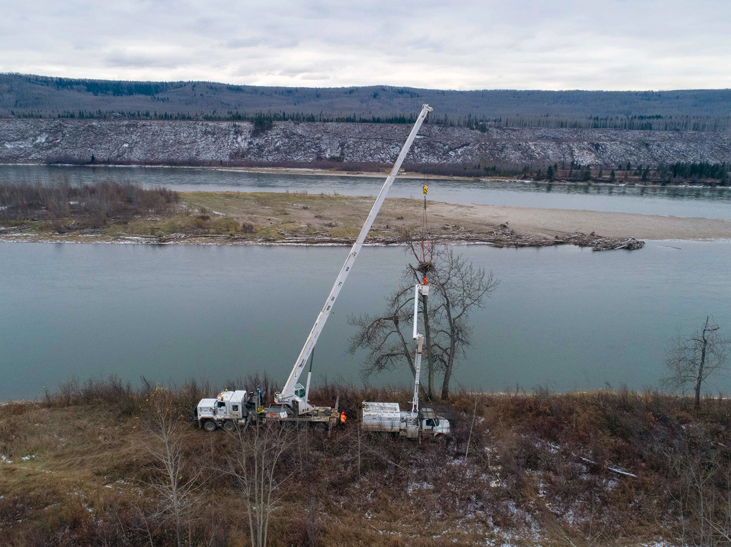 BC Hydro is constructing around 40 new eagle nesting platforms near the shoreline of the future Site C reservoir. The bald eagle nest structures are made with a steel basket that is attached to an 18-metre-long pole. (November 2020)
