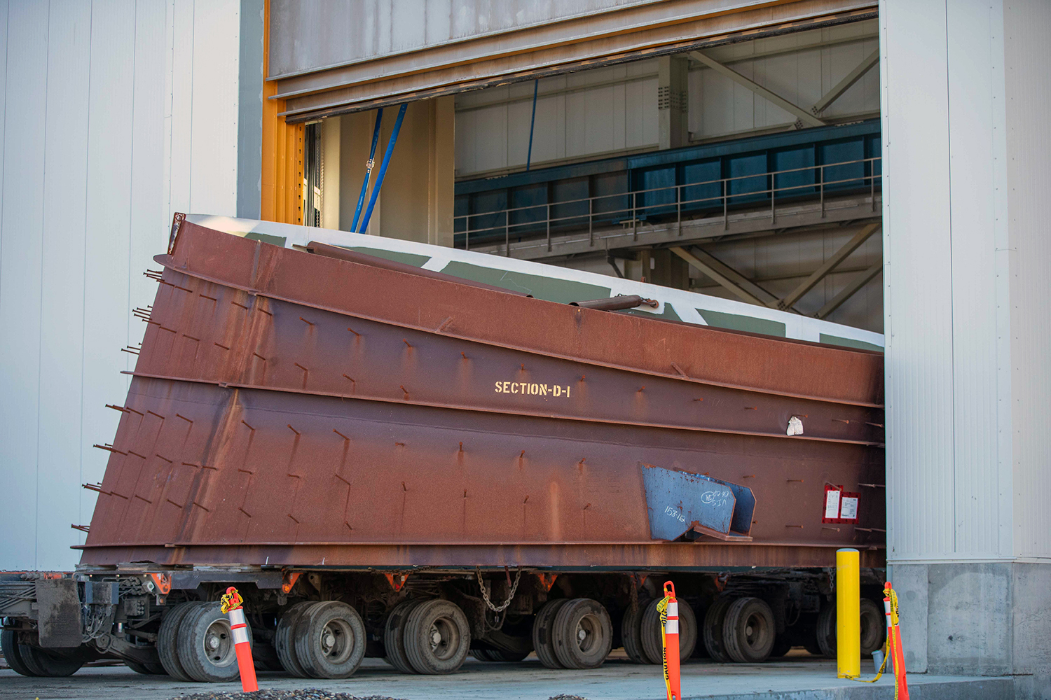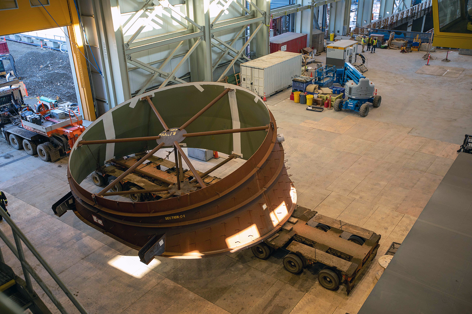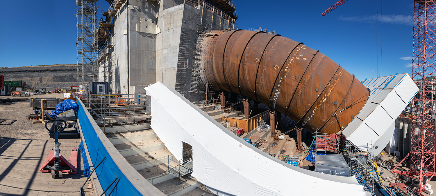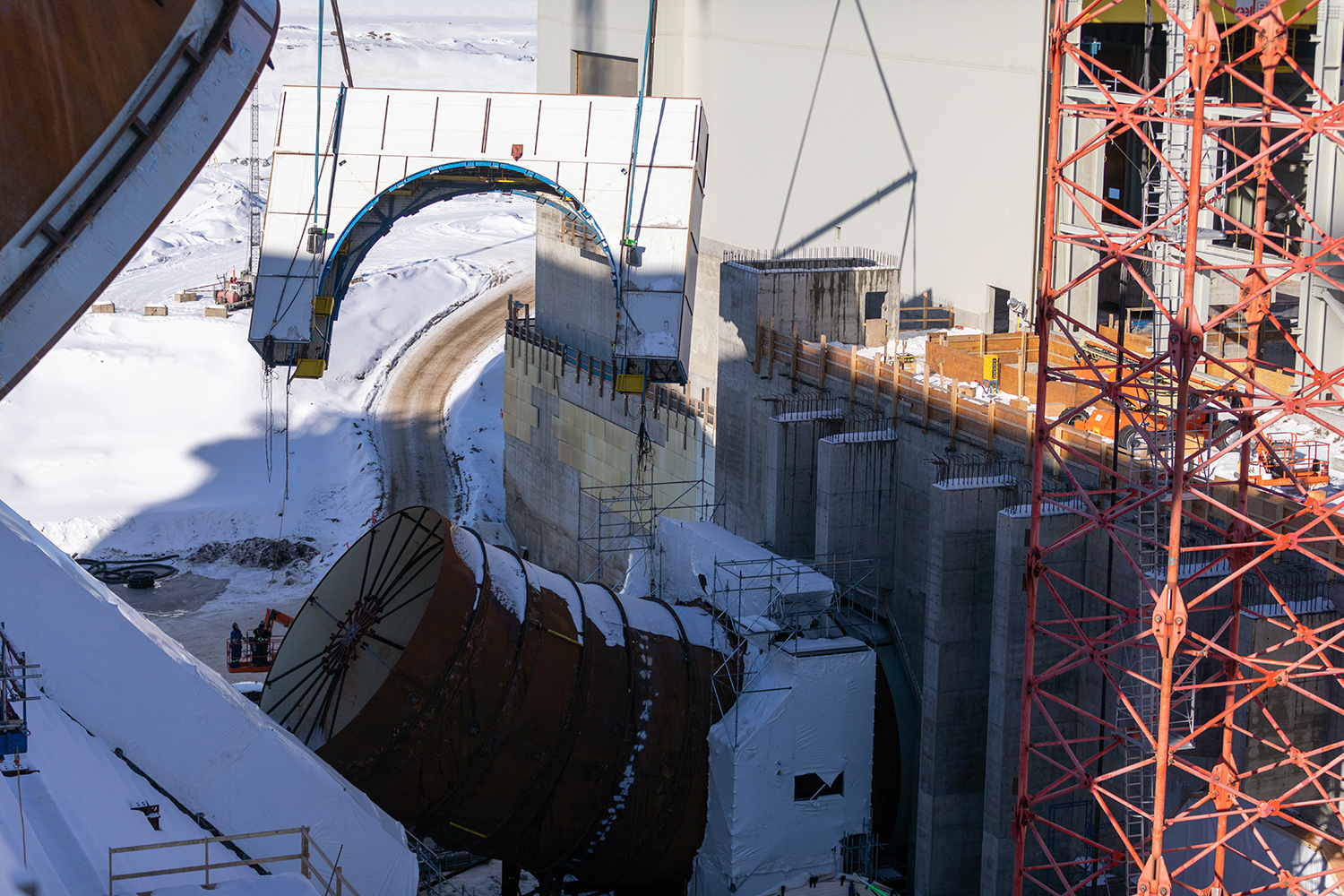The 10-metre-wide, 20 tonne, draft-tube elbow is delivered to the main service bay in the powerhouse. Each penstock will be made of 14 segments, welded together at the dam site. (October 2020)