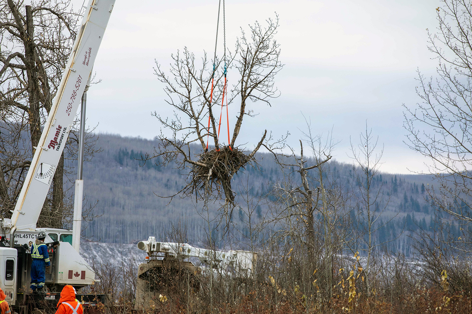 A crane was used to lift the 998-pound nest while it was cut from the tree. Professional fallers assisted in removing the section of the tree below the nest and then a crane was used to lower the piece of tree and nest onto a flatbed truck. (October 2020)