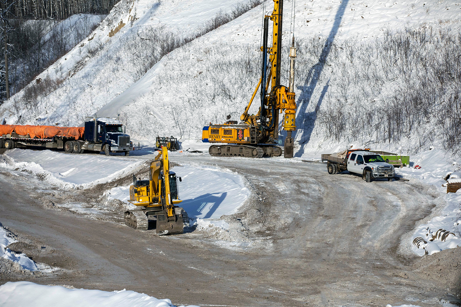Piles are being installed across the Moberly River to catch floating debris during river diversion. Debris booms will also be installed across the Moberly River, as well as the Peace River. (February 2020)