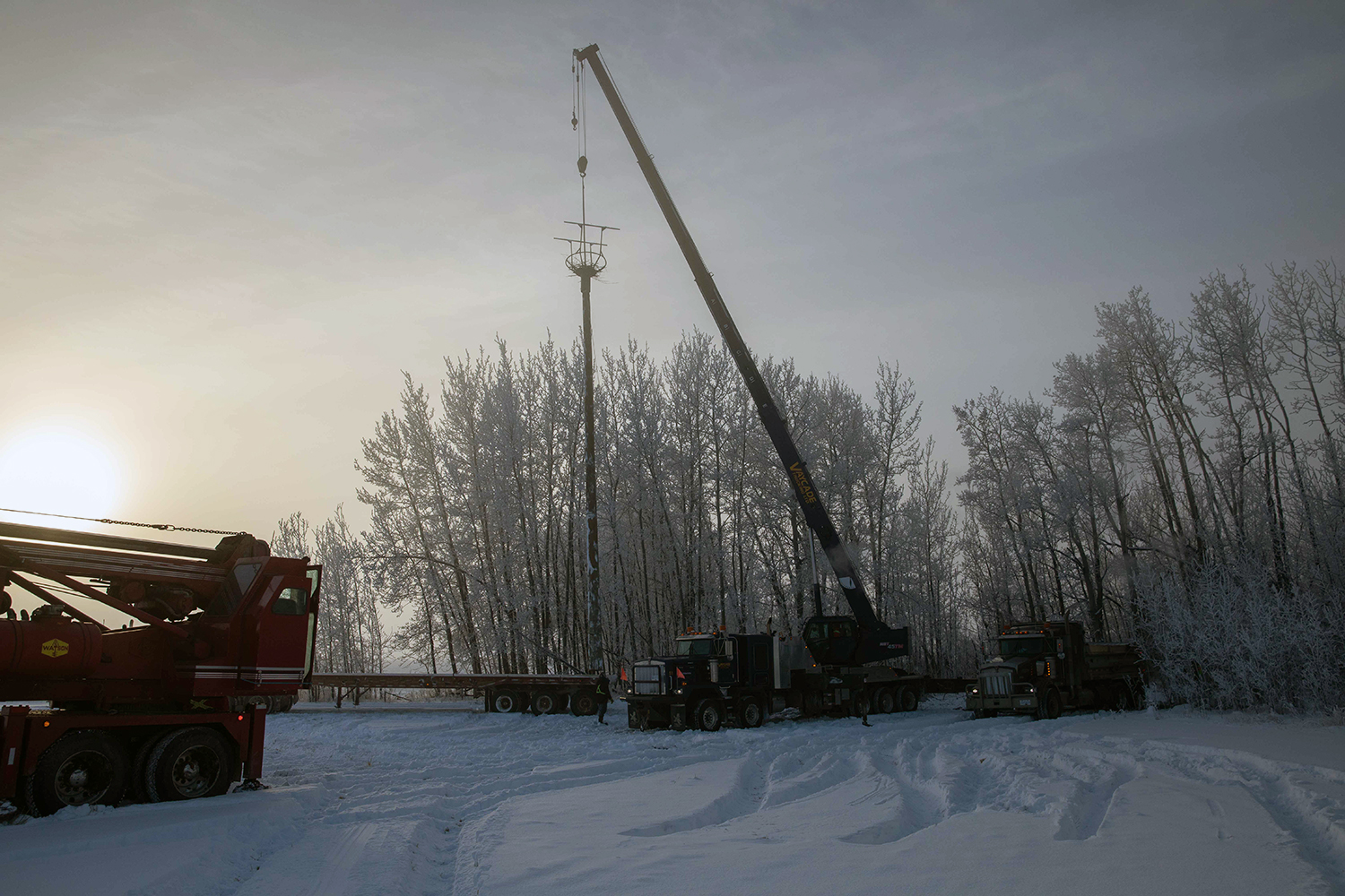 The 18-metre-long pole is hoisted into position and the base is encased in a concrete foundation. (November 2020)
