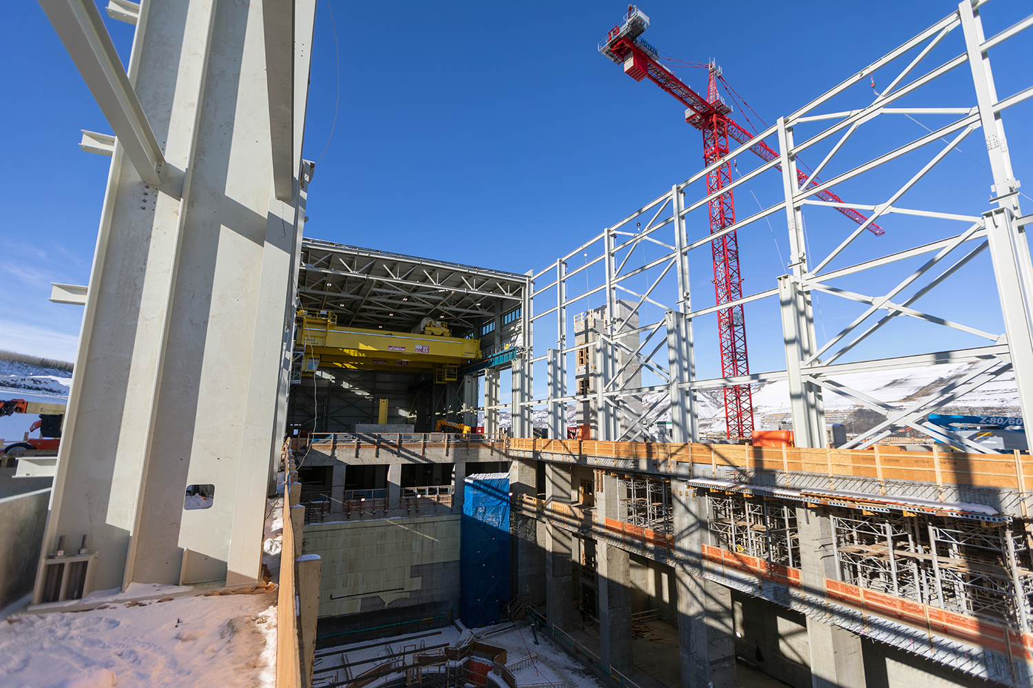 Building the powerhouse steel superstructure beside Units 1, 2 and 3 at the main service bay. (February 2020)