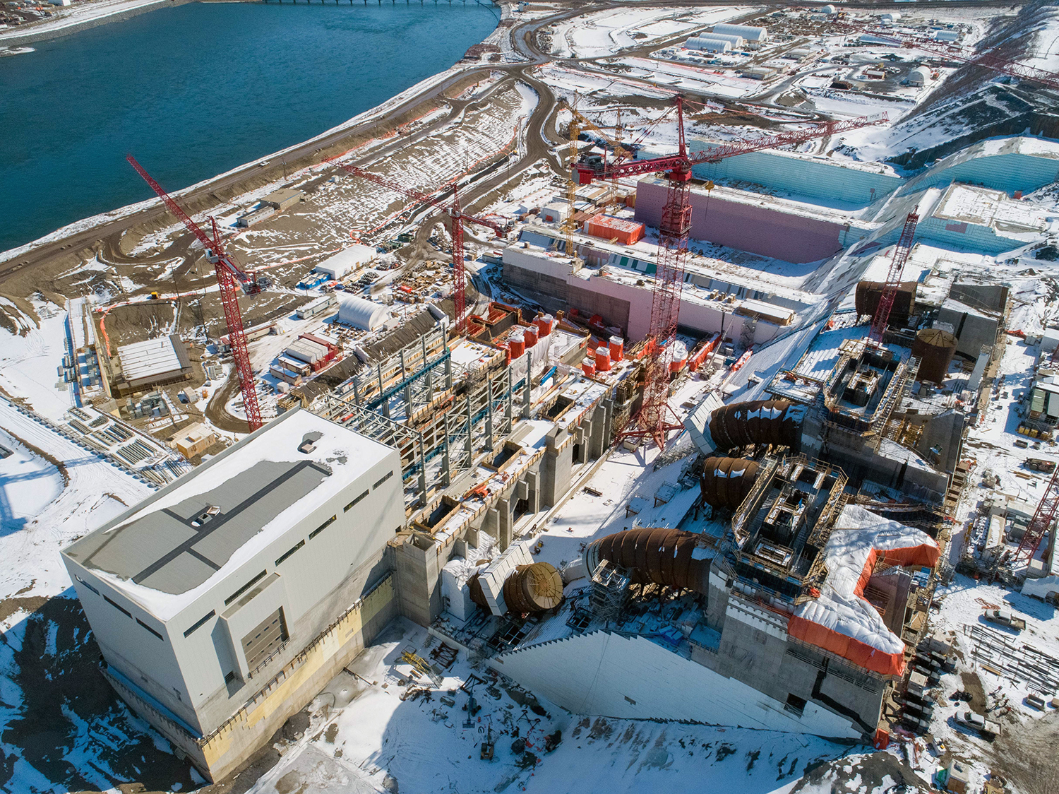 Aerial view of the powerhouse and generating station, facing north towards the left bank. (February 2020)