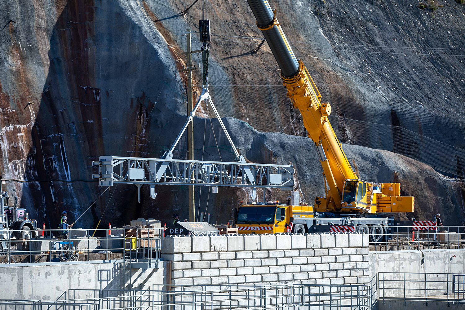 Positioning stoplog lifting beam into position to remove a stoplog segment from the diversion tunnel 2 outlet following leakage testing. (September 2020)
