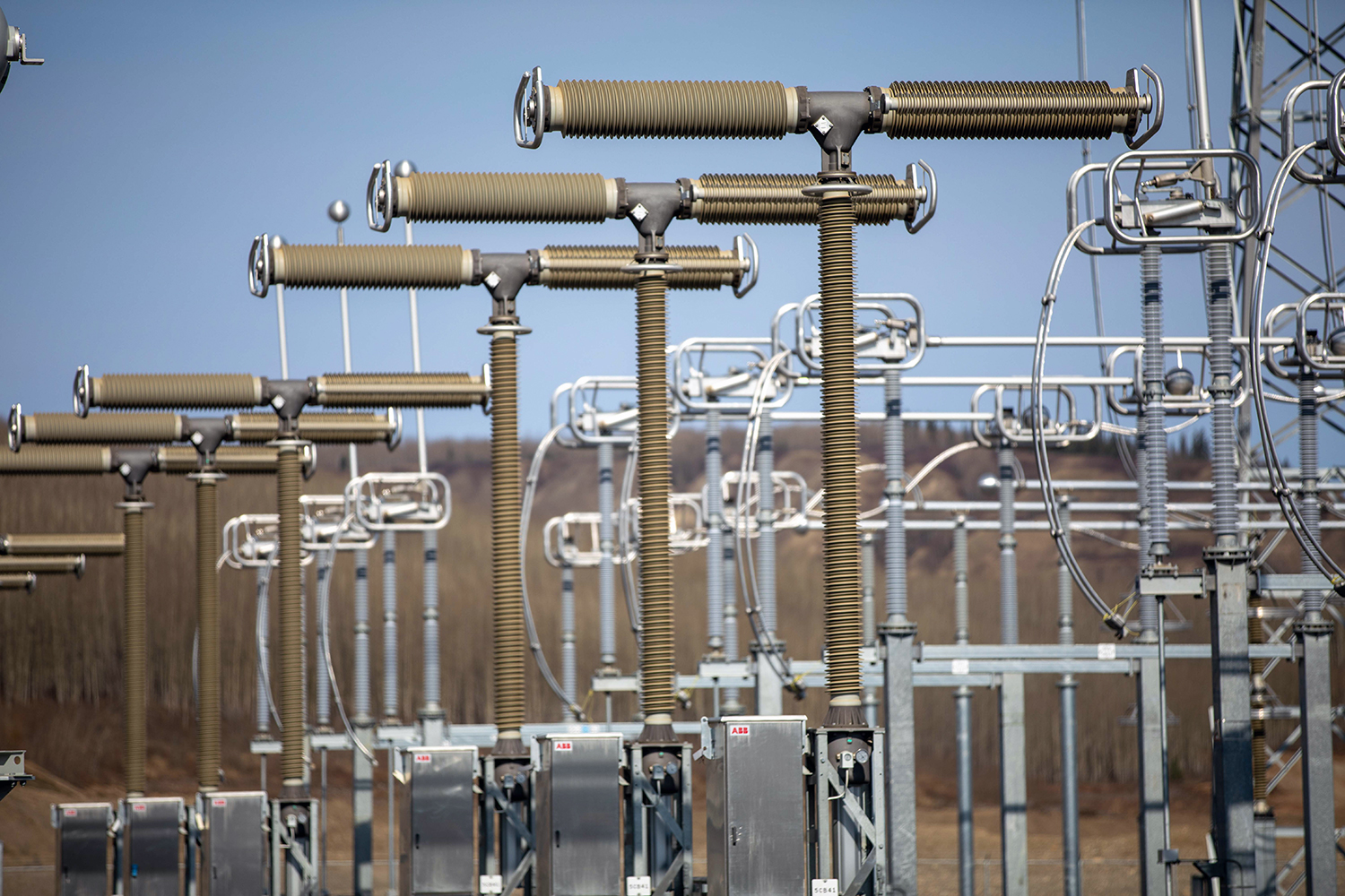 The 500 kV circuit breaker poles at the substation are assembled and ready for testing and commissioning. (April 2020)