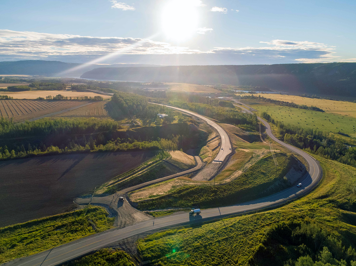 Grading work is underway on the Lynx Creek west segment of the Highway 29 realignment. This segment covers 8 kilometres of highway and includes a new bridge, causeway and embankment. (December 2020)