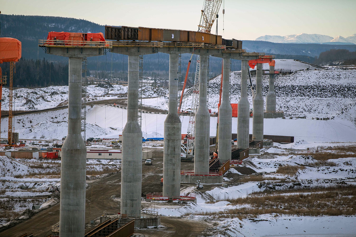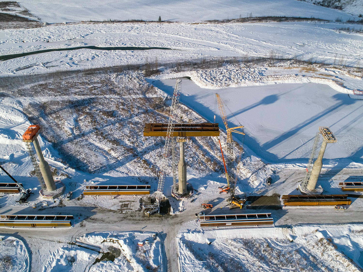 Halfway River bridge looking west as steel bridge girders are lifted into place using two large cranes. (December 2020)