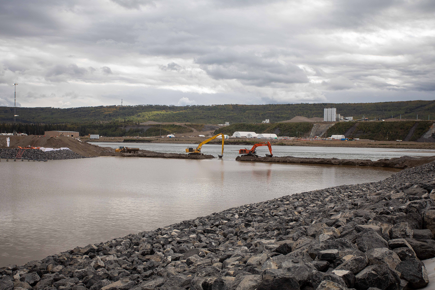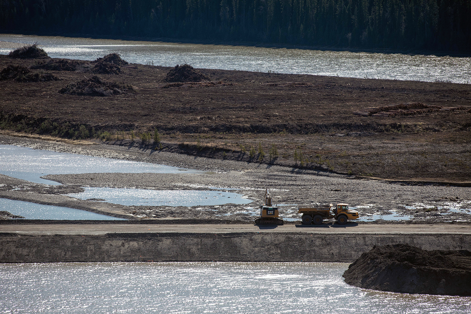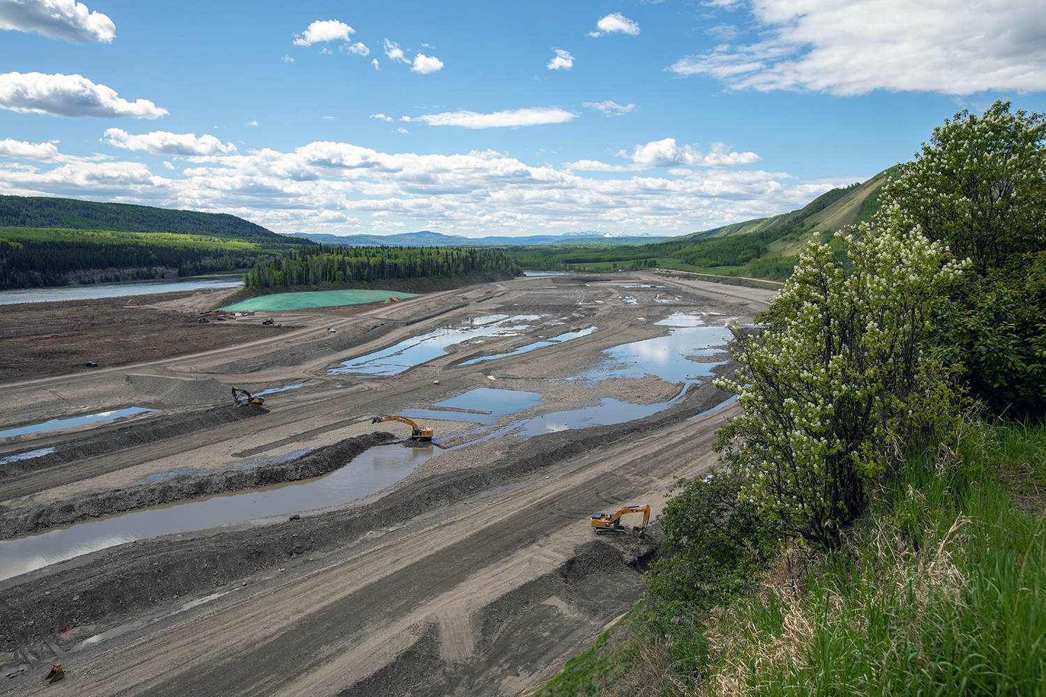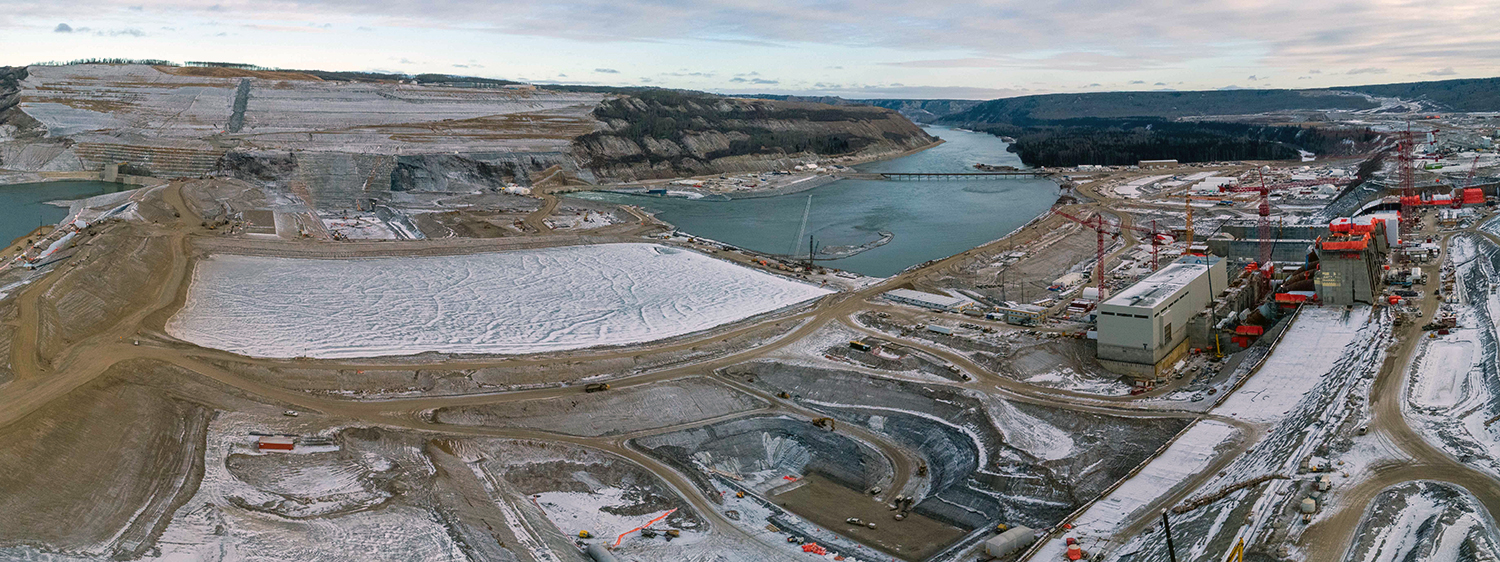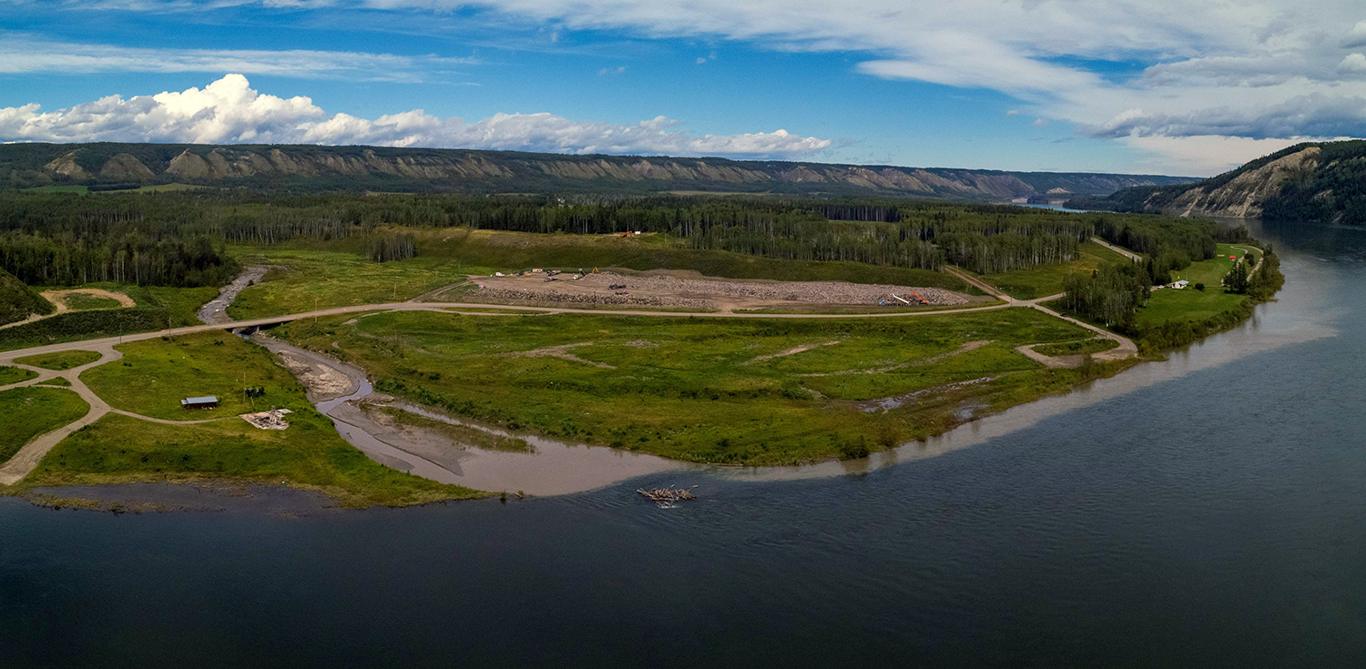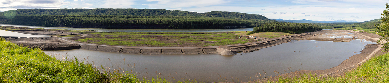 Looking upstream at the diverted Peace River, and the completed upstream and downstream cofferdams. (October 2020)