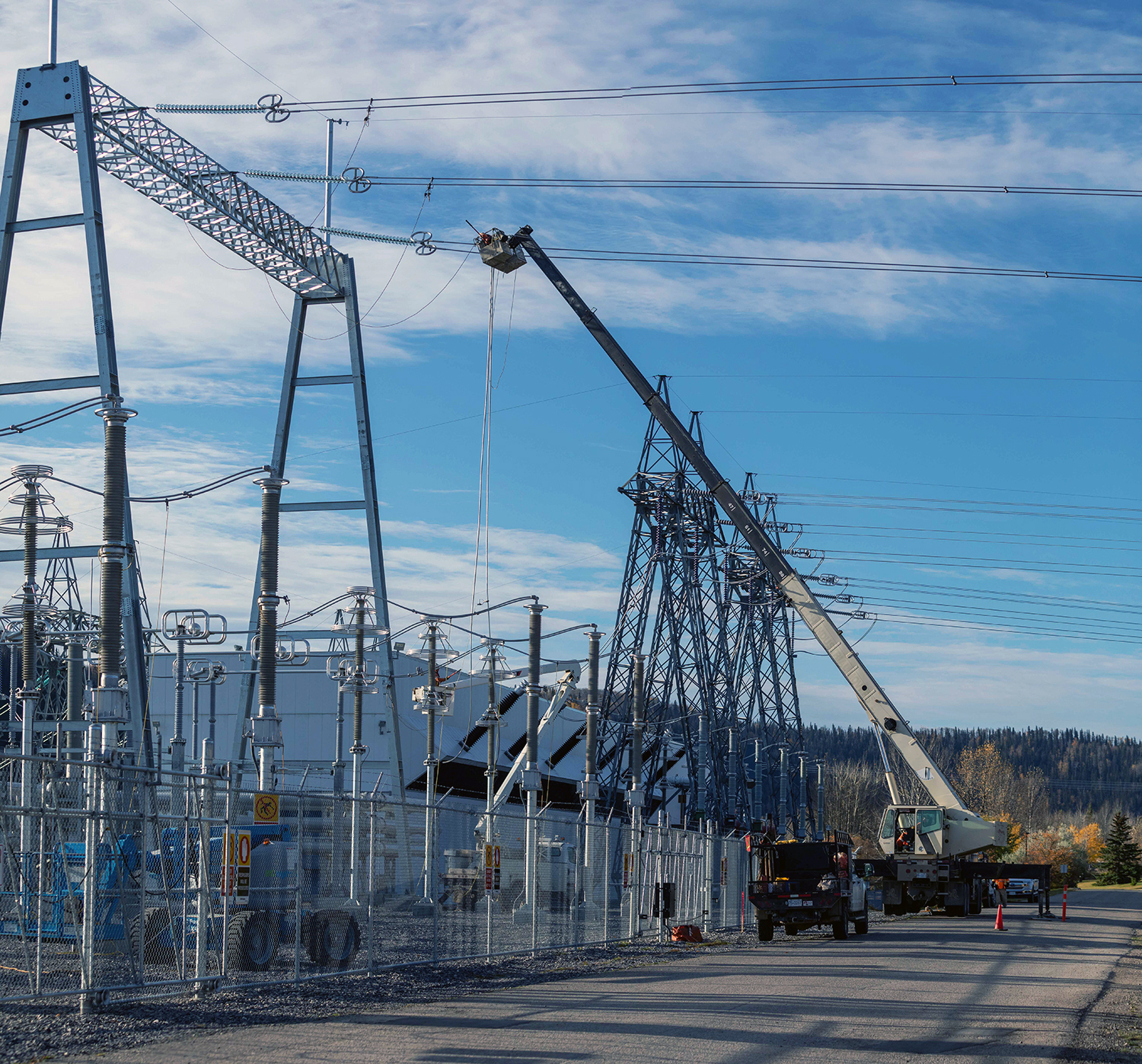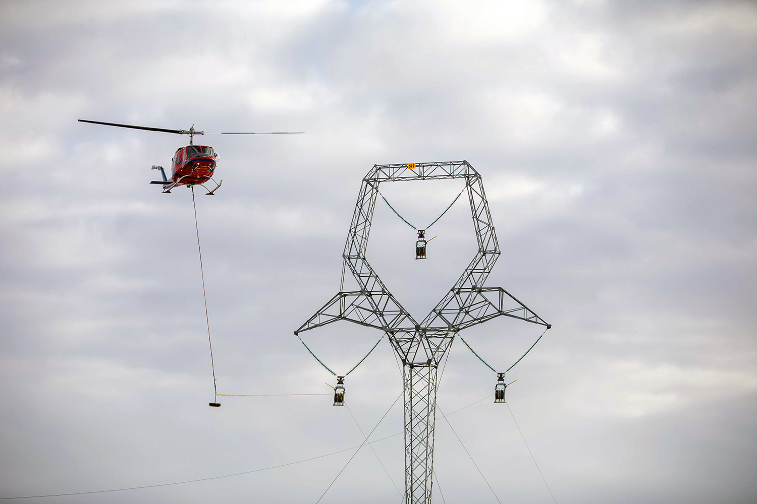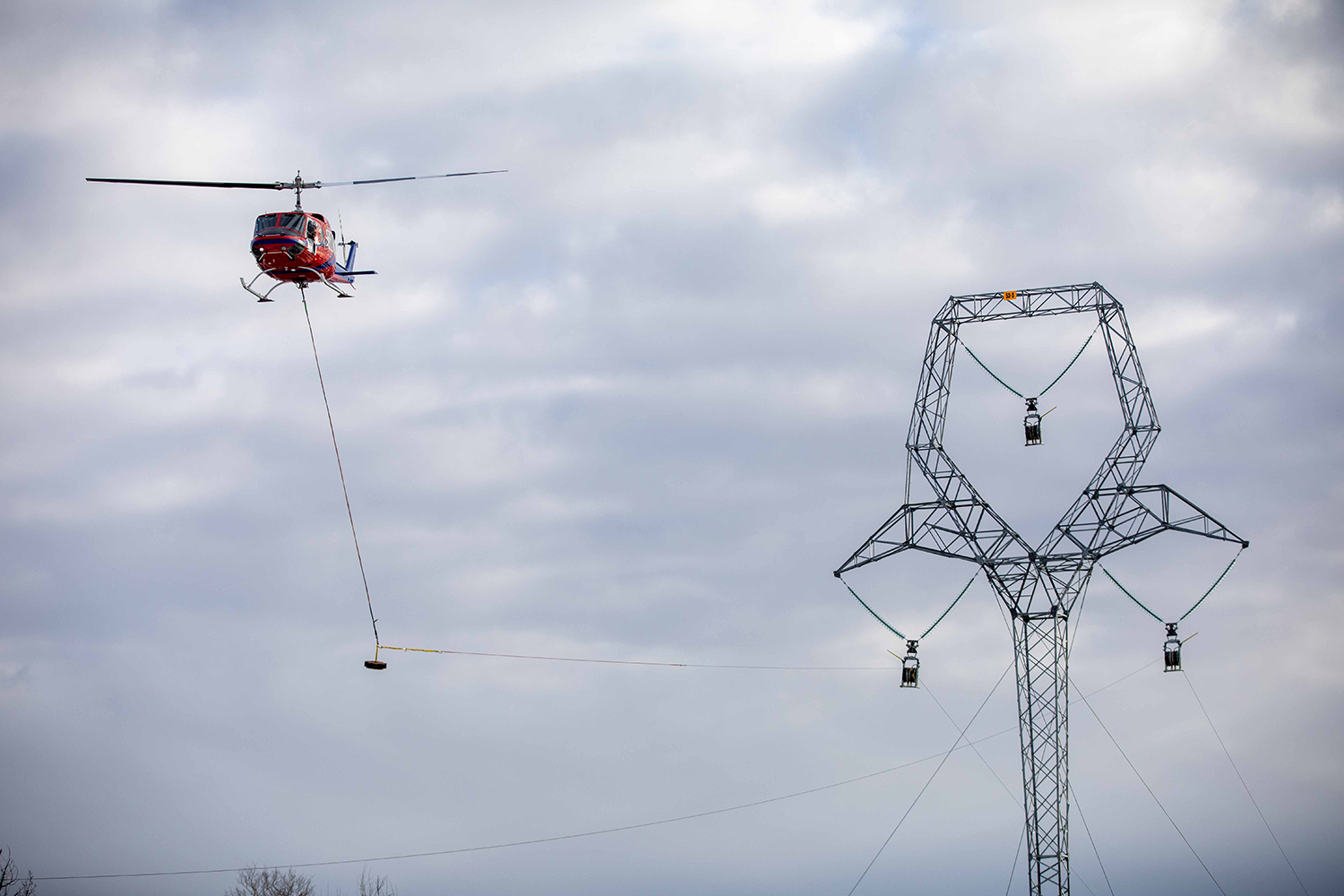 Helicopters are used to string the sockline between the transmission towers. (April 2020)