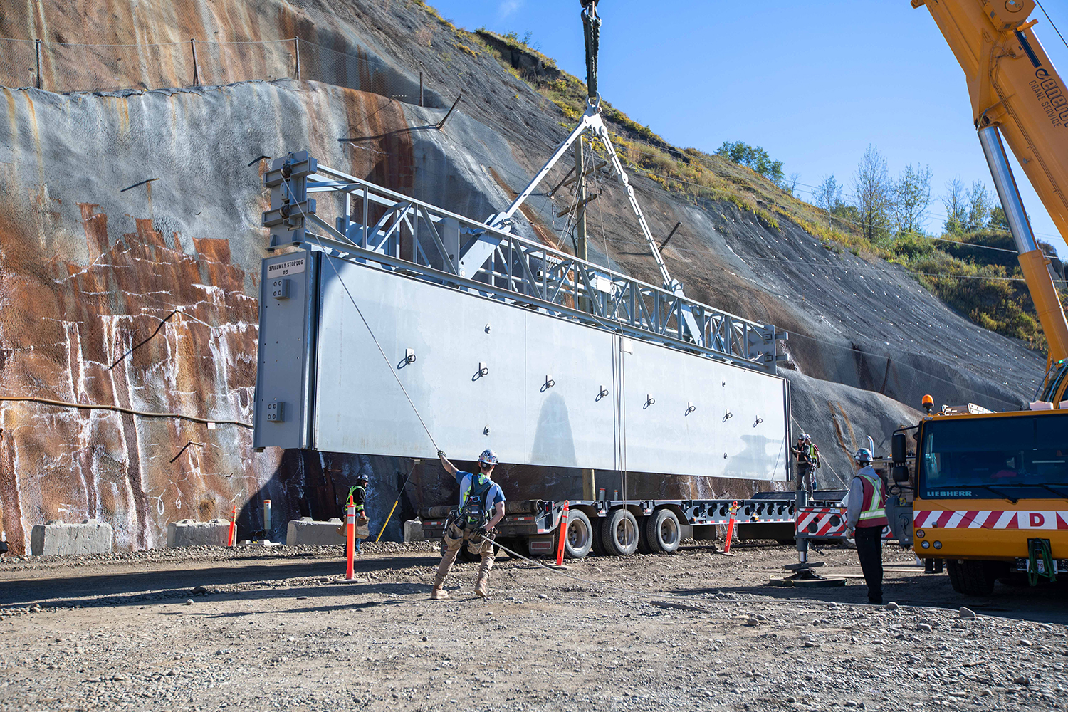 One of eight stoplog segments (each weighing 24,000 kg) being removed and stored. (September 2020)
