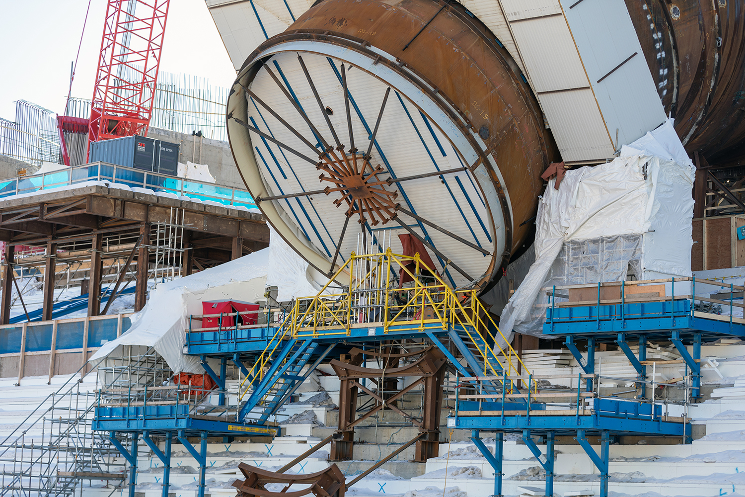 Welding enclosure lifted away from the lower portion of the penstock for Unit 1. (February 2020)