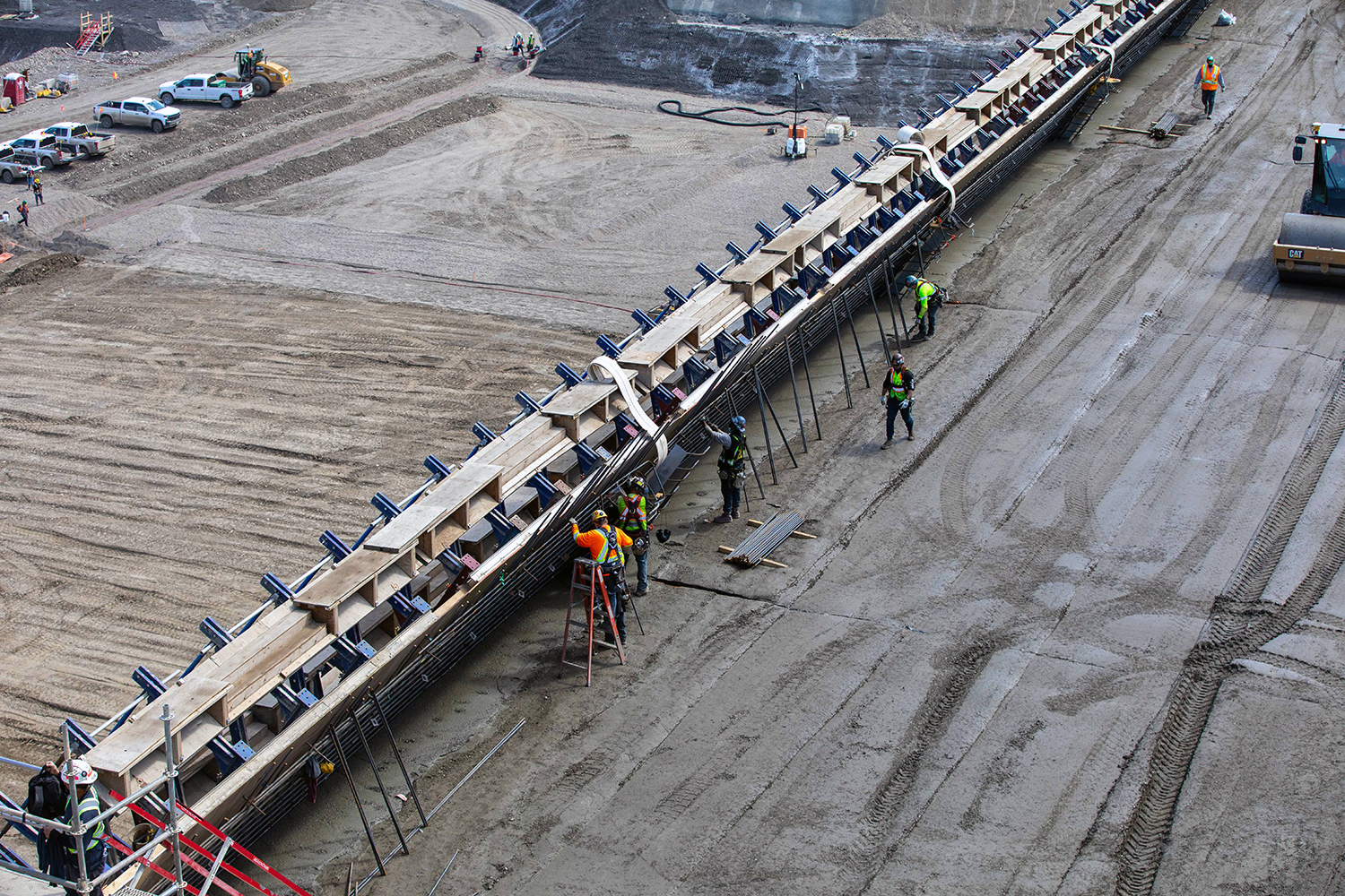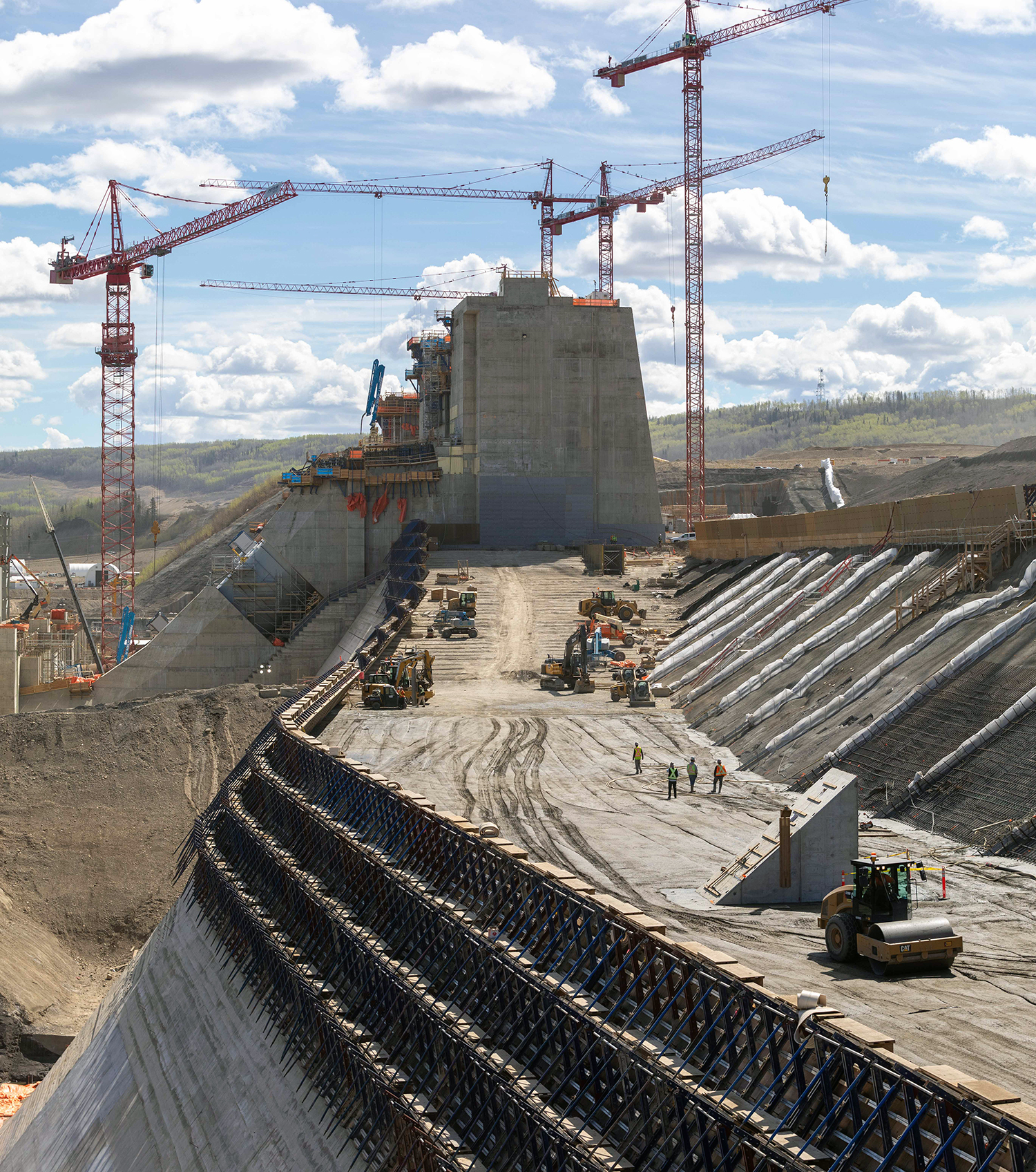 Installation of reinforcing steel on the south face of the roller-compacted concrete dam and core surface. (May 2021)
