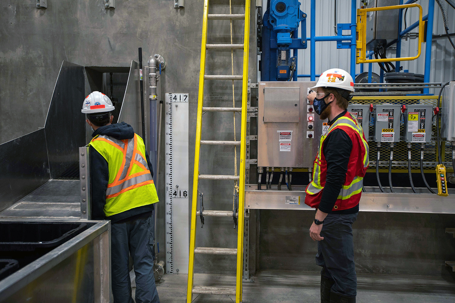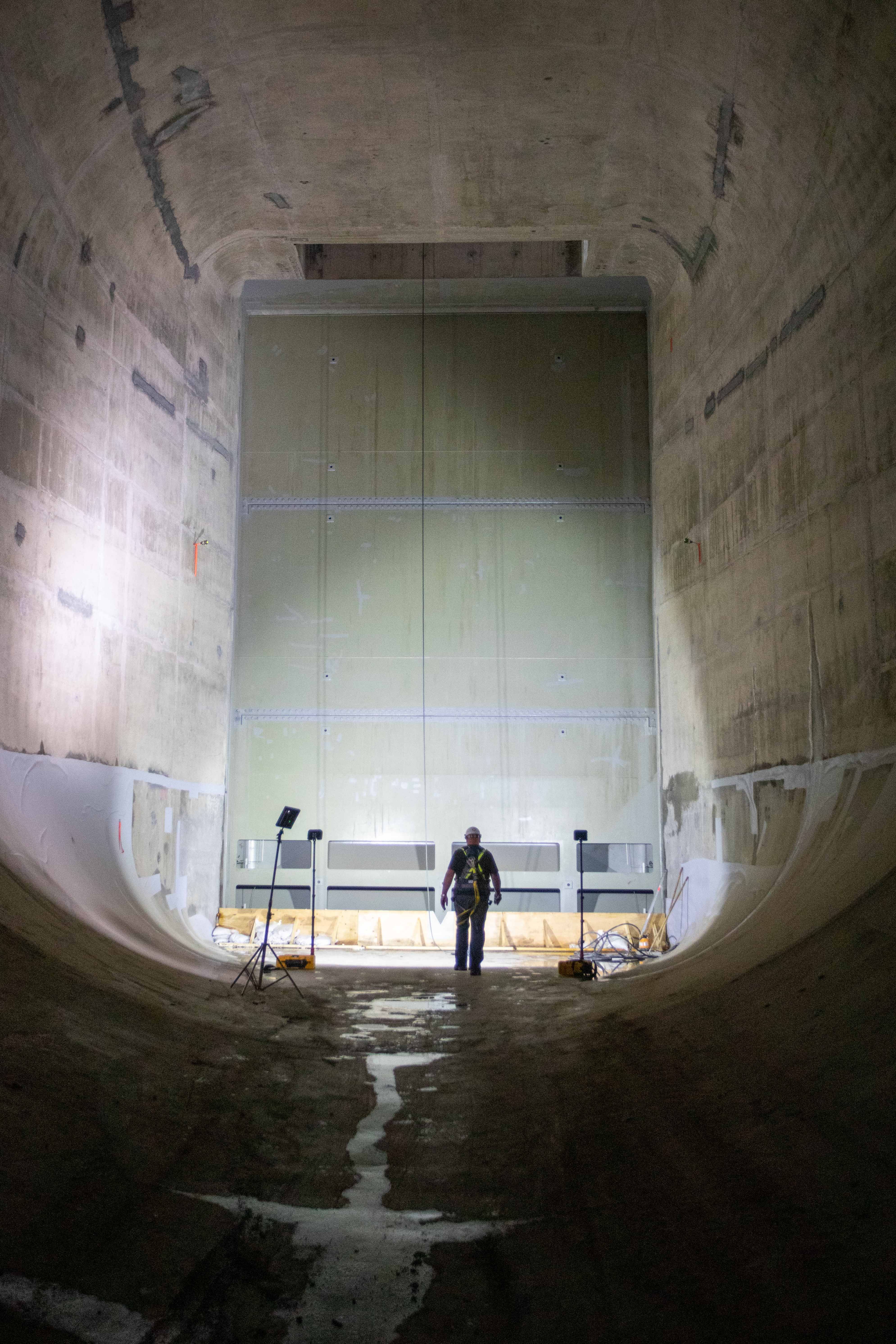 A worker inspects a gate in a diversion tunnel as part of wet testing ahead of river diversion this fall.