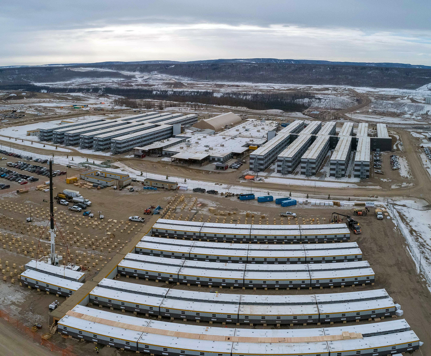 An expansion of the Site C worker accommodation lodge is underway. These wooden cribs are installed to prepare for the 450-bed camp expansion. The existing lodge is in the background. (March 2020)