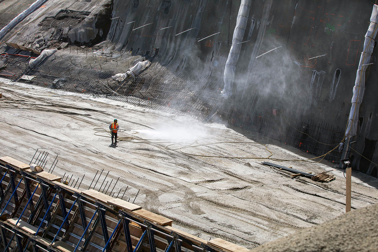 A worker sprays mist on the roller-compacted concrete surface before the next layer of concrete is placed. (May 2021)