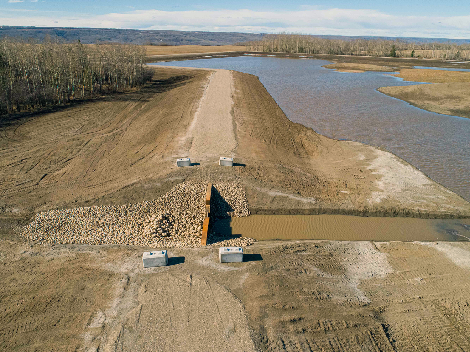 The earthen dam in the main basin in the restored Golata Creek wetlands allows control of the water level. (April 2020)