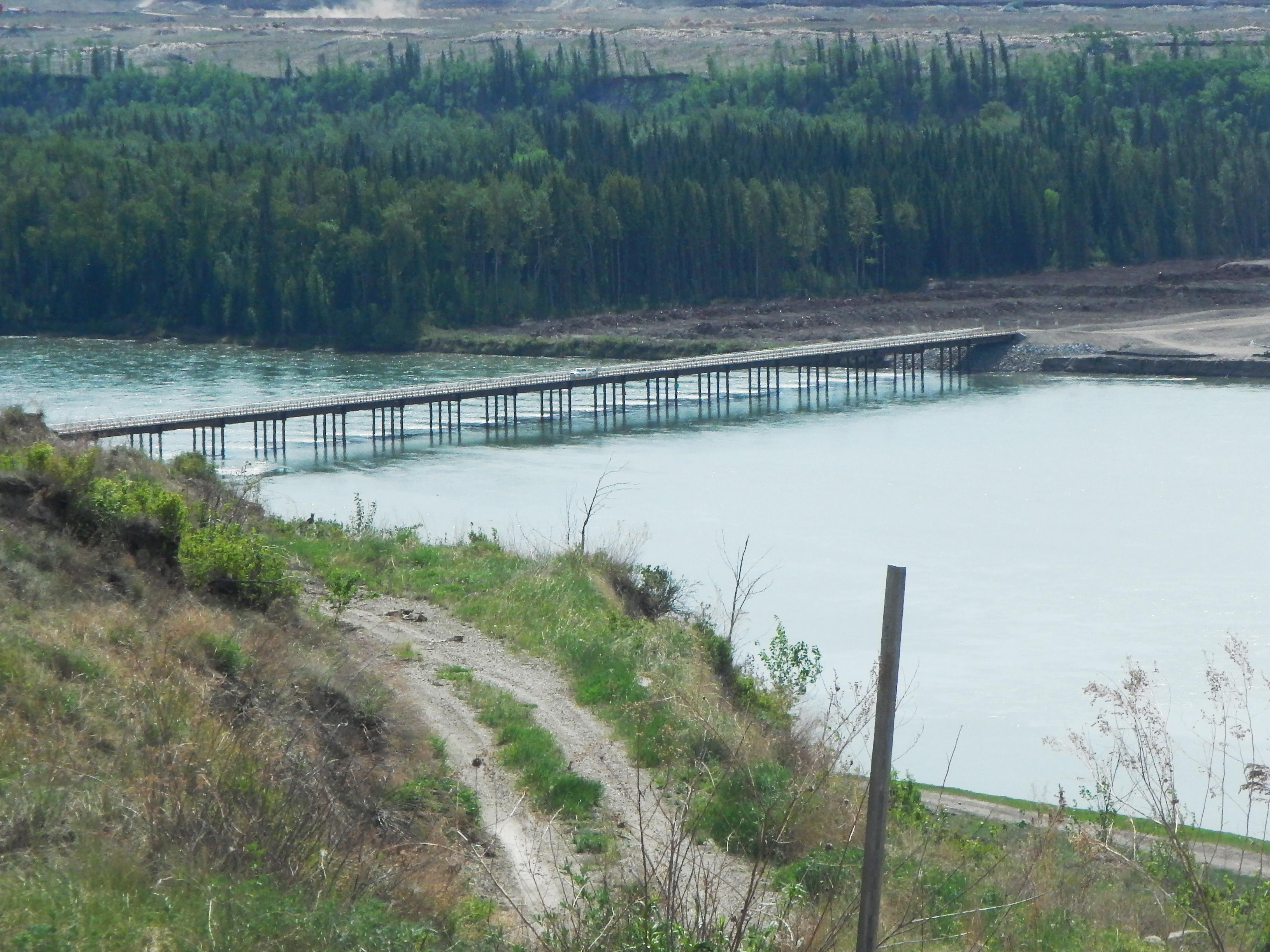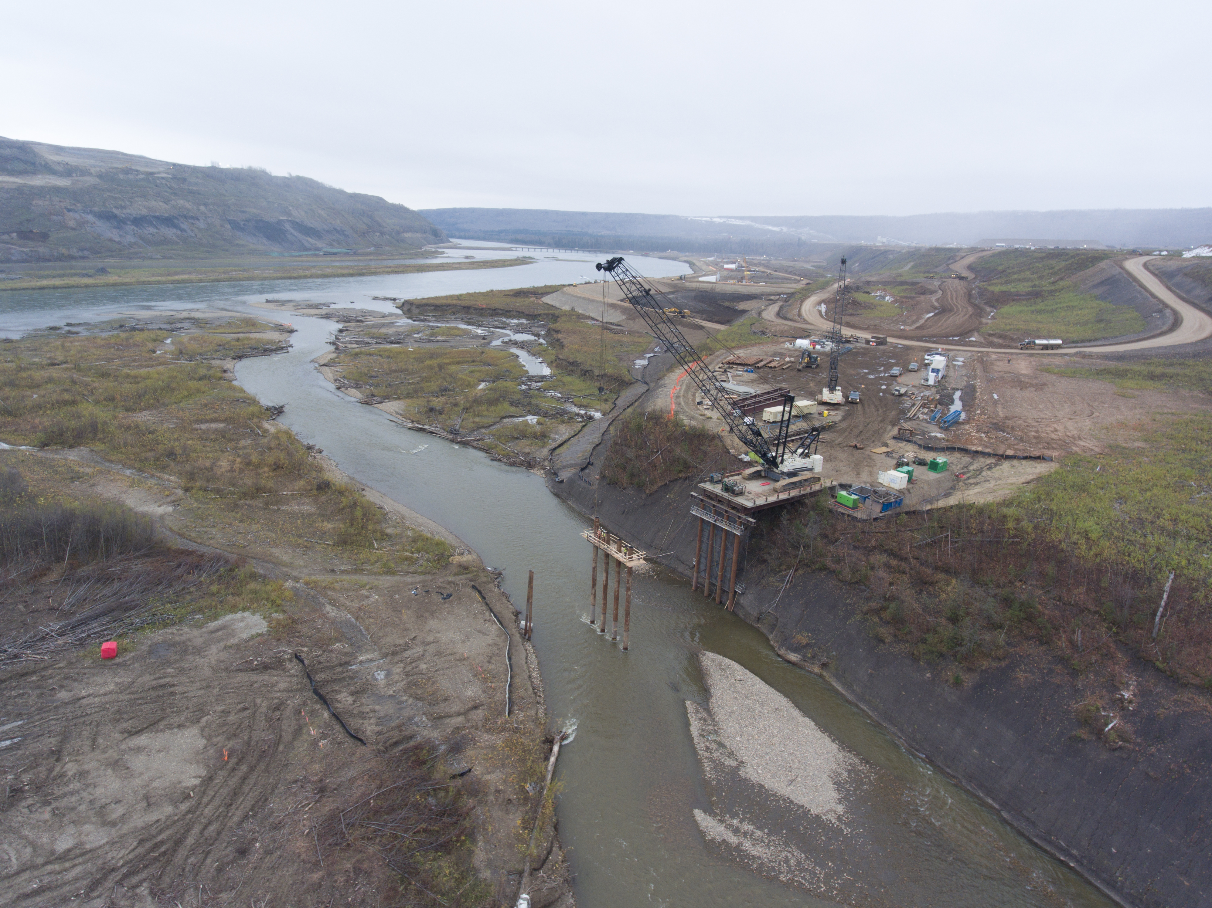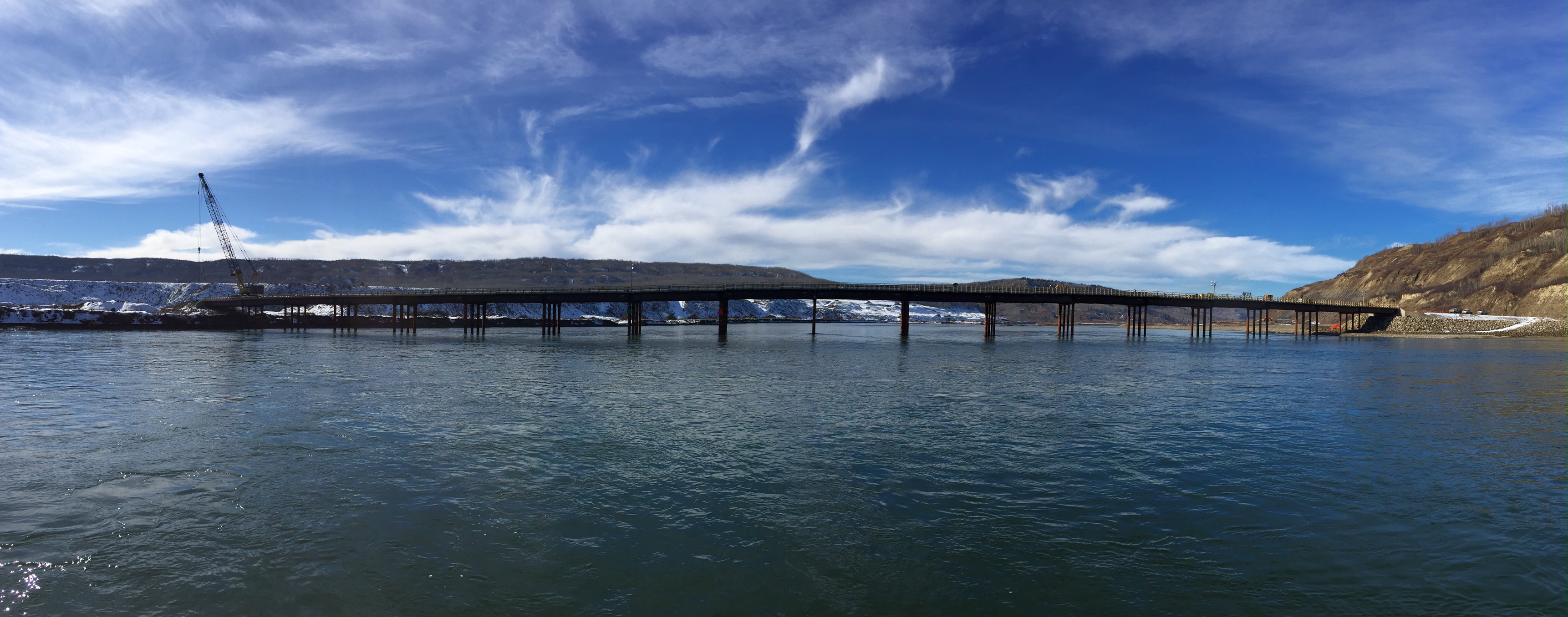 Temporary Peace River construction bridge in use. (October 2016)