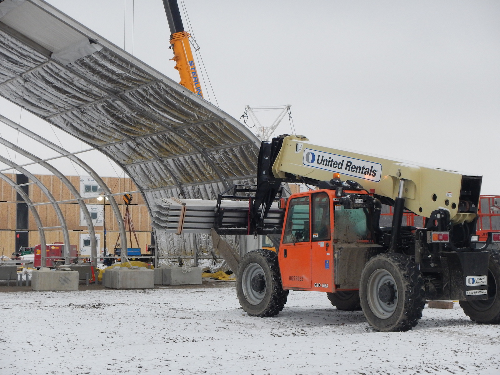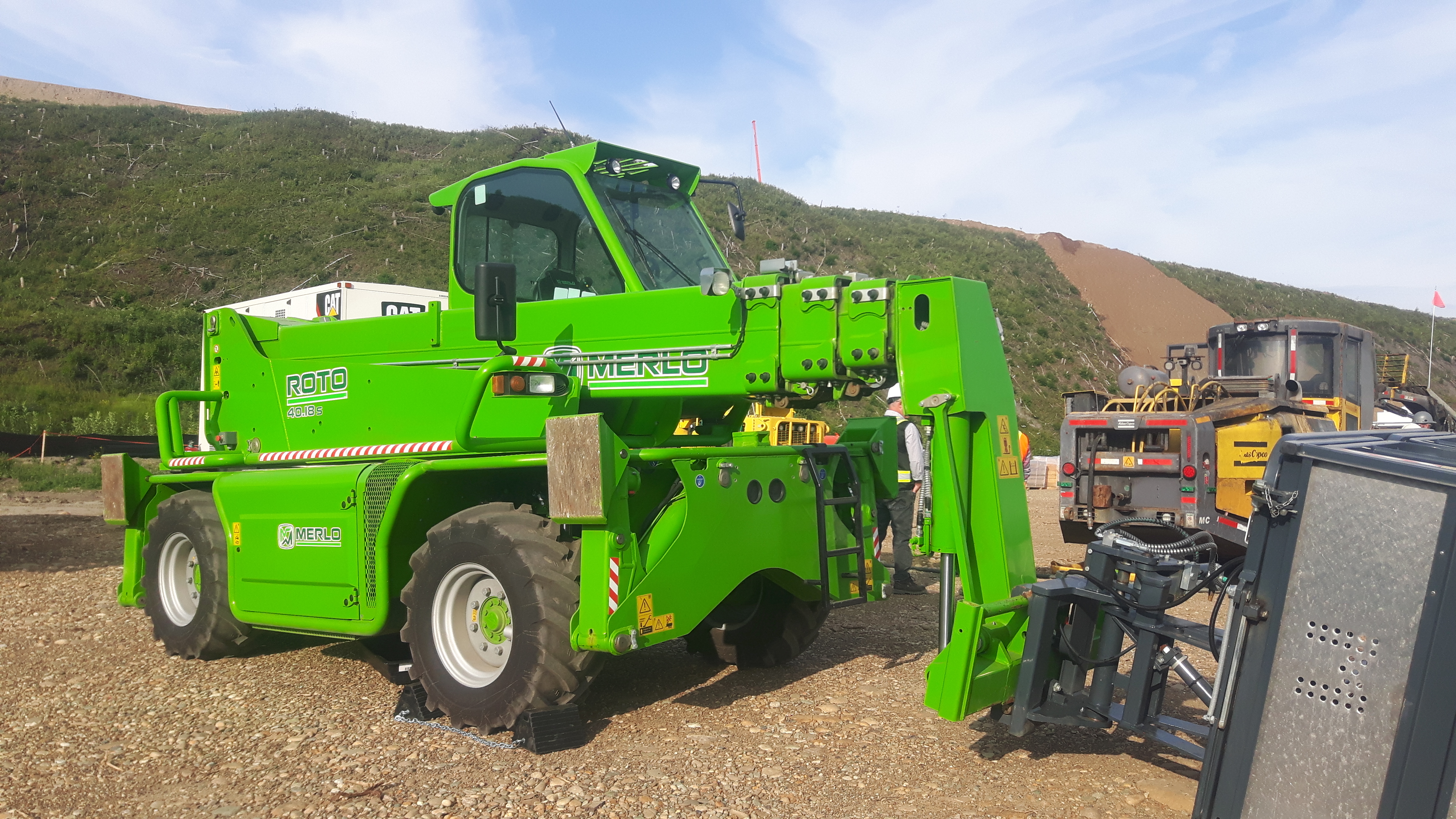 Peace River Hydro Partners continue equipment mobilization including this Merlo Roto 40.18s Rotary Telehander with manbasket, forks and bucket. (August 2016)