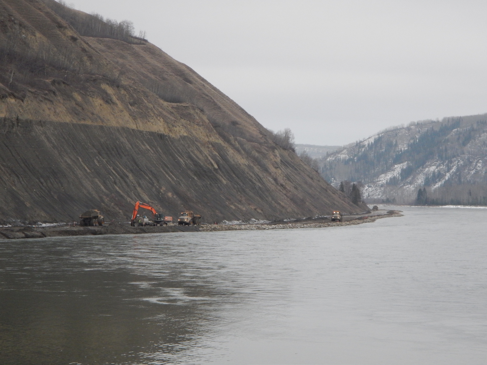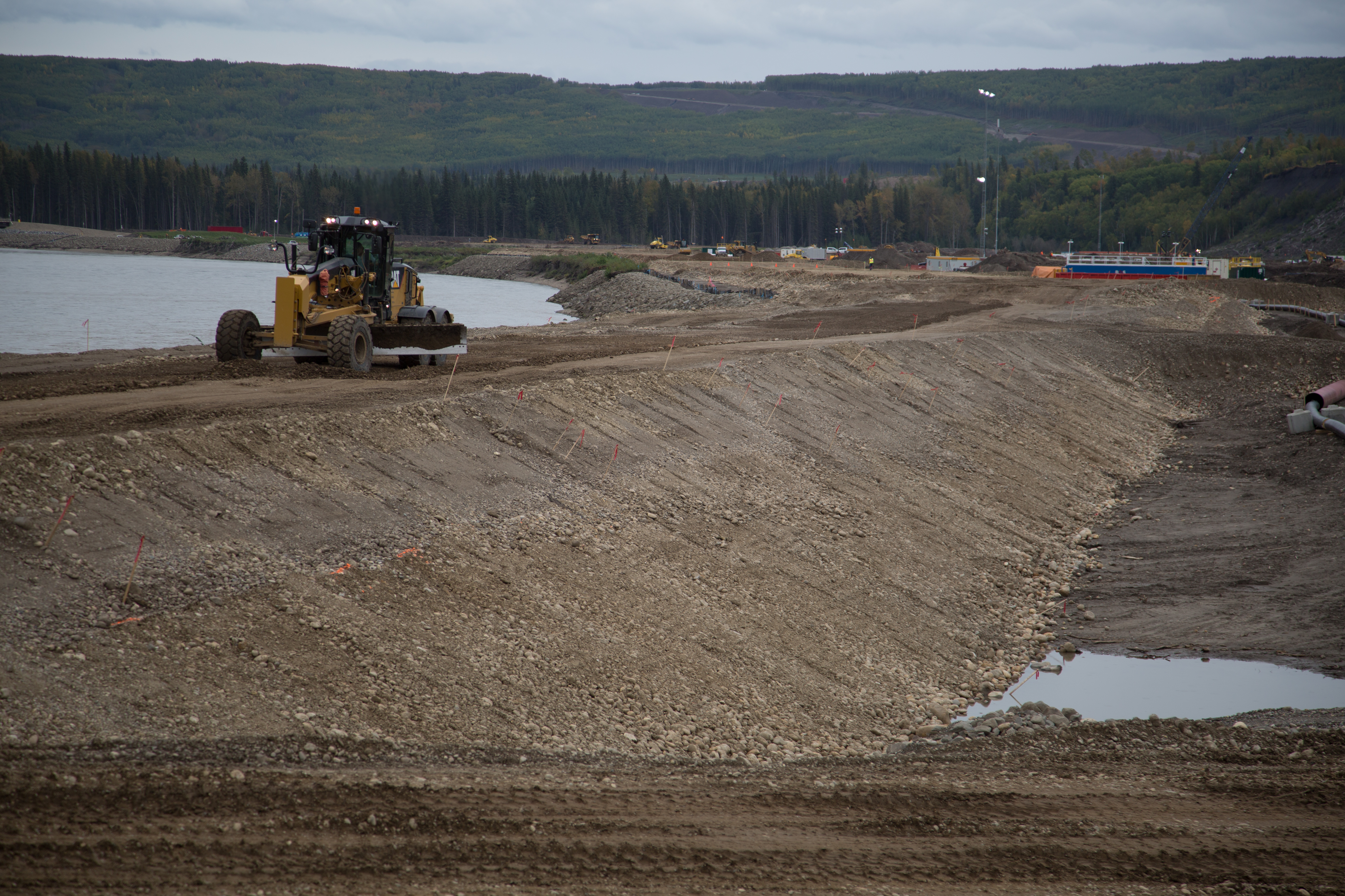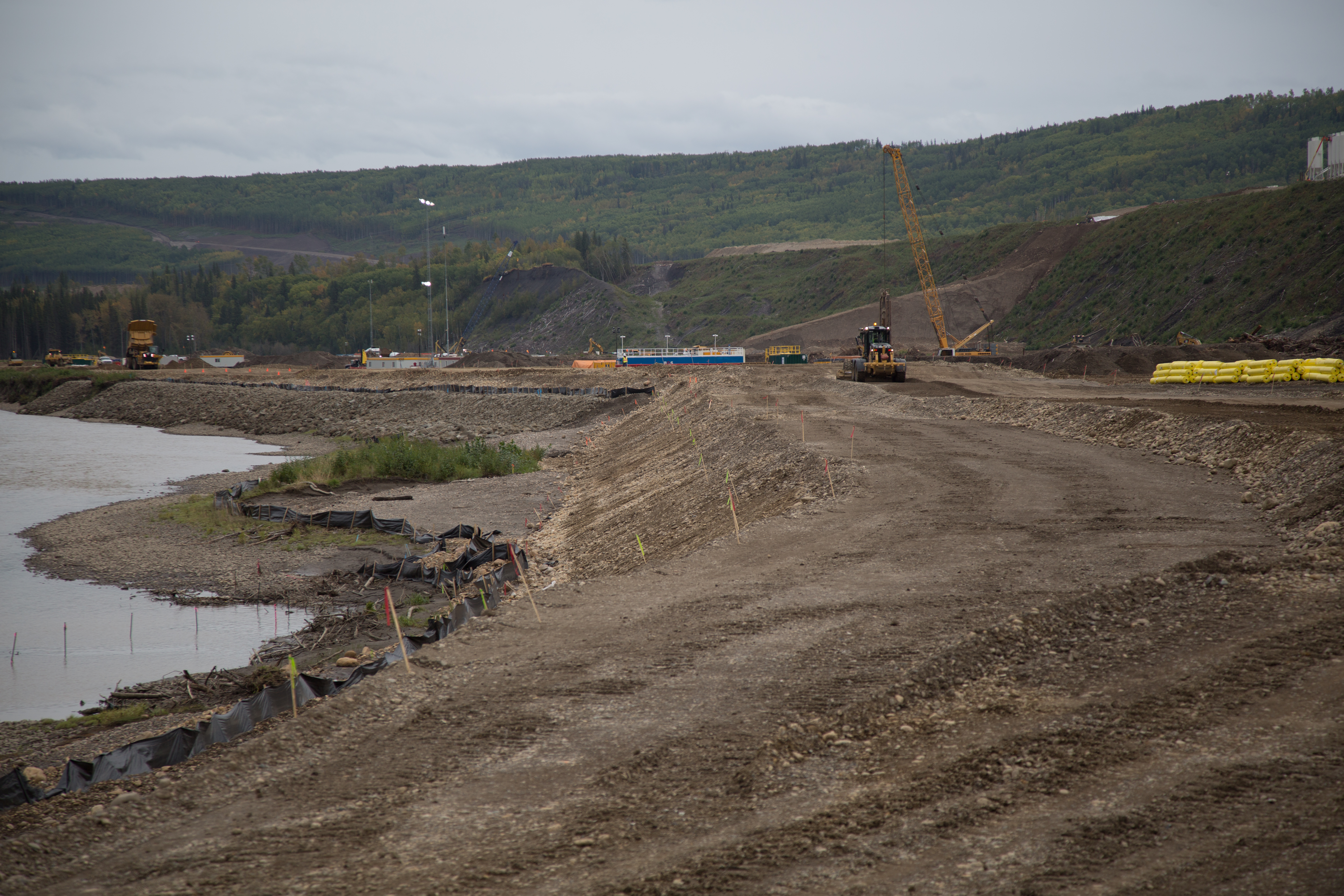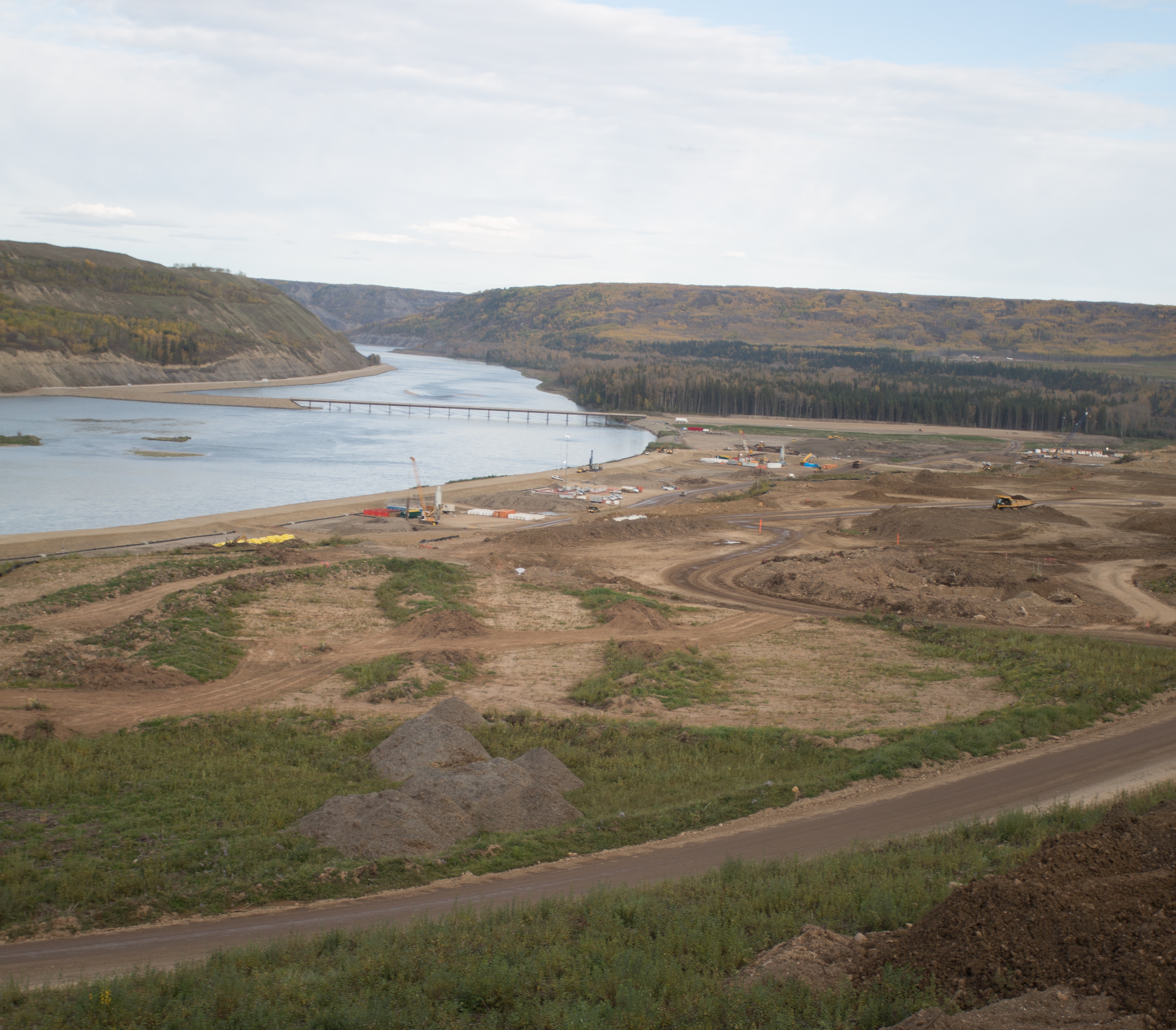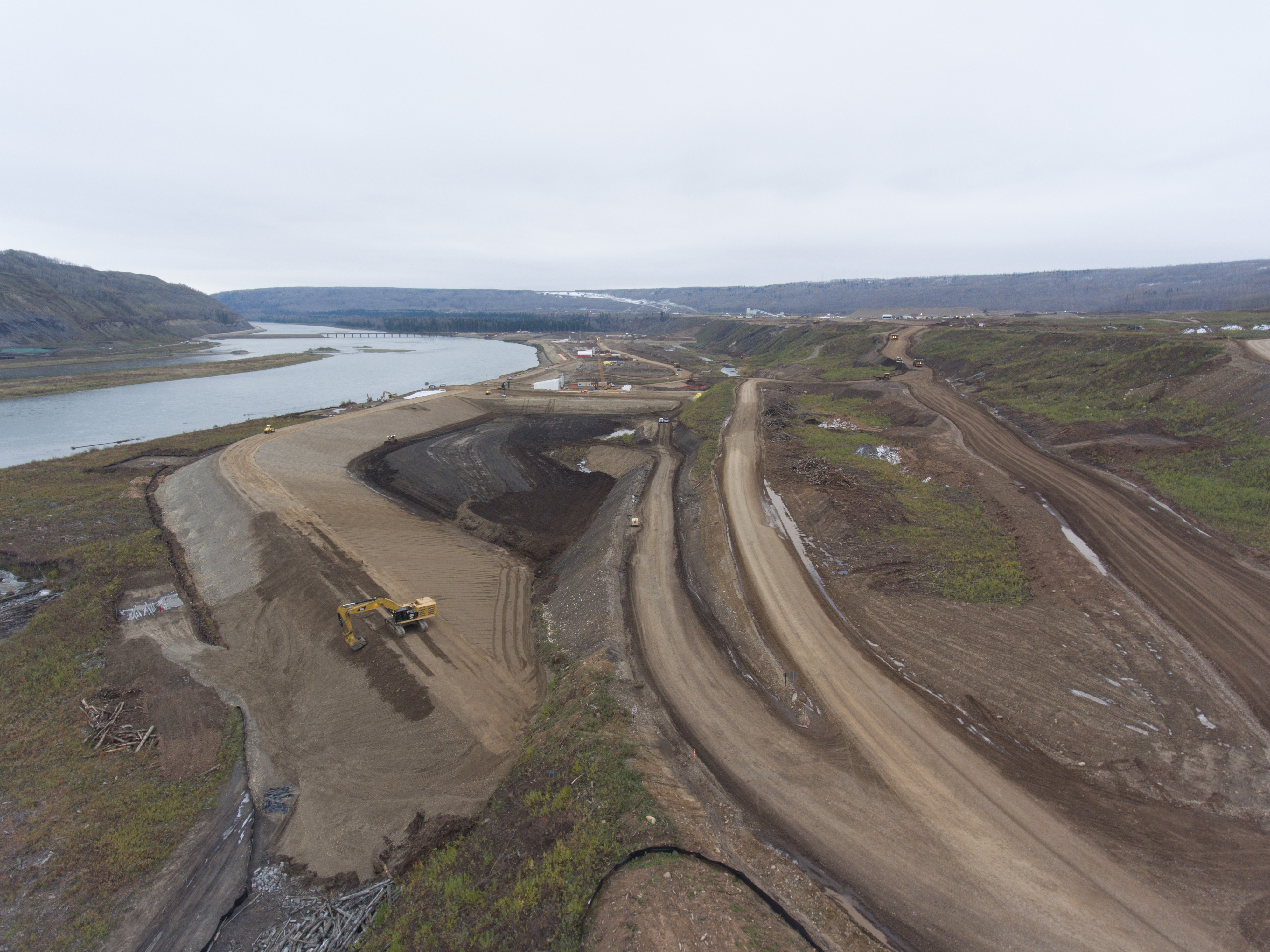 Construction of a storage area for relocated excavated material on the north bank of the dam site, upstream from the Peace River construction bridge. (October 2016)