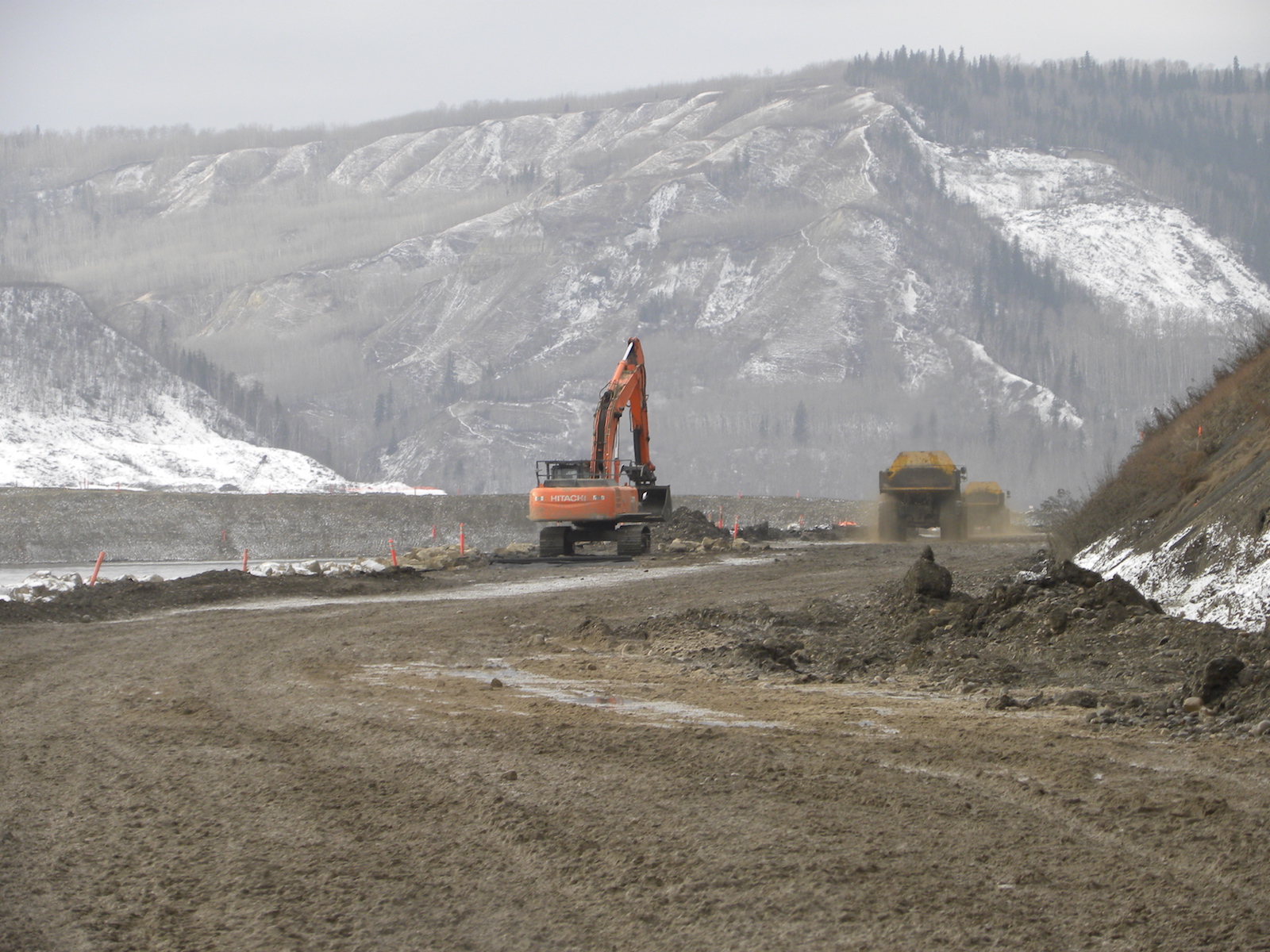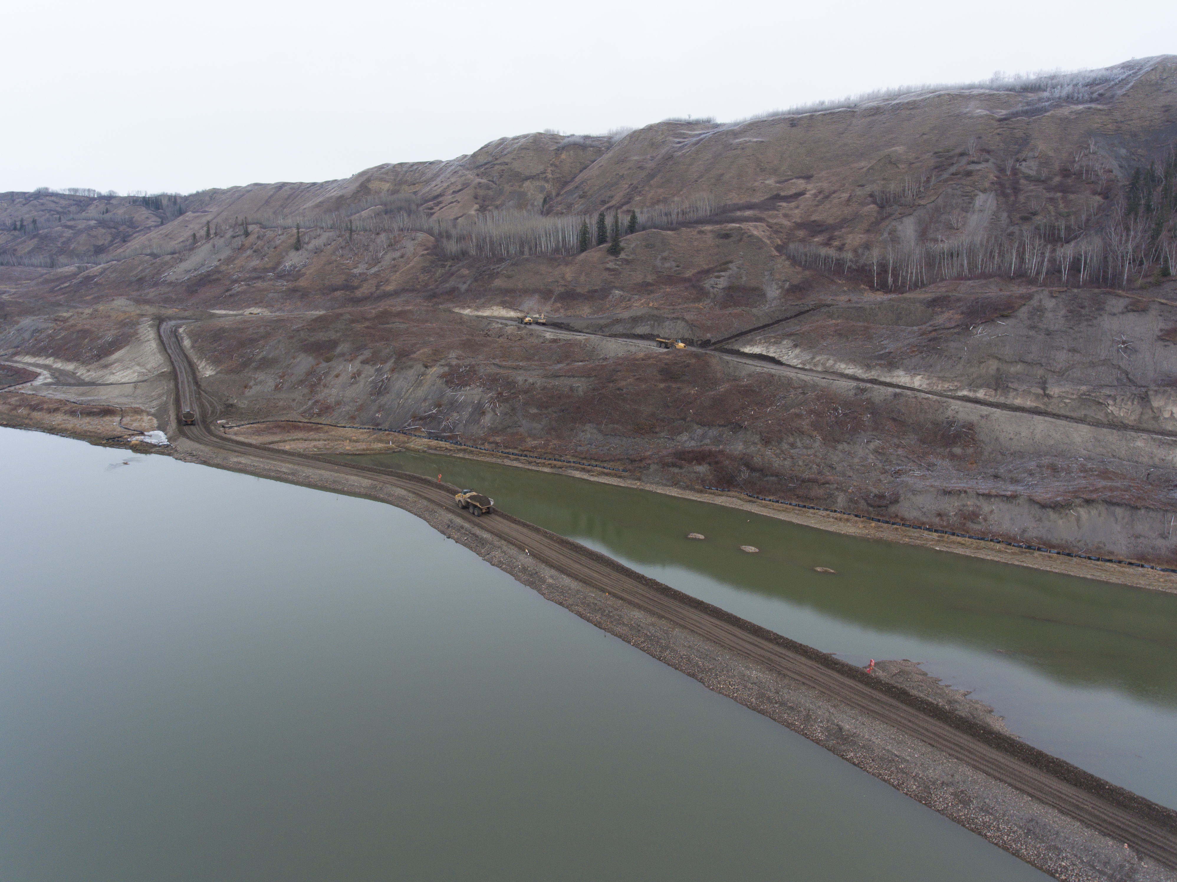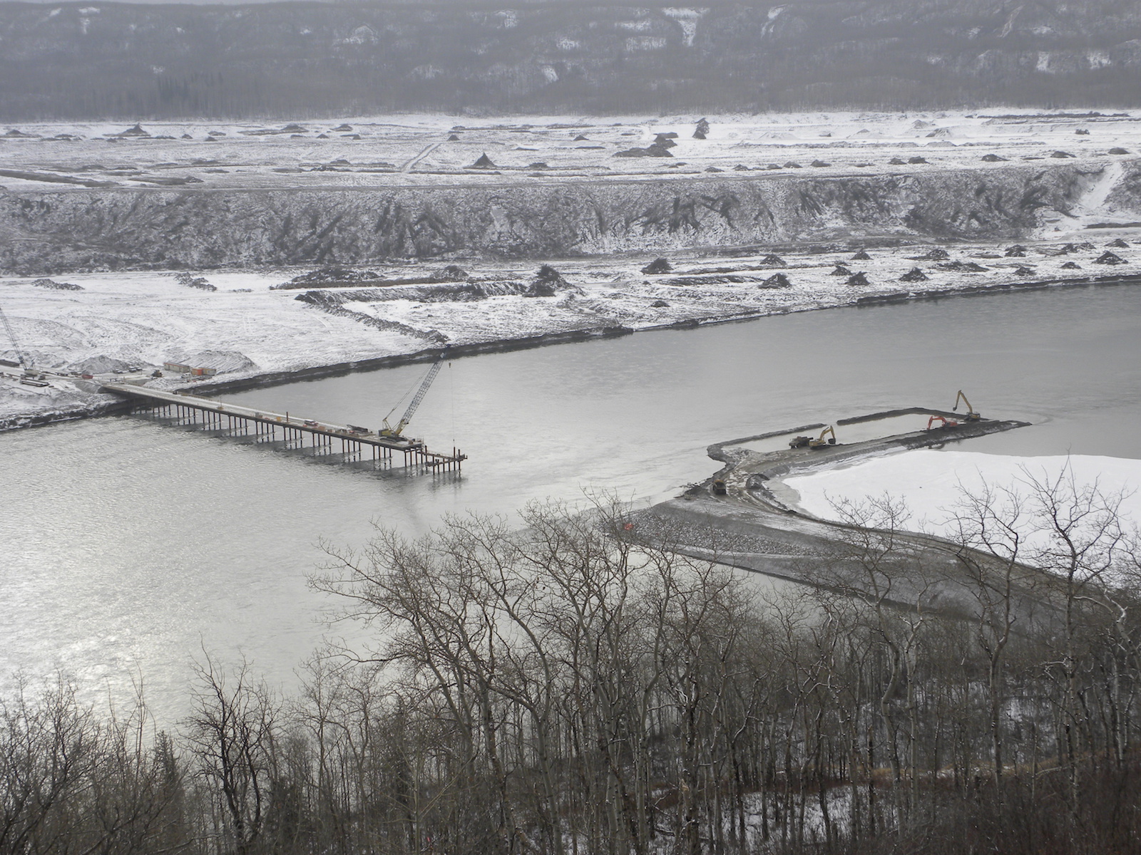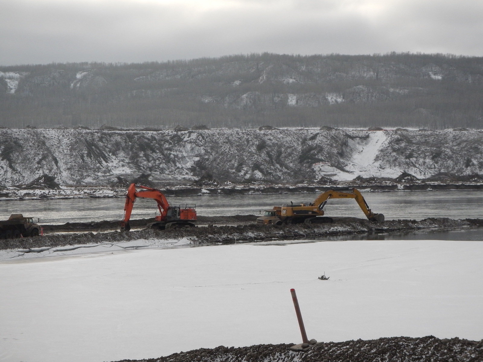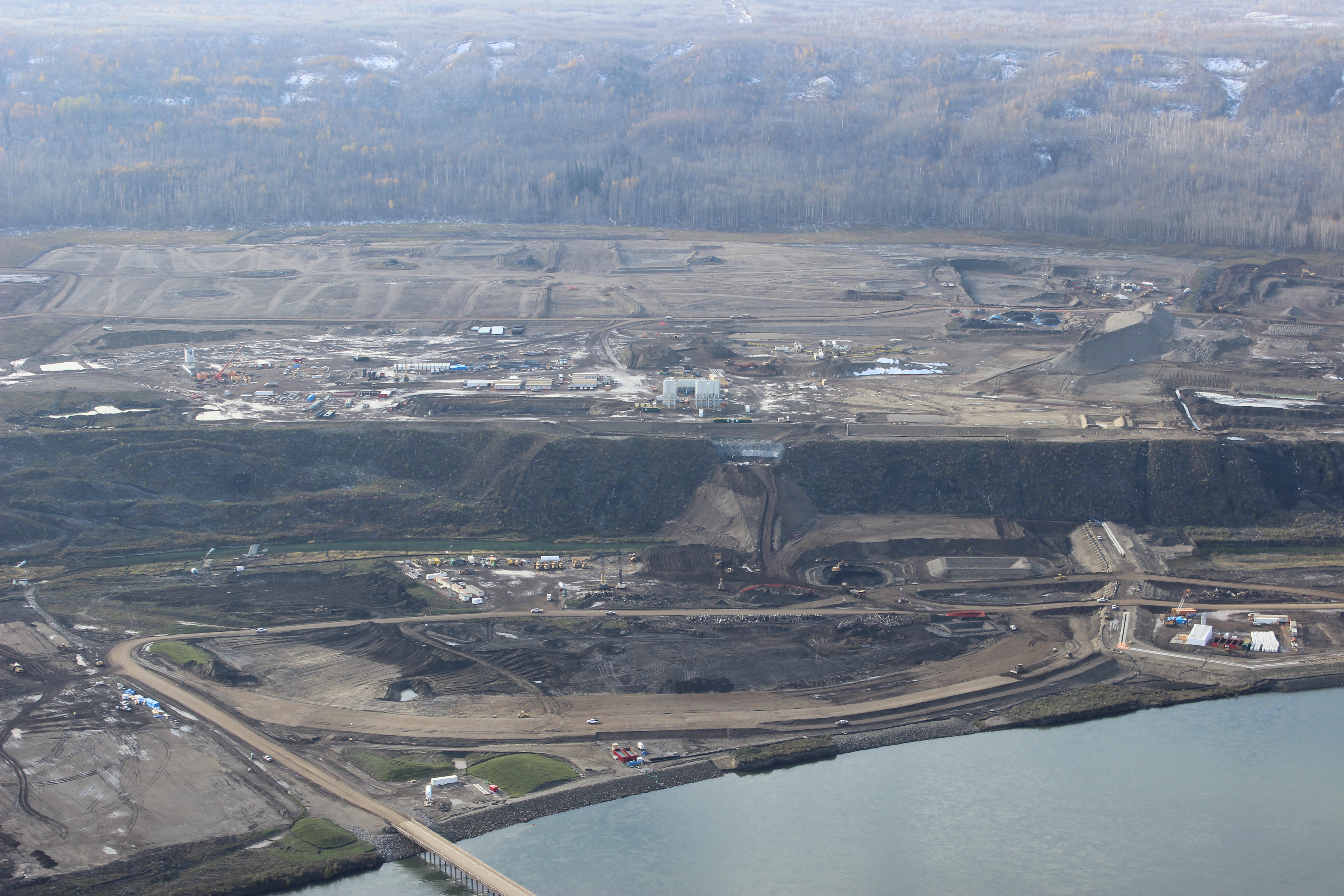 Construction of a storage area for relocated excavated material on the north bank of the dam site, upstream from the Peace River construction bridge. (October 2016)