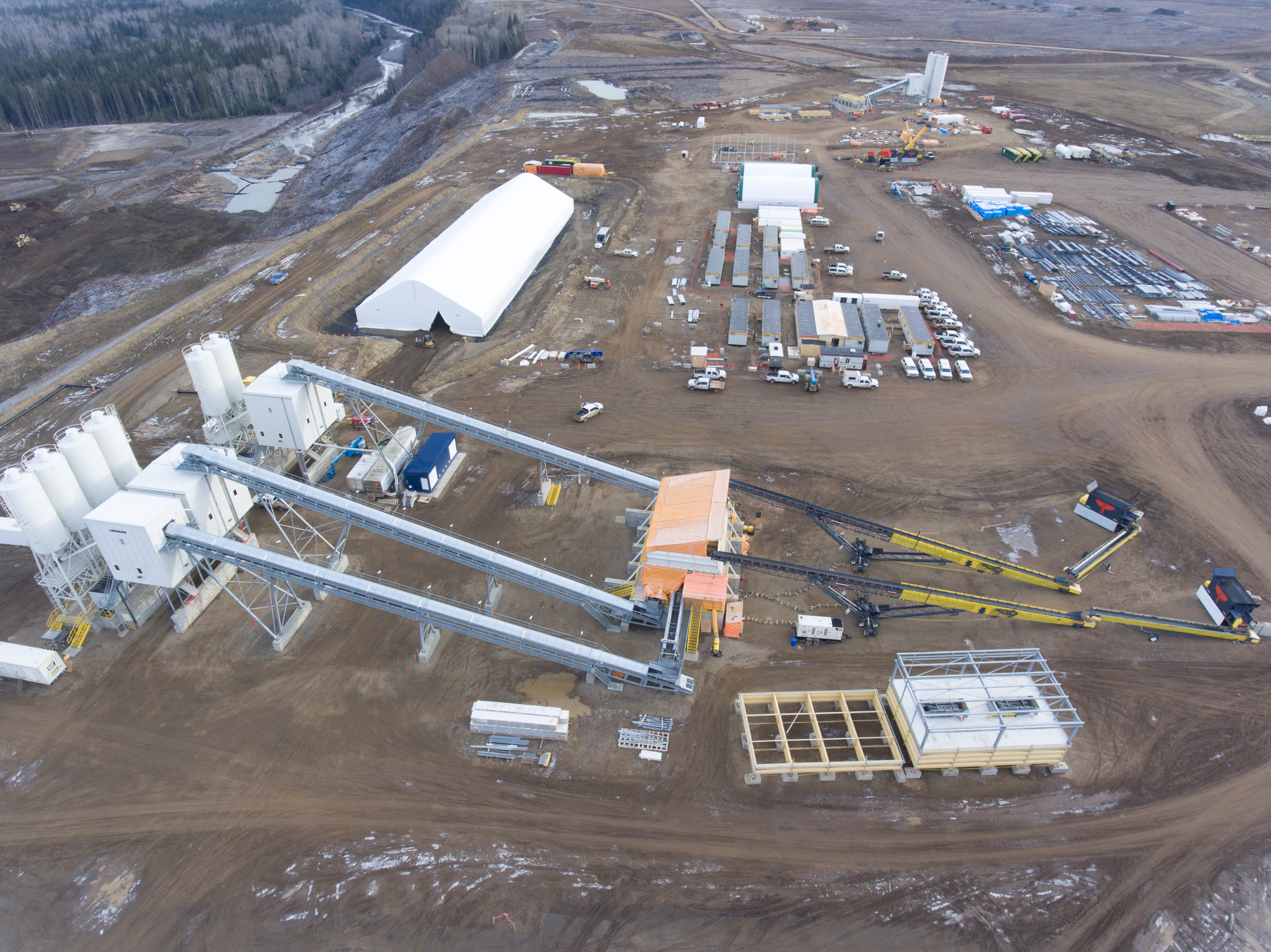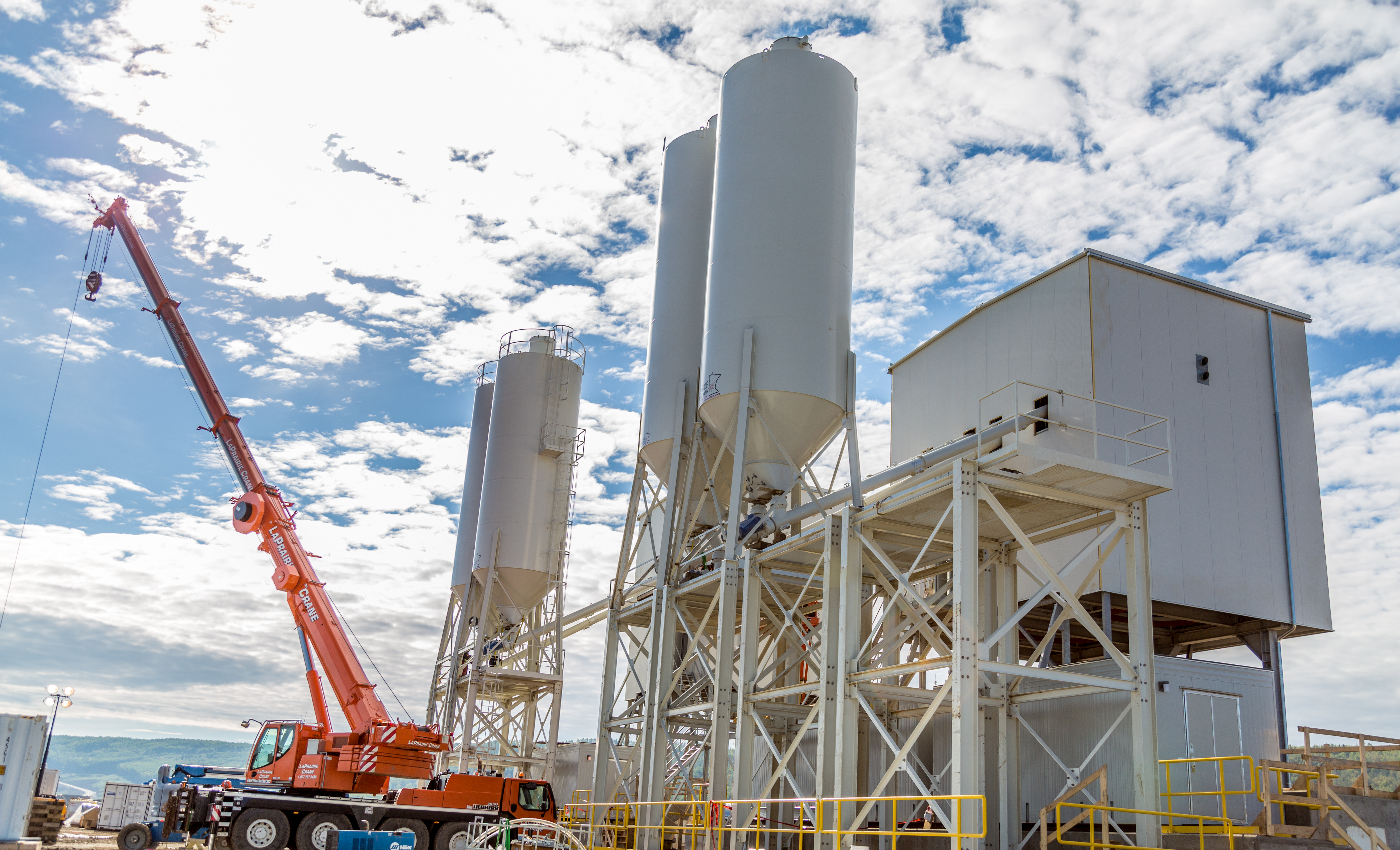 The south bank batch plant, installed by Peace River Hydro Partners, will be used in the construction of the roller compacted concrete buttress (i.e., foundation) for the generating station and spillways. (September 2016)
