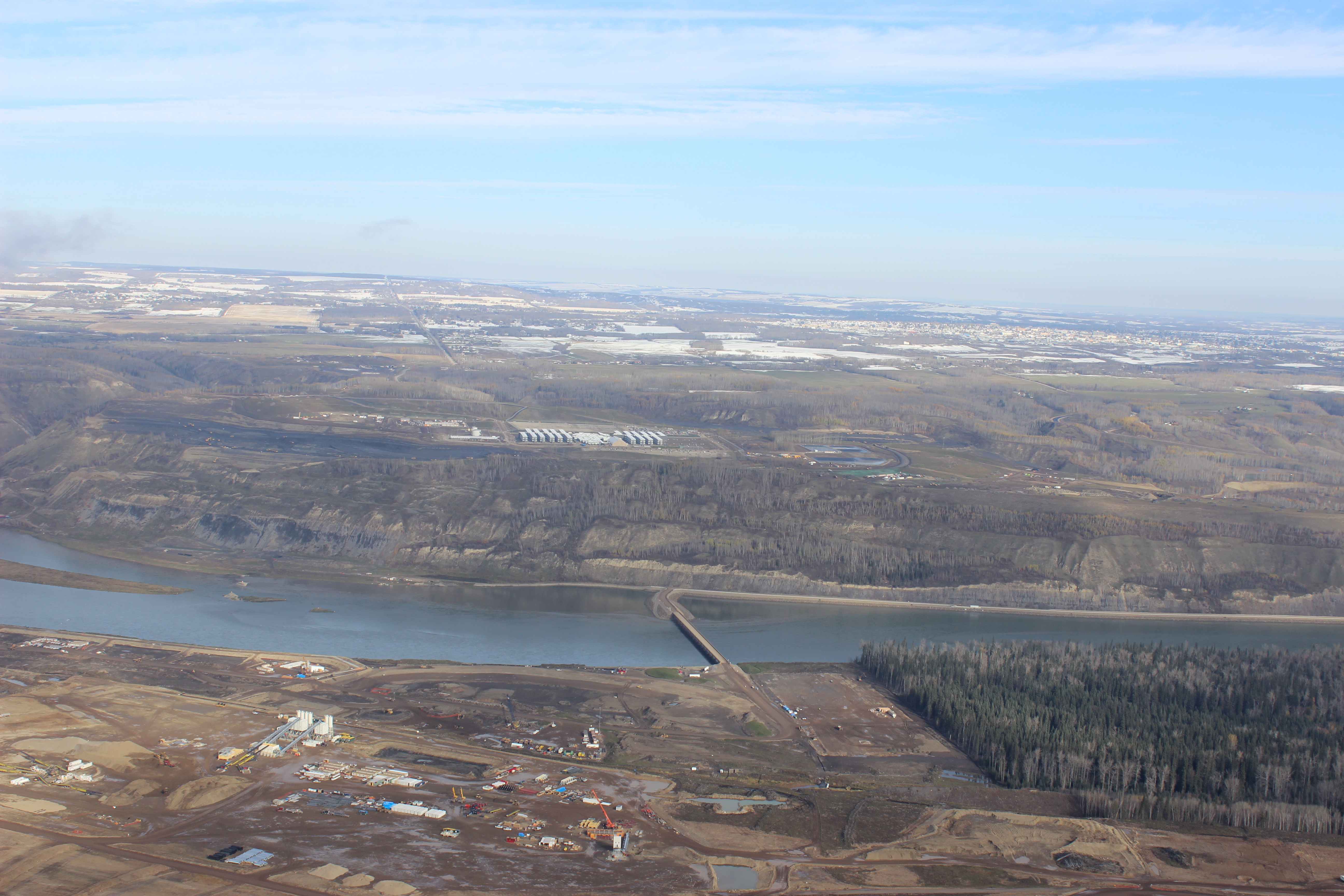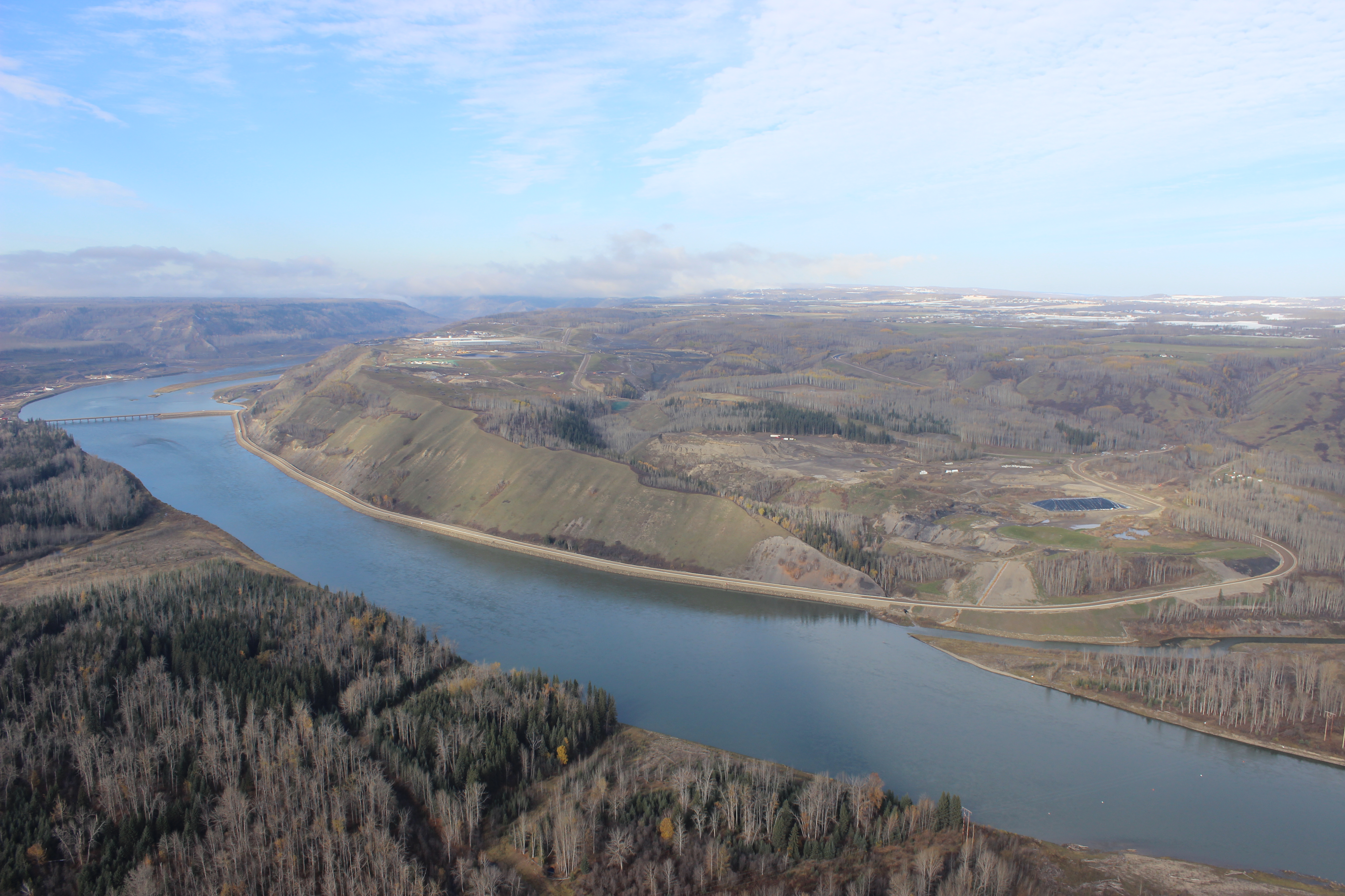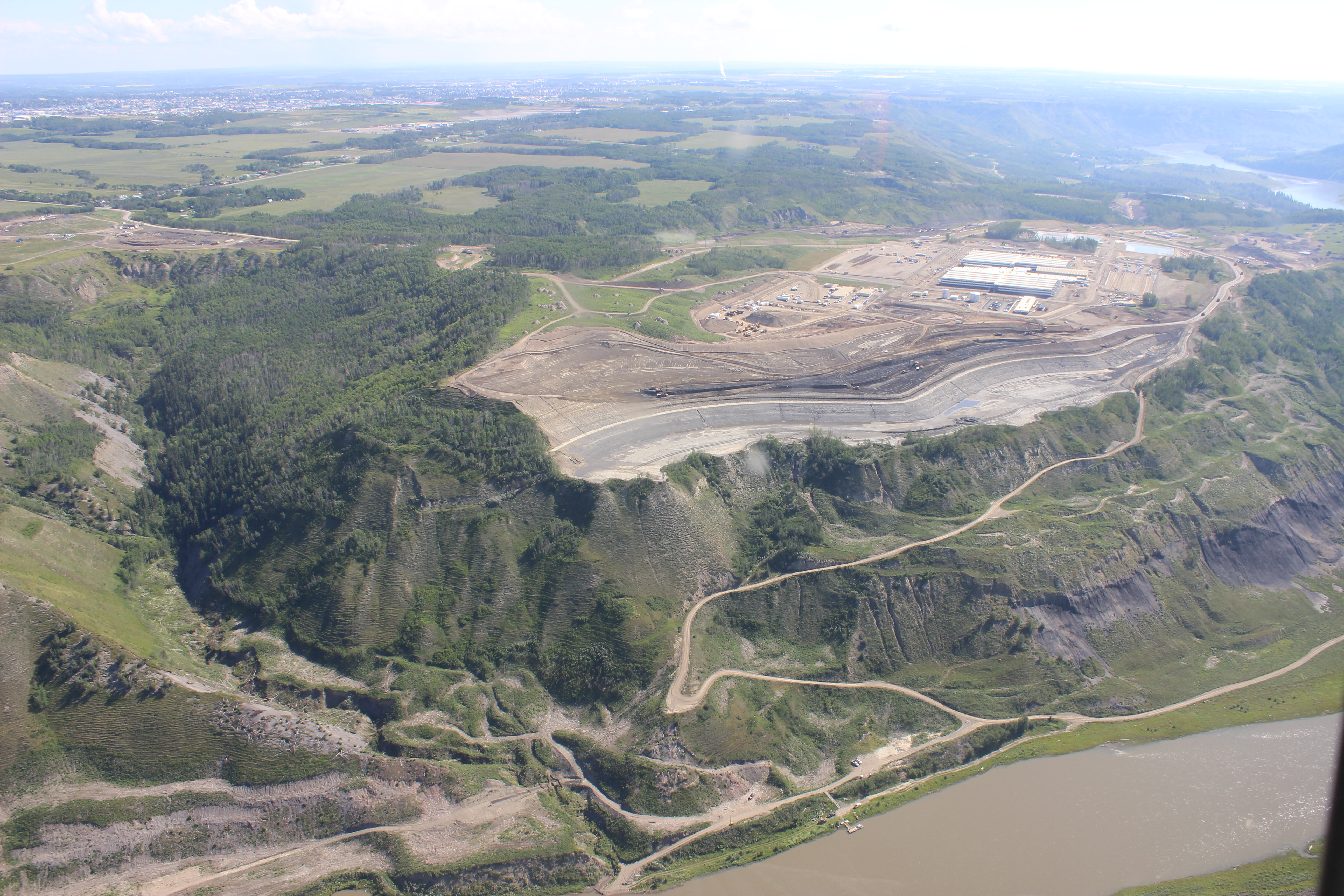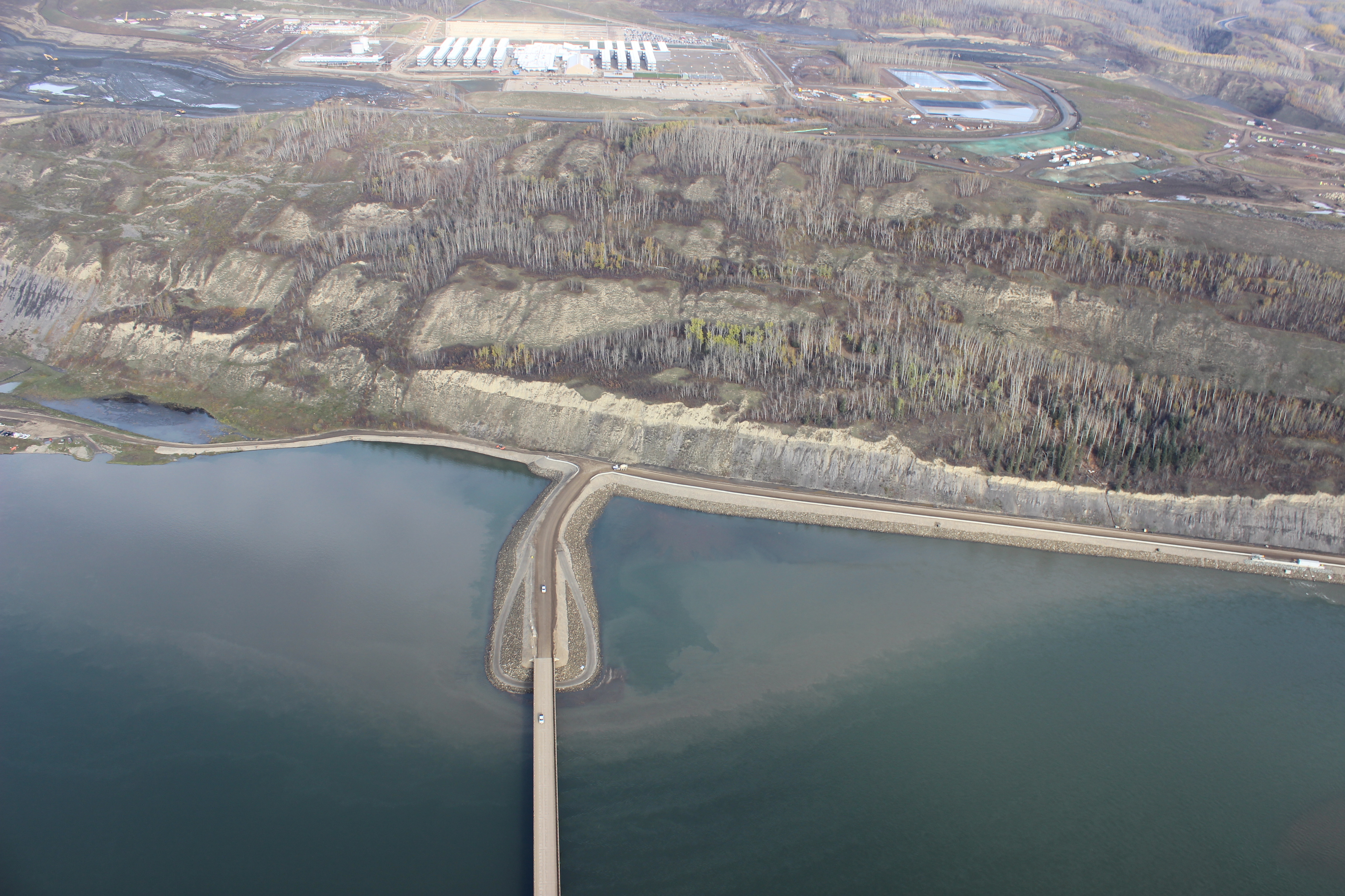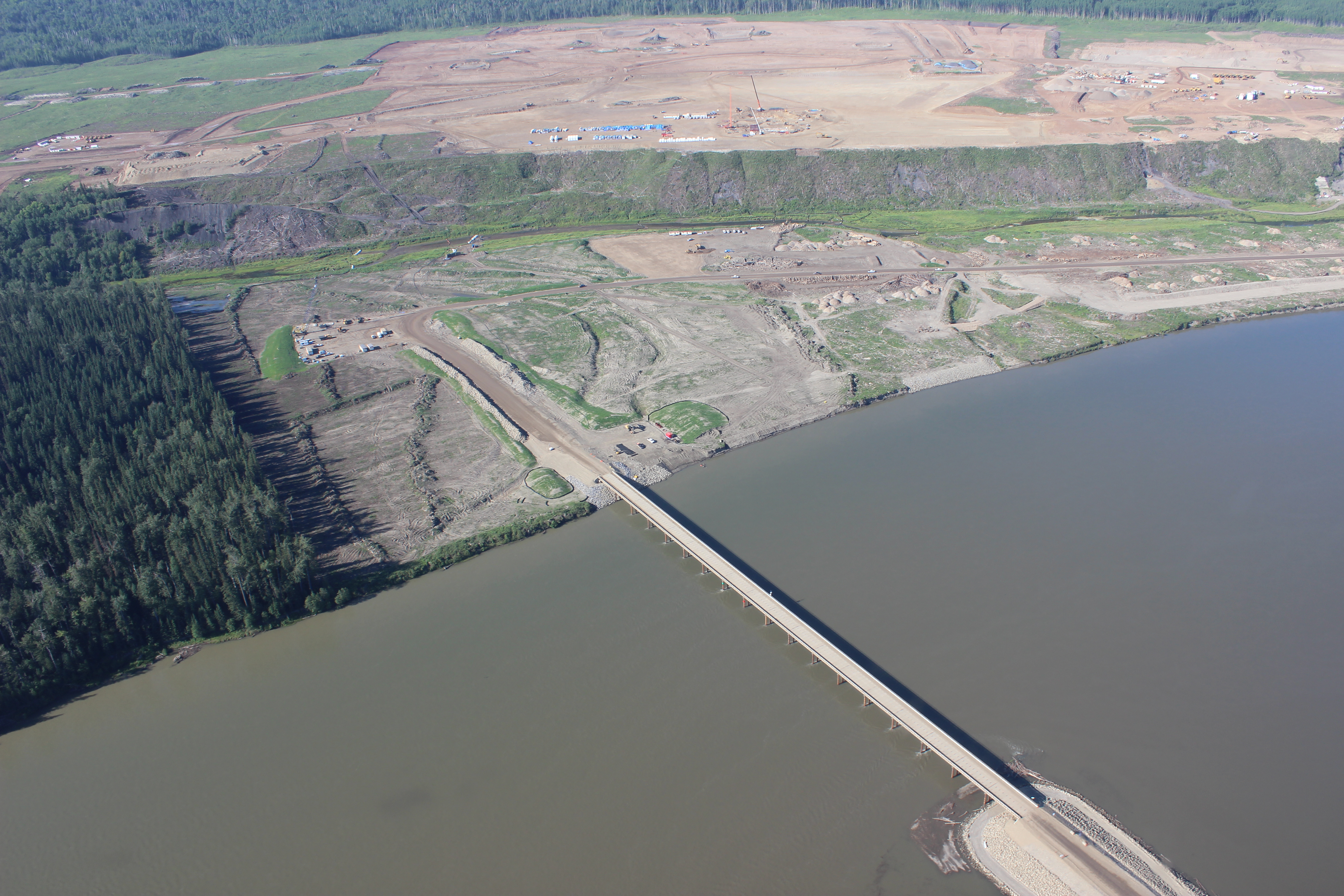 Aerial view of south bank of dam site showing the temporary Peace River construction bridge. (July 2016)