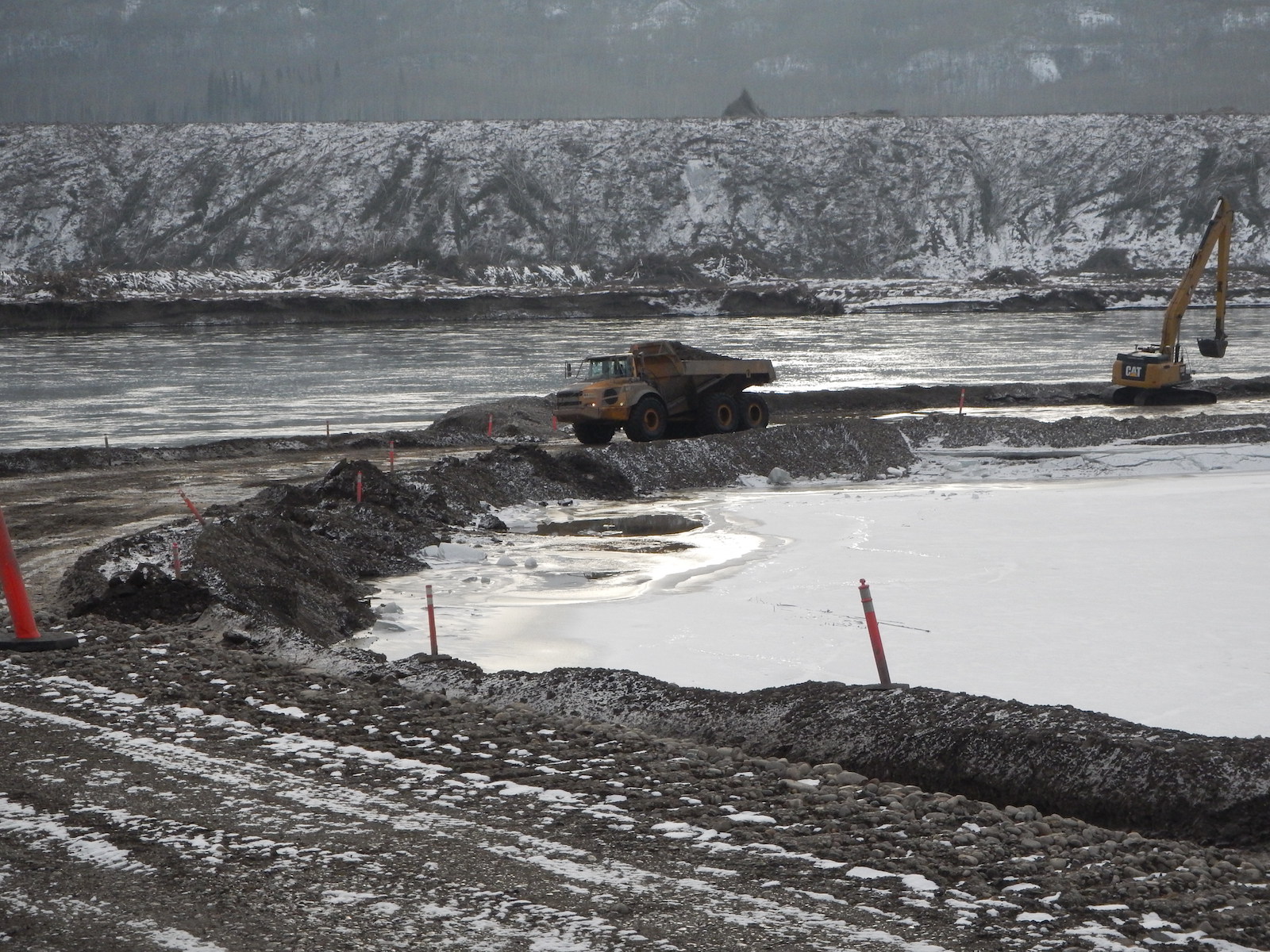 Looking upstream at the causeway for a storage area for relocated excavated material on the north bank. (November 2016)