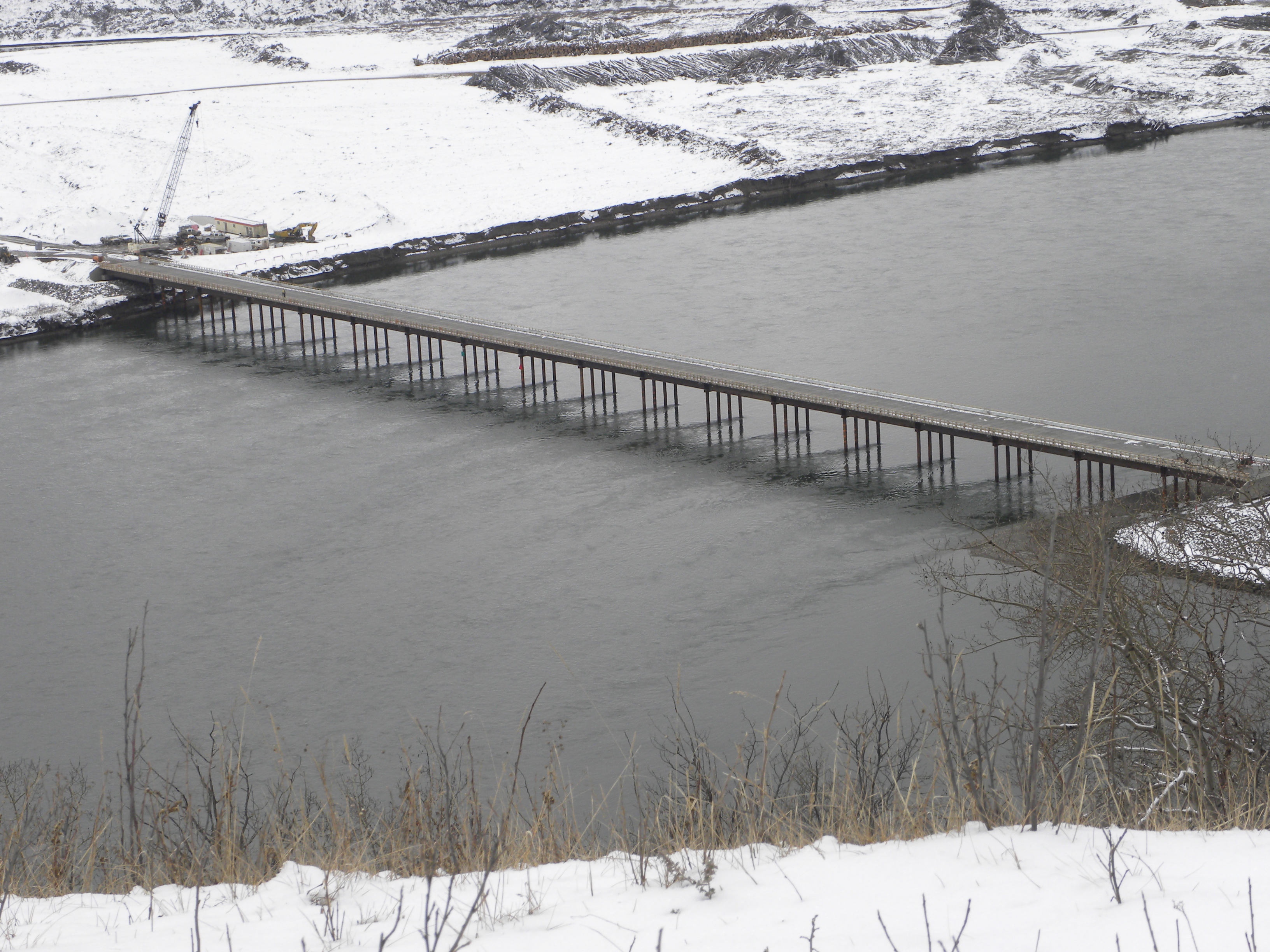 The 329-metre-long bridge built for transporting people, machinery and materials across the Peace River. (March 2016)