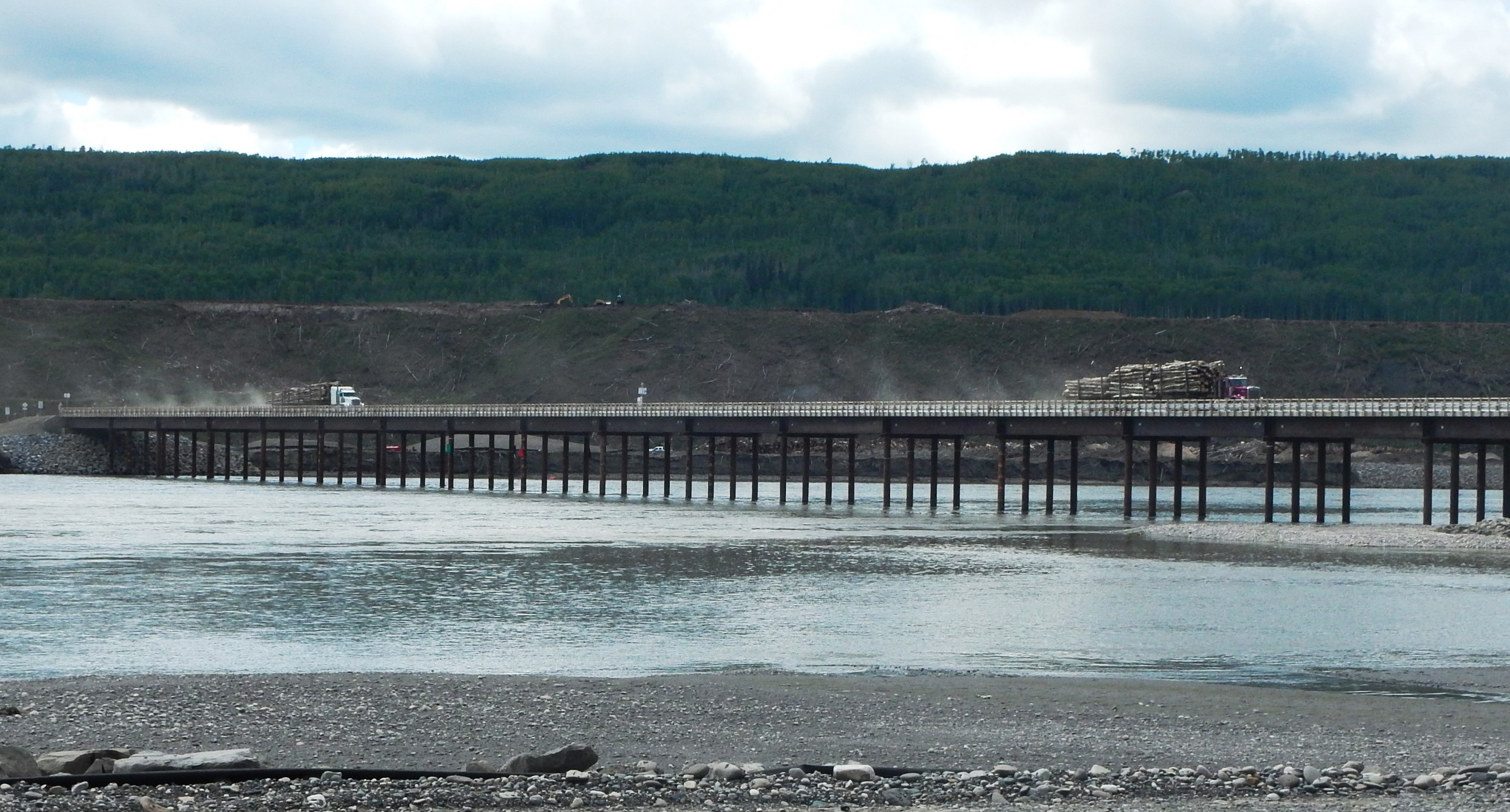 Logging trucks hauling timber from the dam site on the temporary construction access bridge. (May 2016)