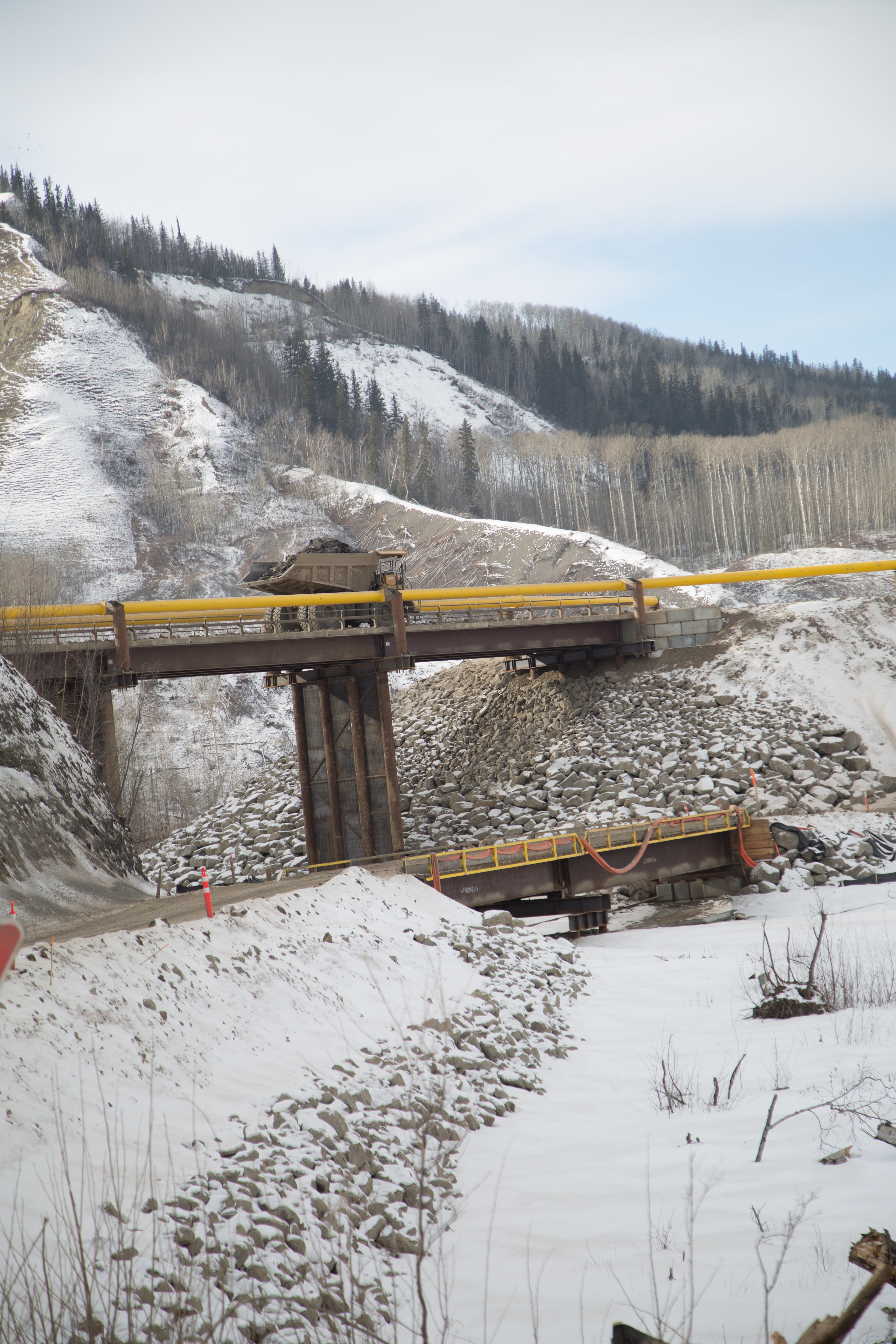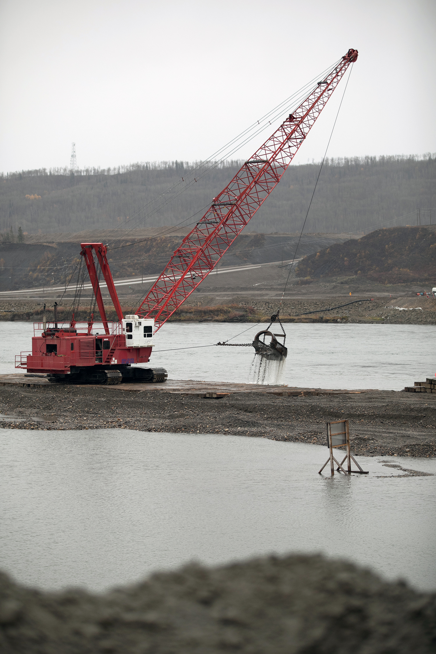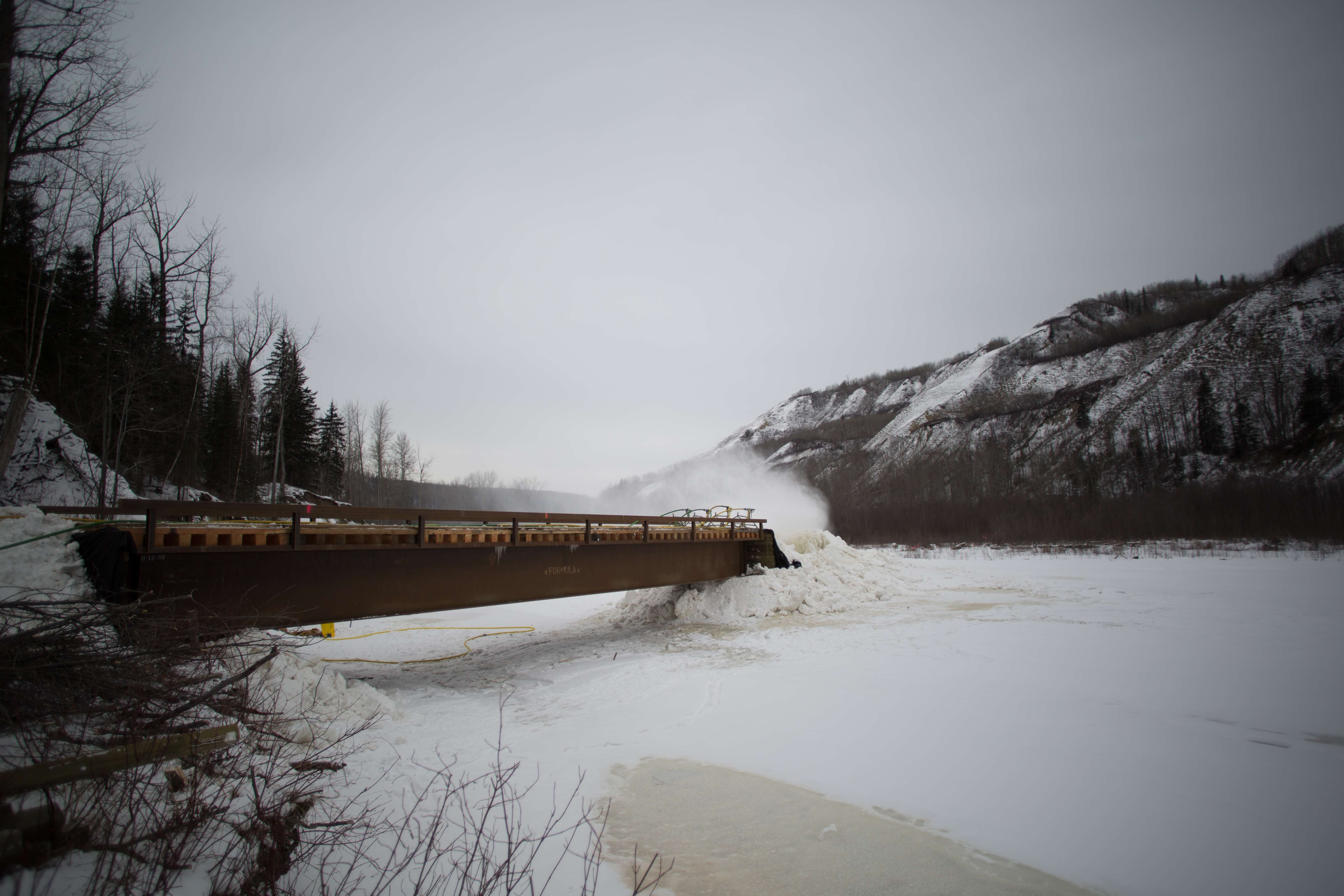 Moving material over the Moberly River construction bridge. (March 2017)