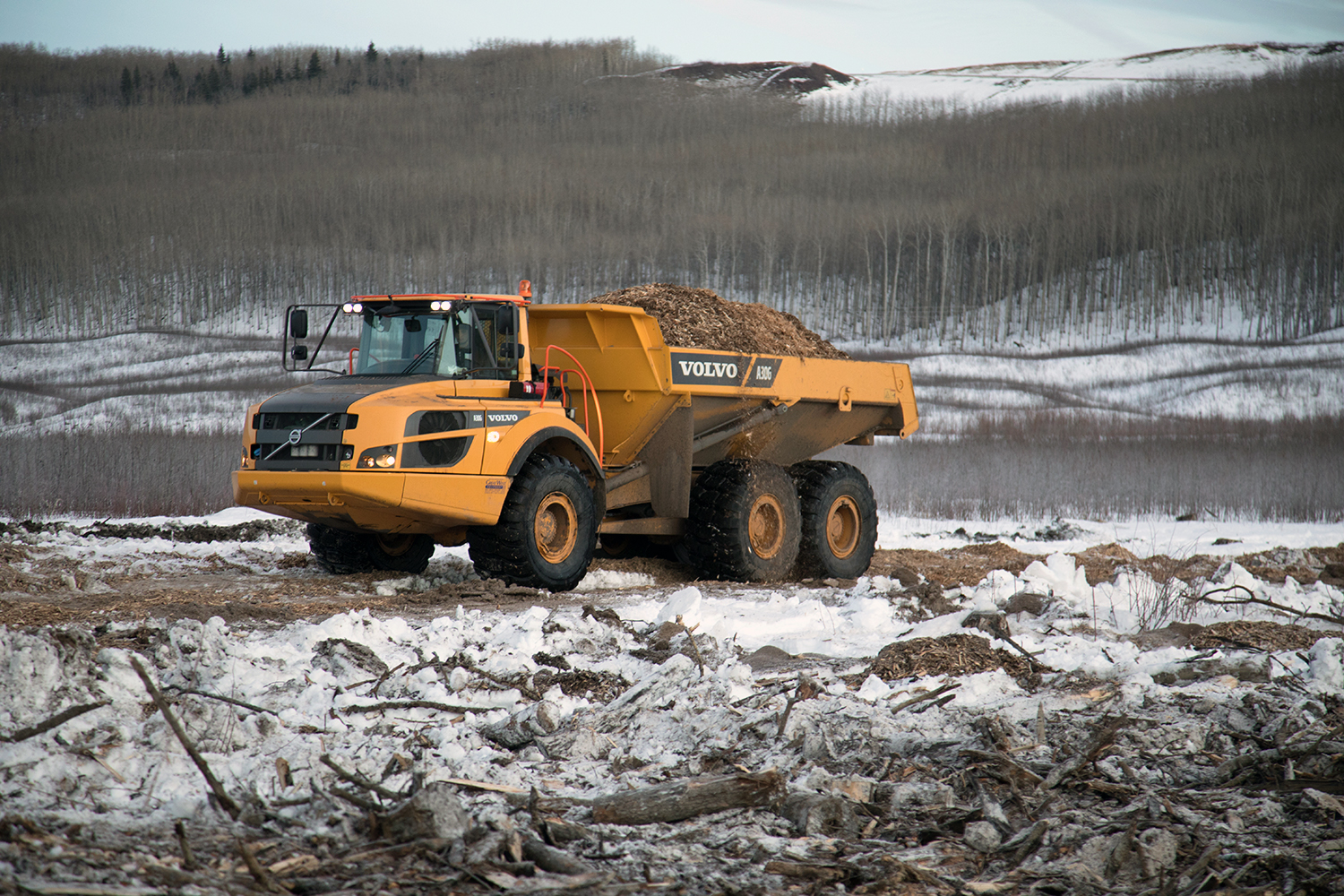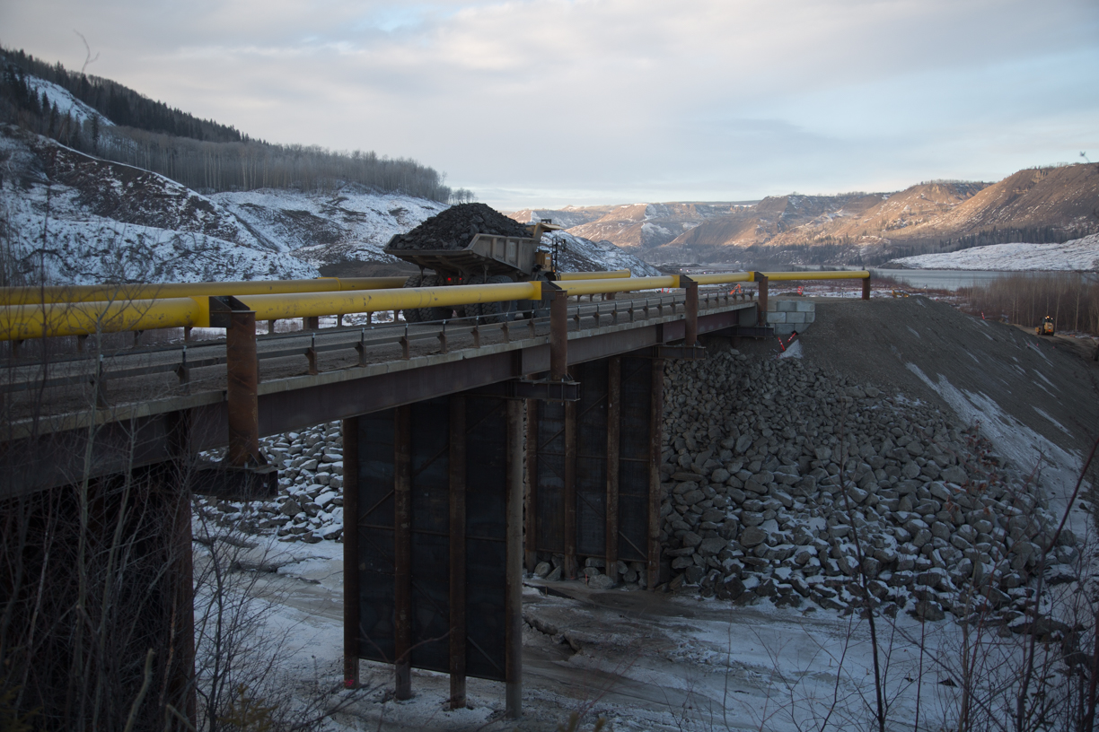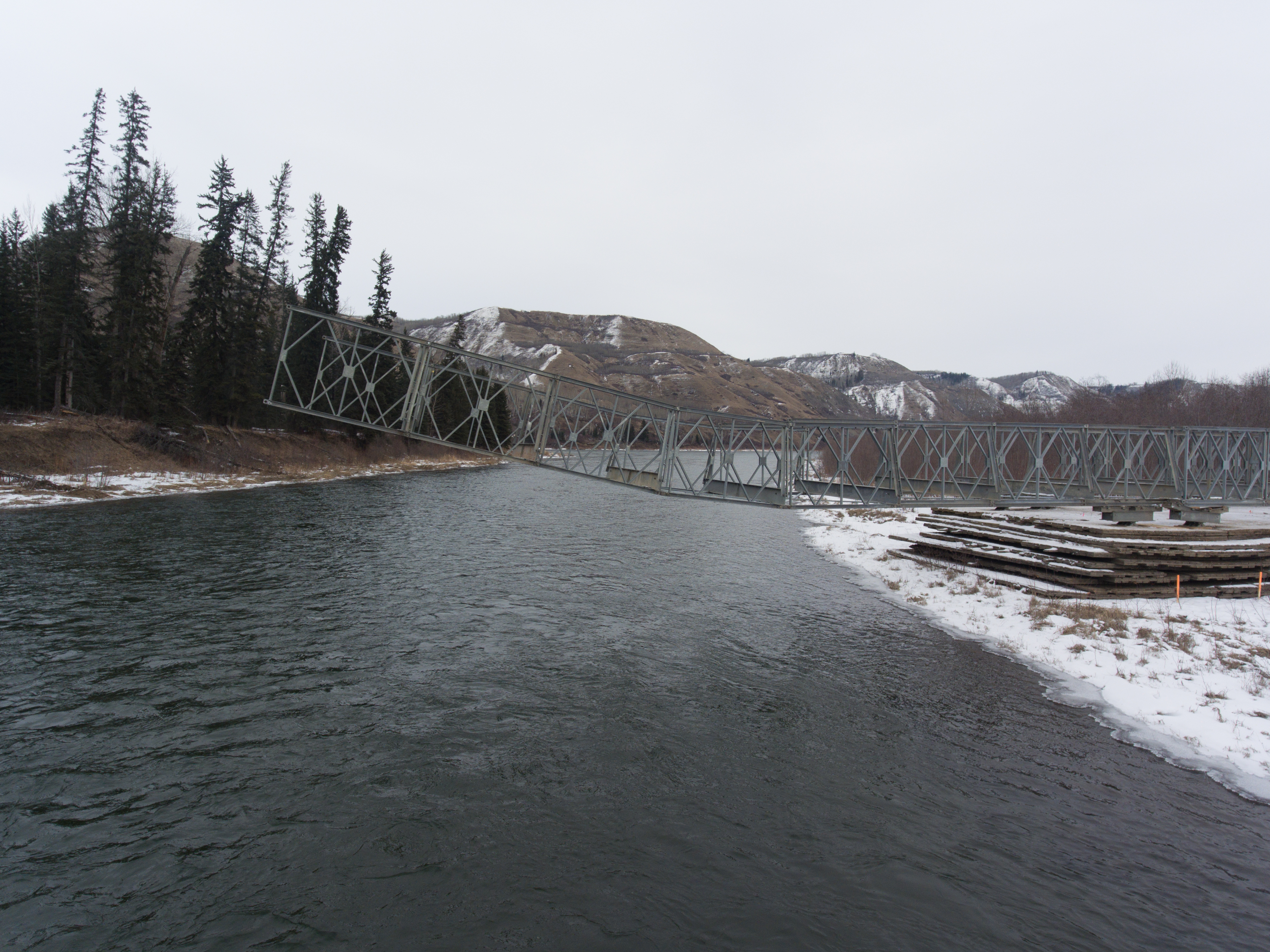 Moving material over the Moberly River construction bridge. (March 2017)