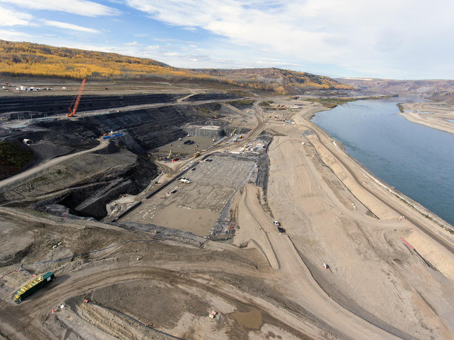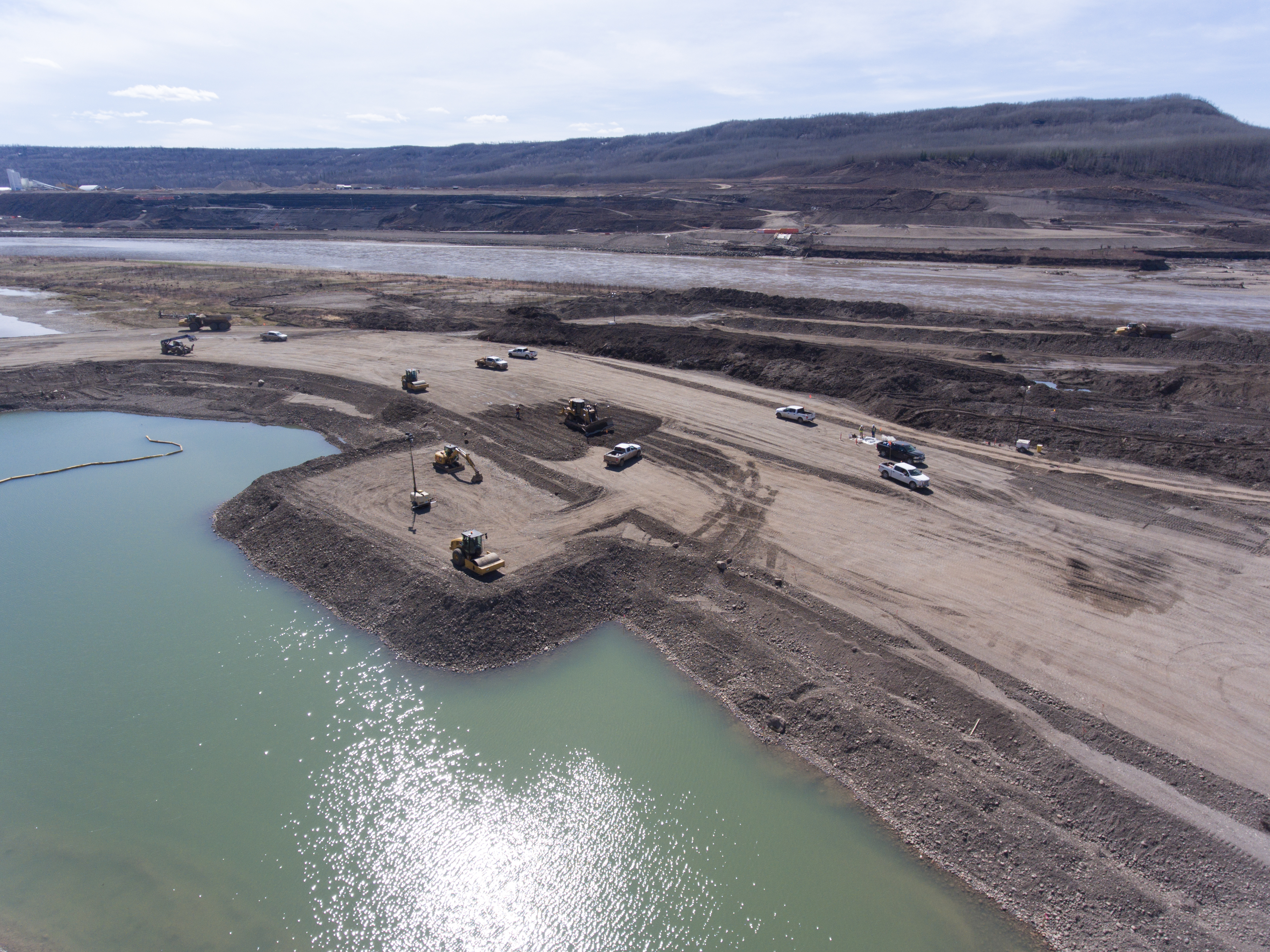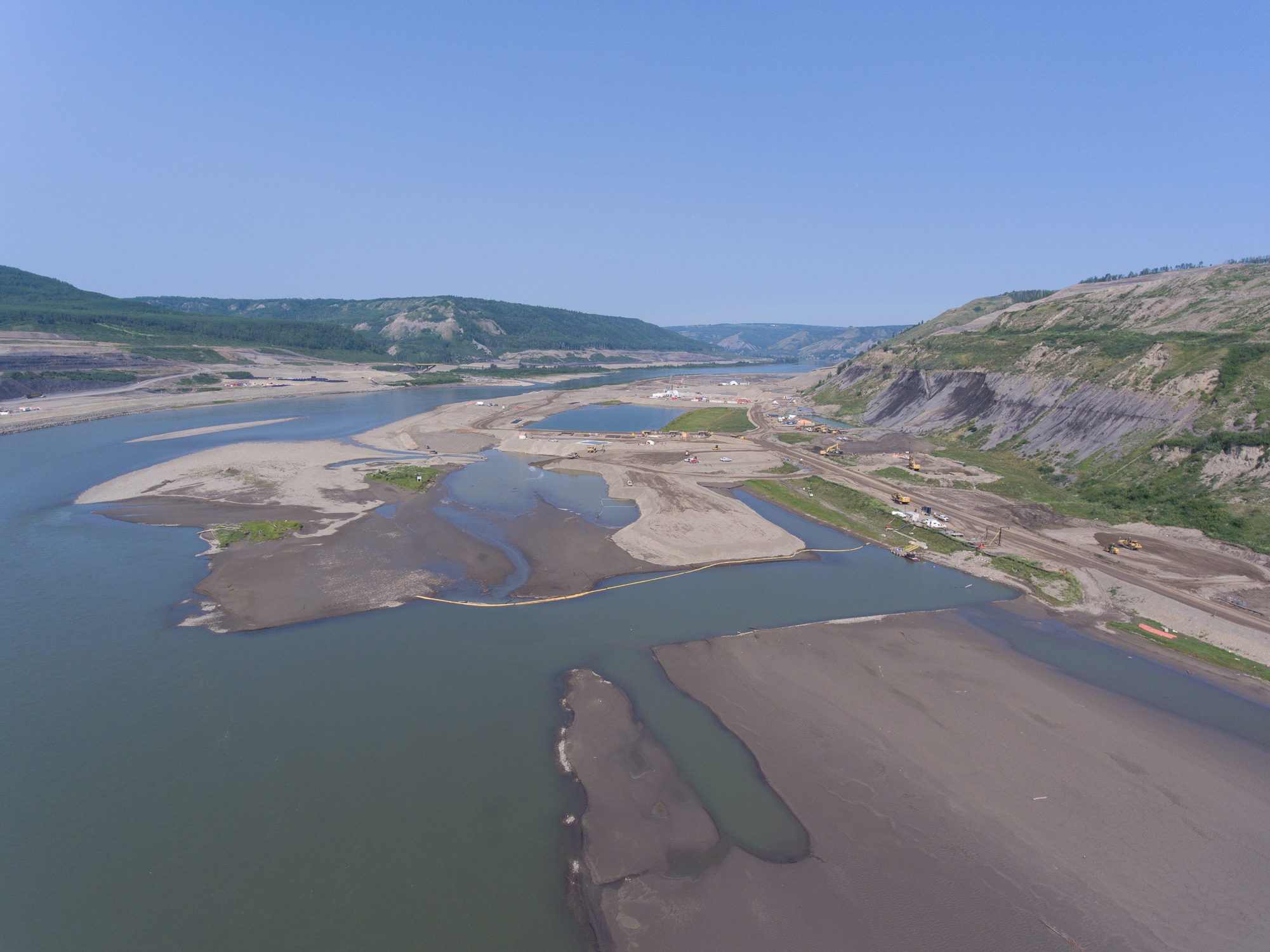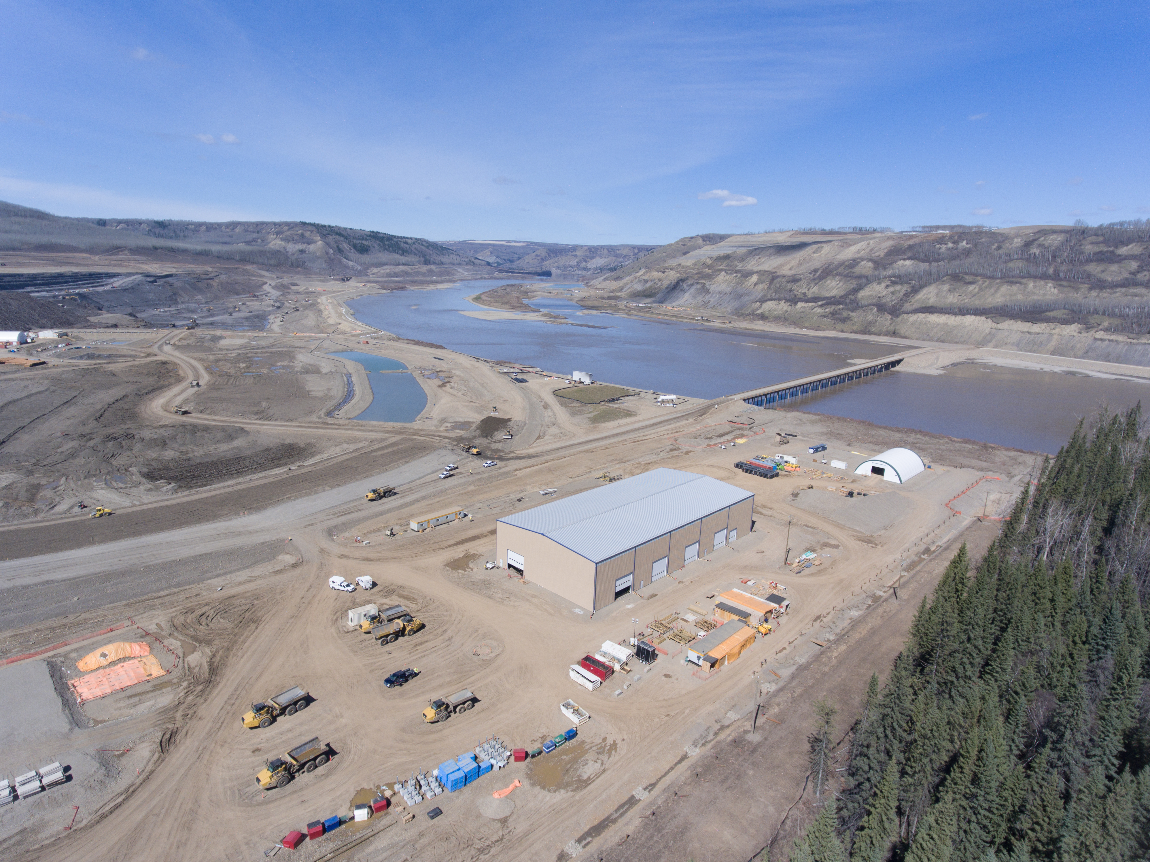 Aerial view of the inlet cofferdam, the south bank excavation, and Moberly River. (September 2017)