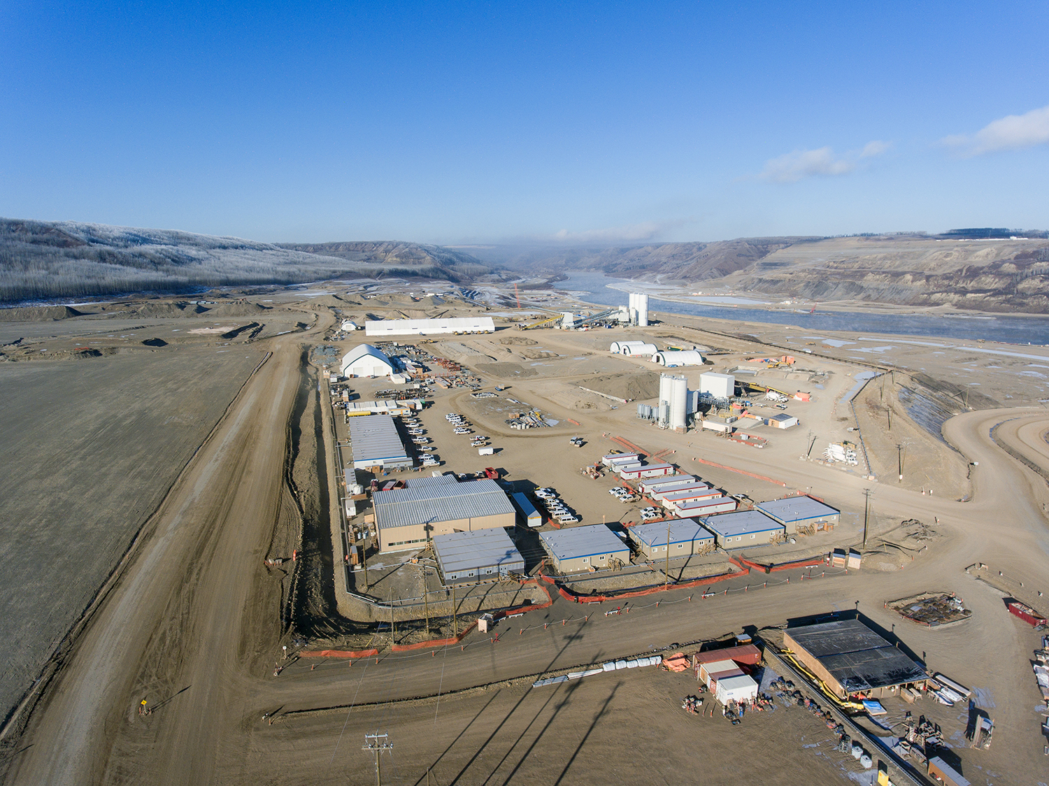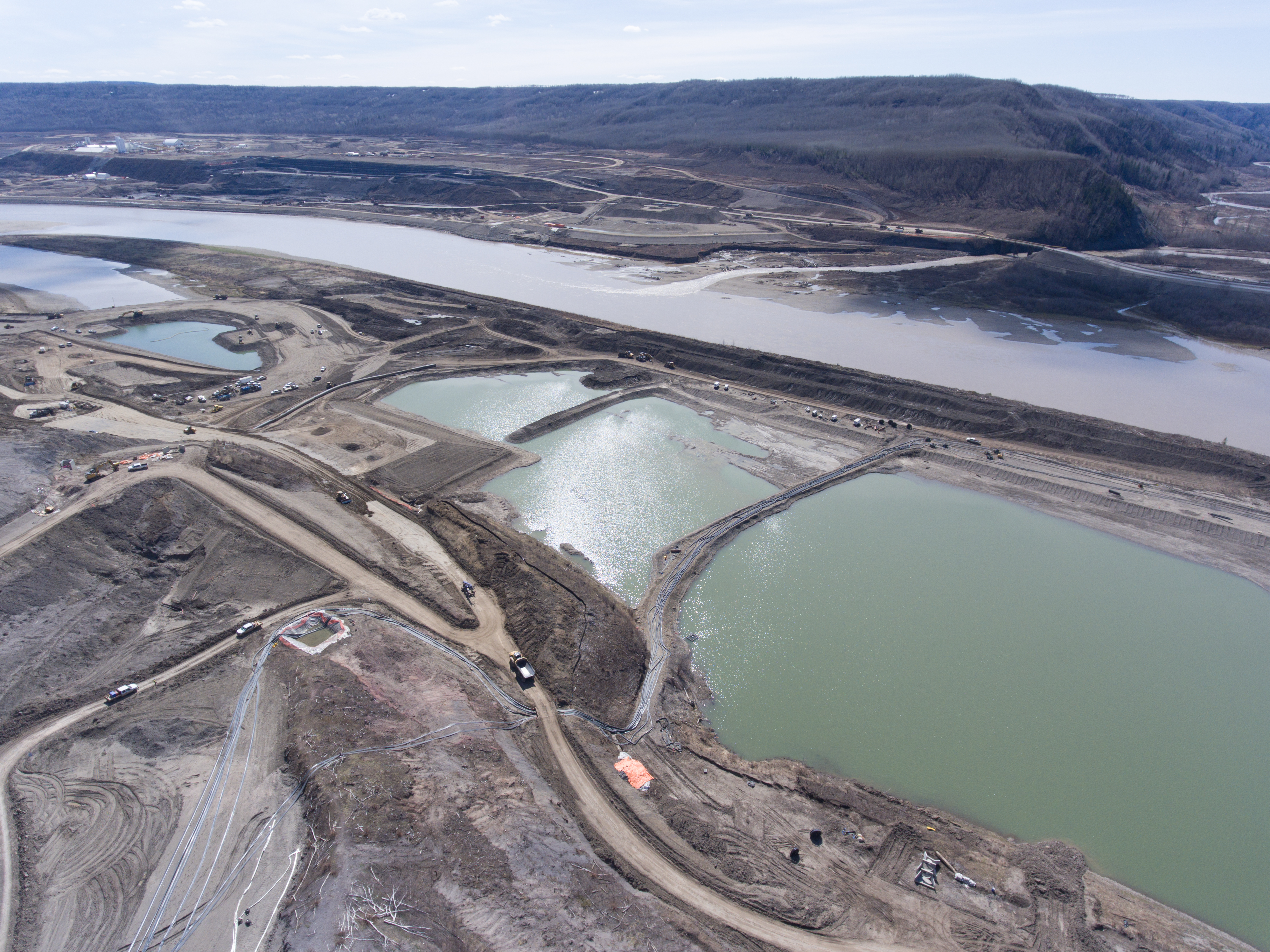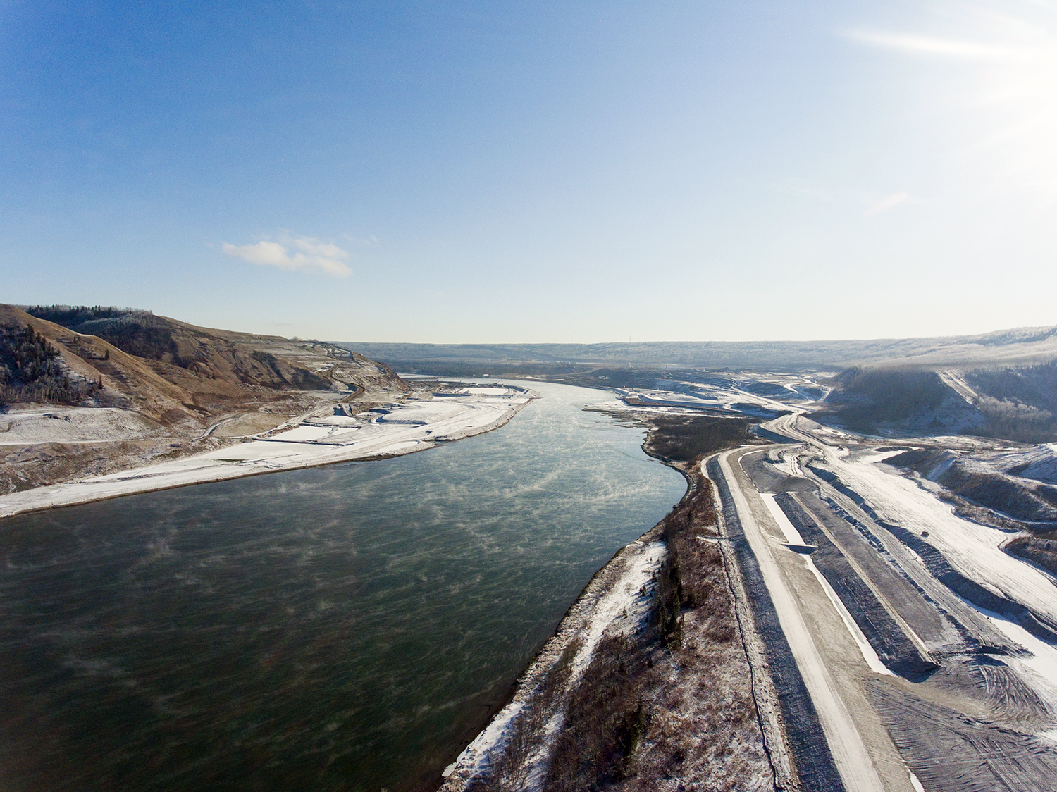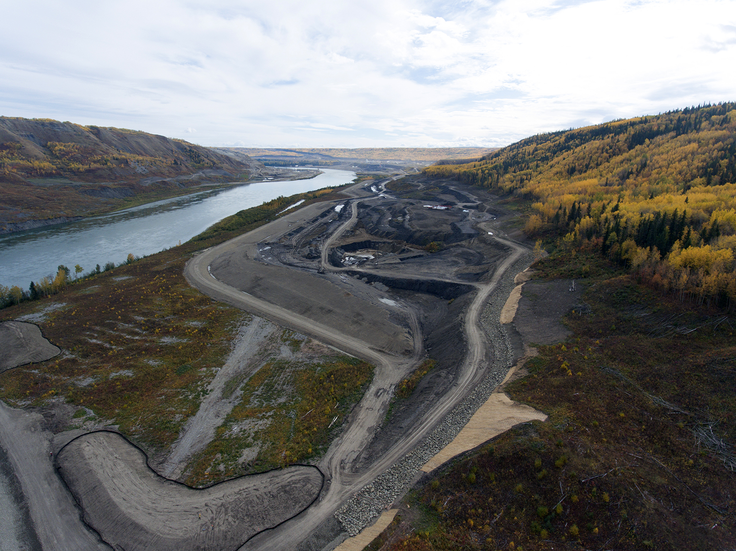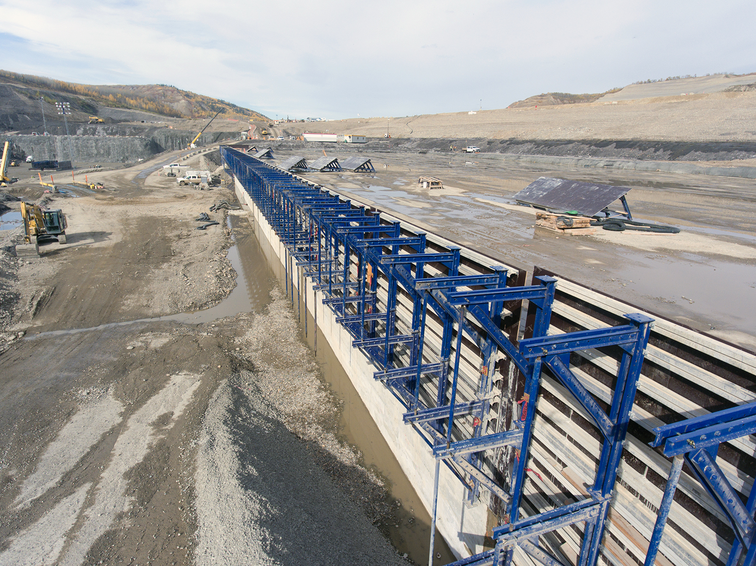 Aerial view of the inlet cofferdam, the south bank excavation, and Moberly River. (September 2017)