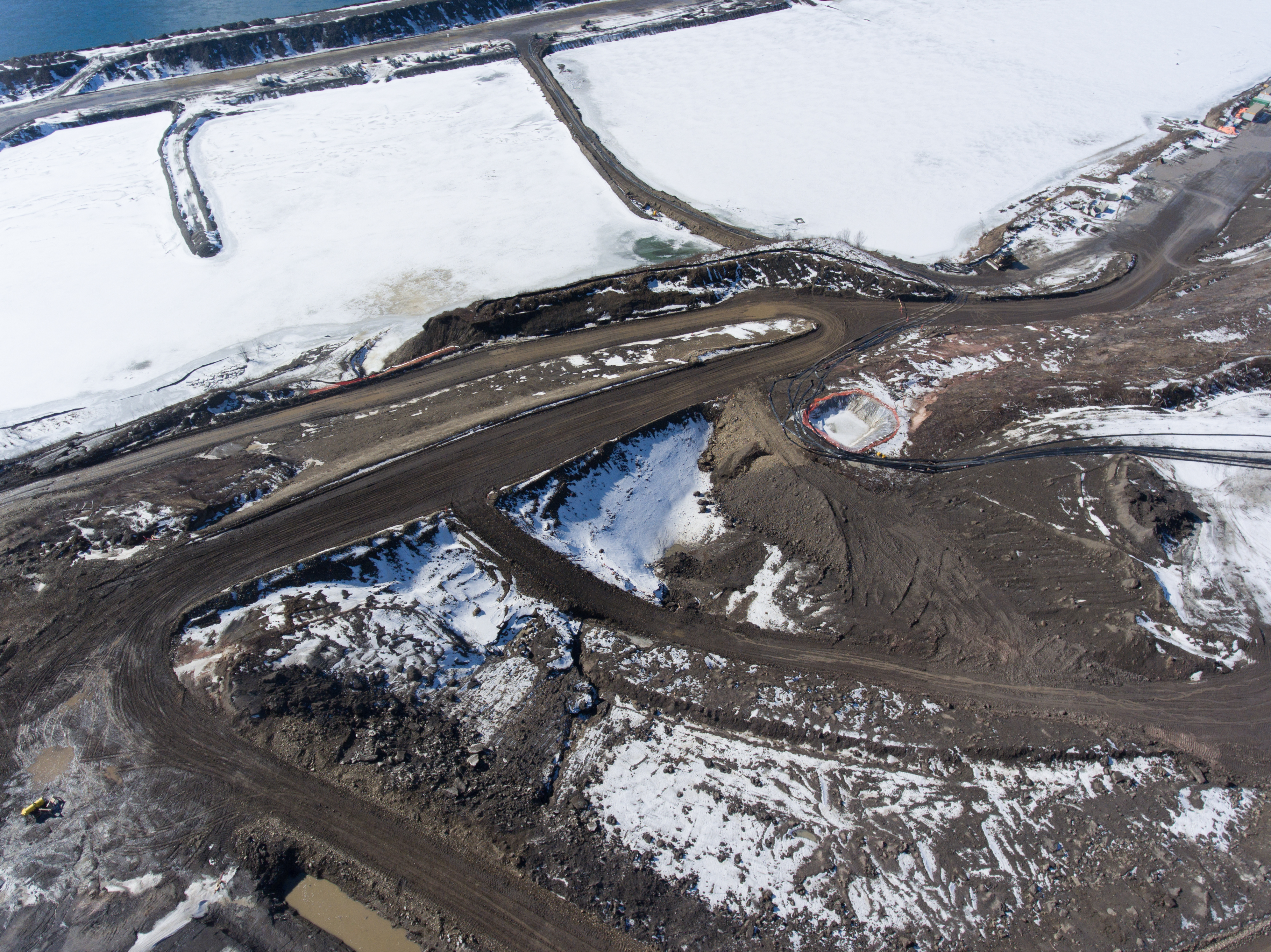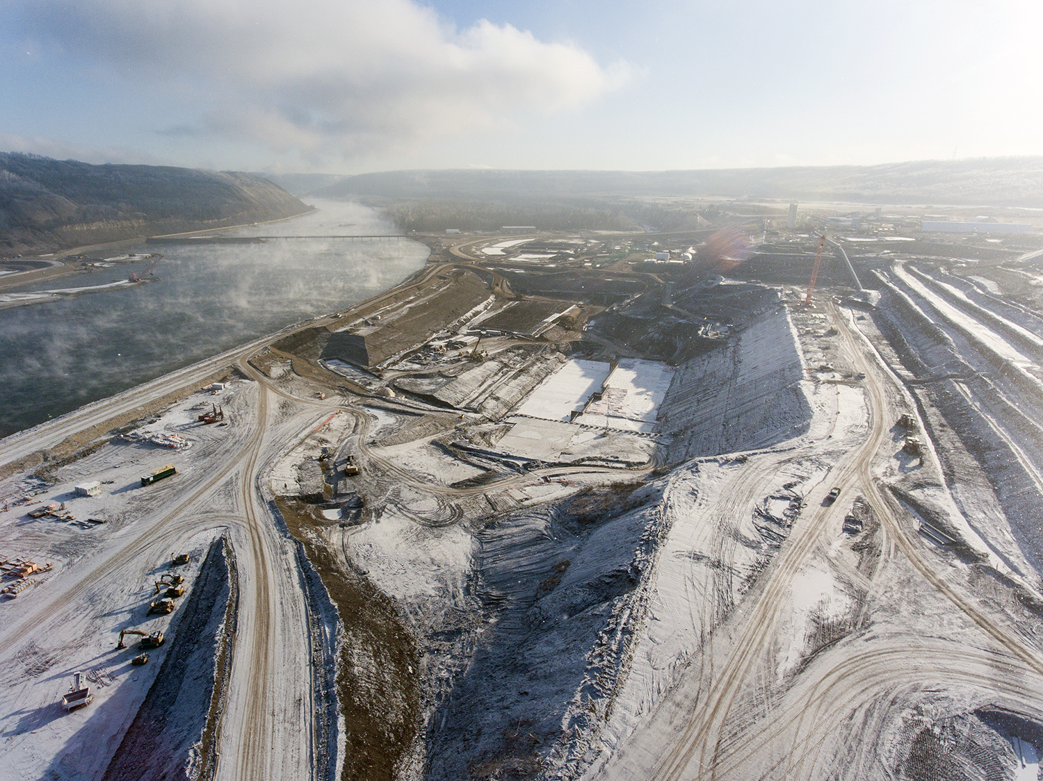 Aerial view of the north bank, with cofferdams and laydown area, looking southeast (November 2017)