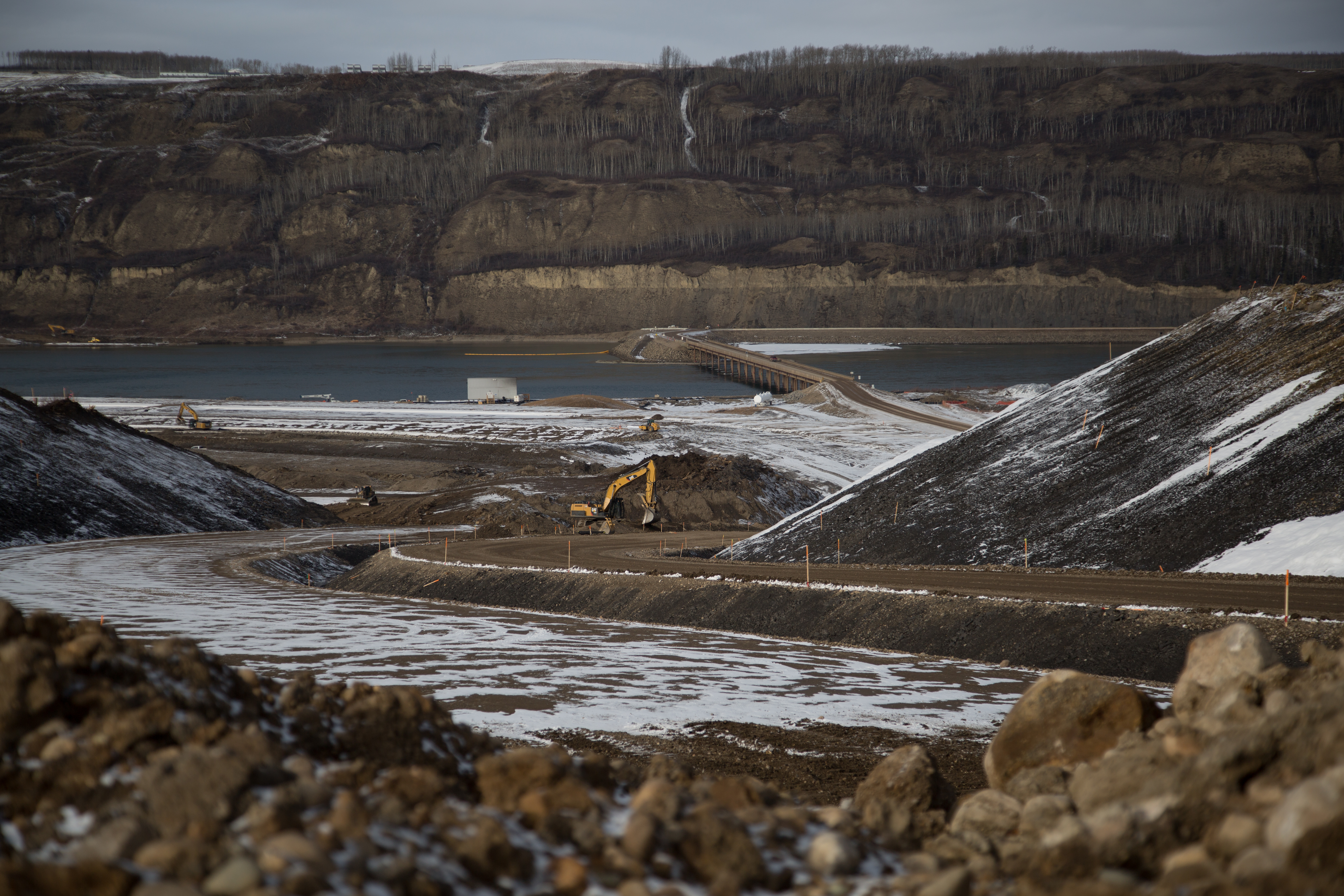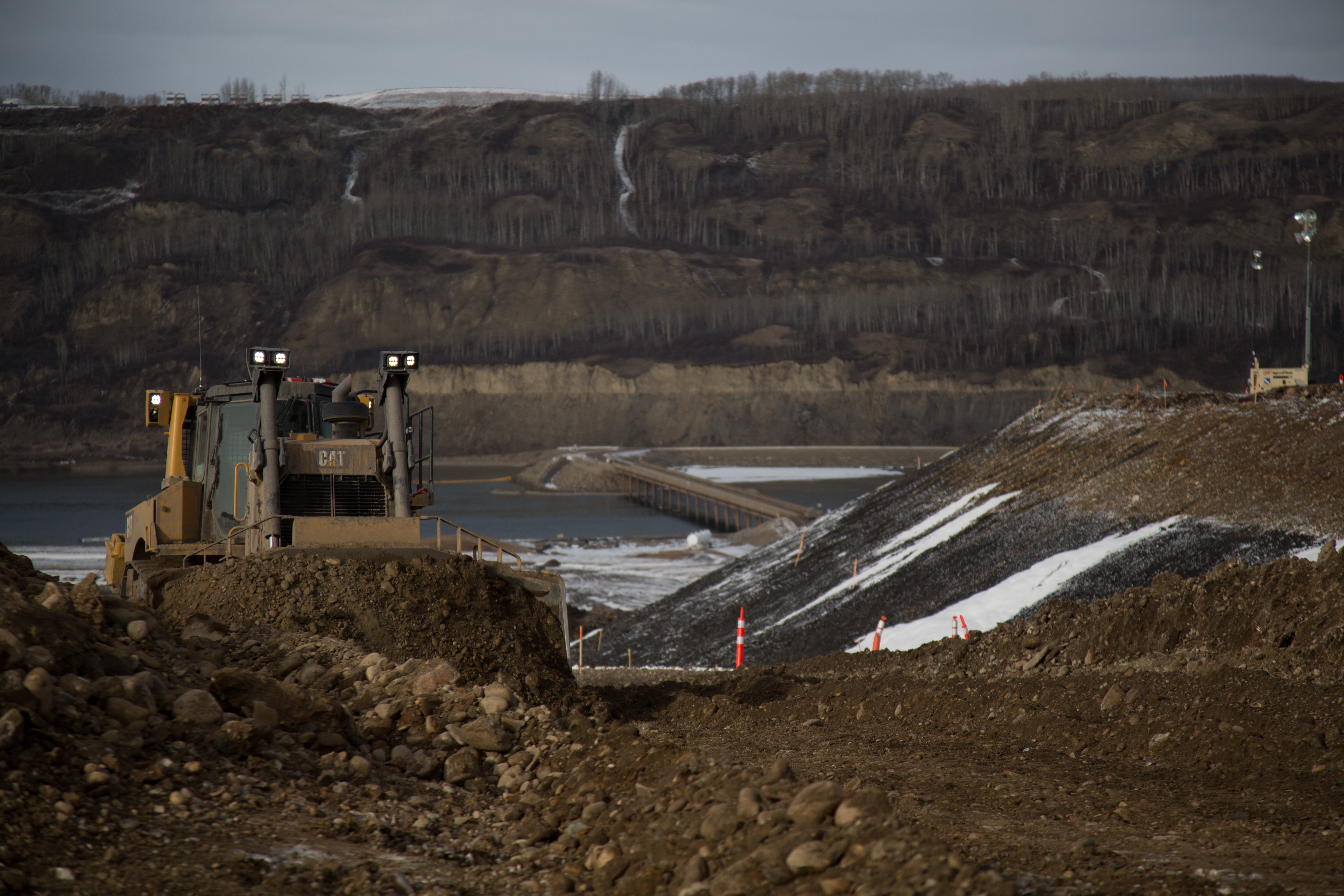 Construction of the toe berm to remediate the tension crack on the north bank. (March 2017)