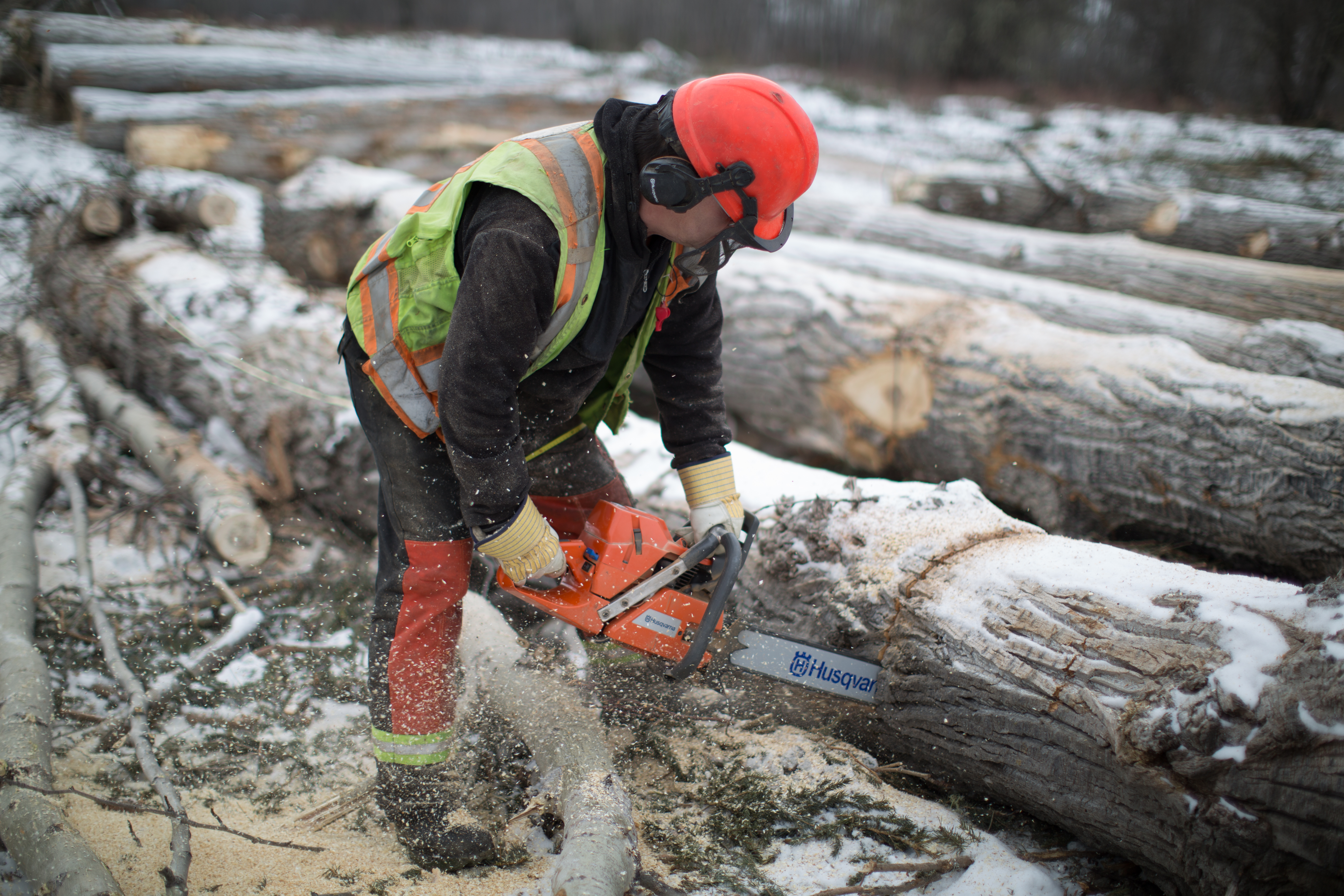 Worker cutting logs for future transport to local mills. (March 2017)